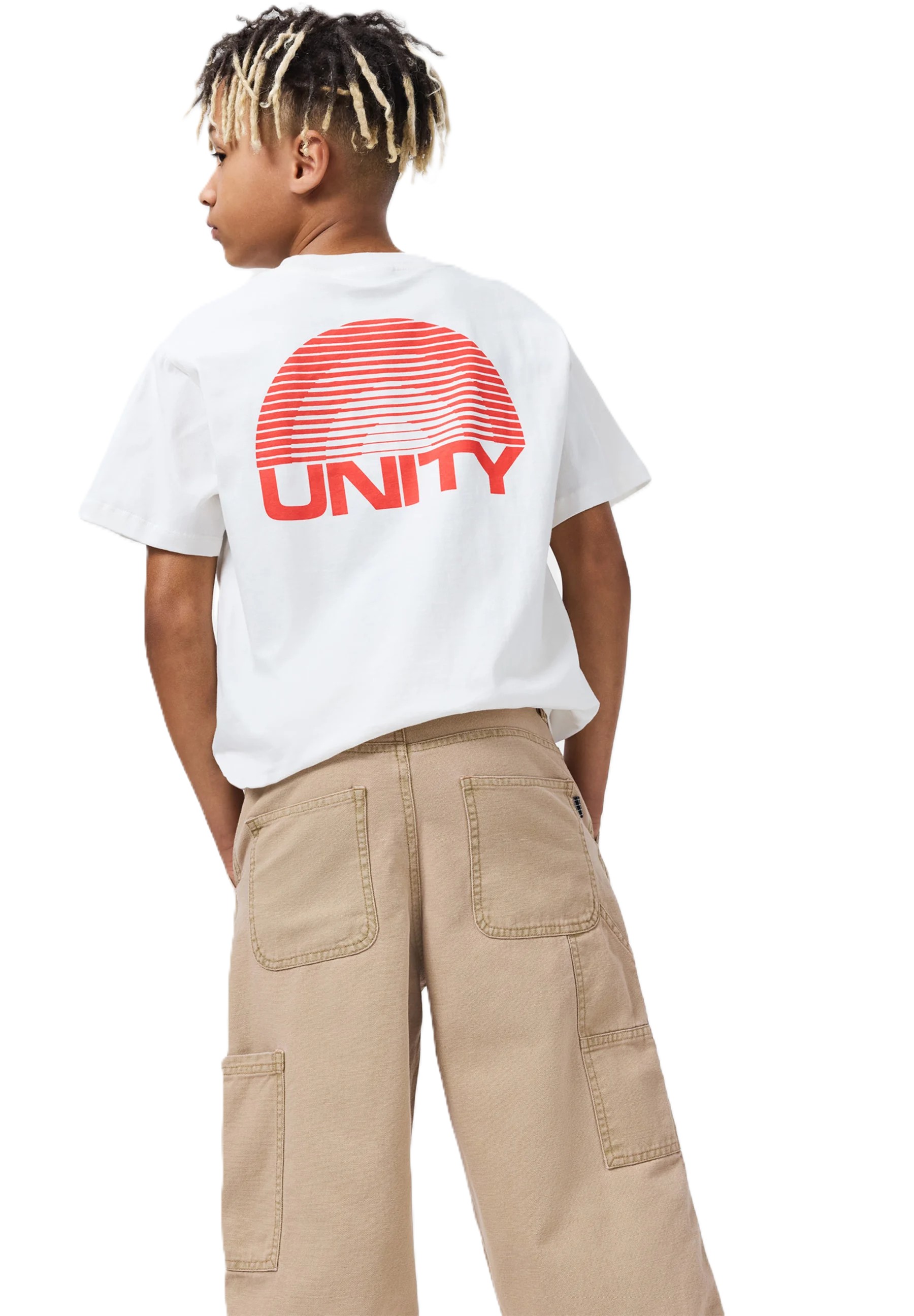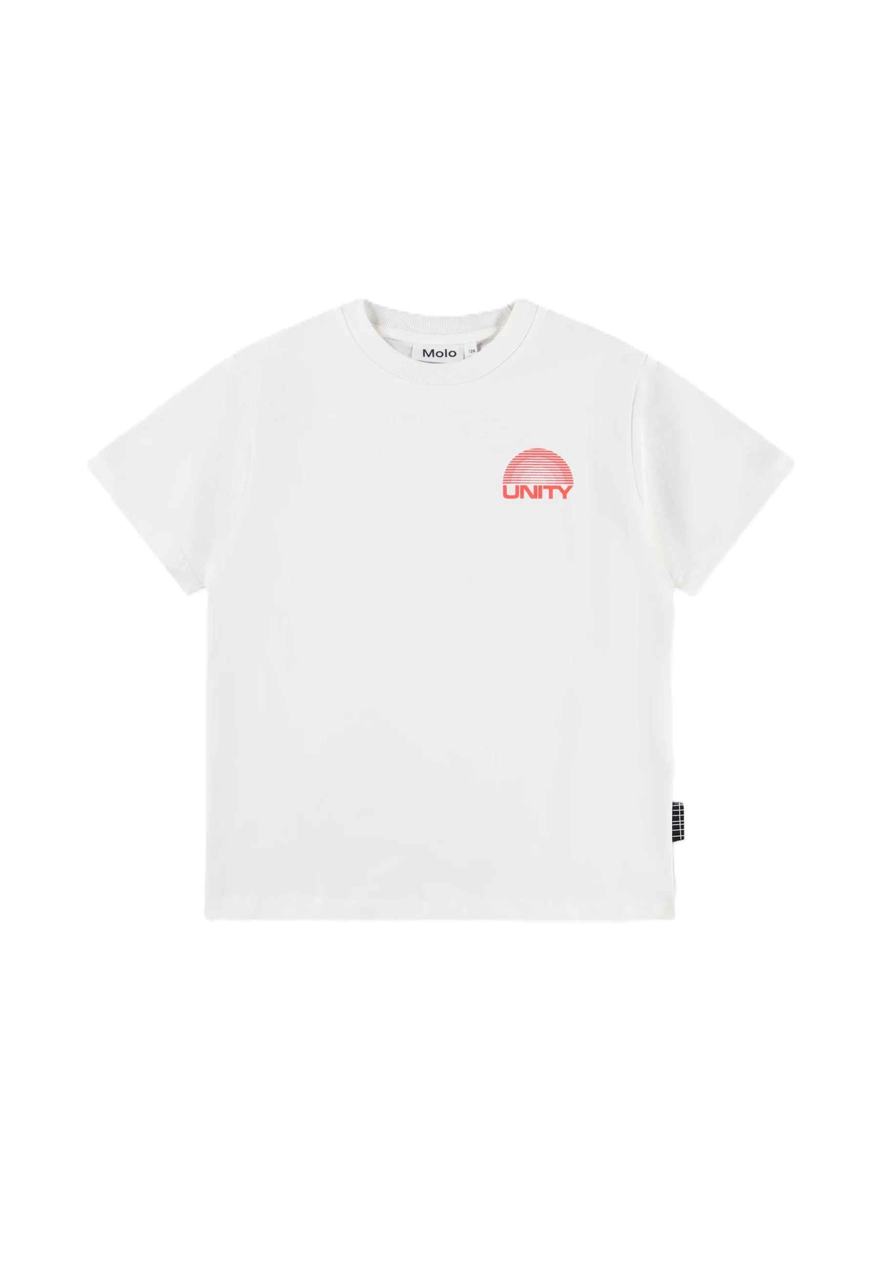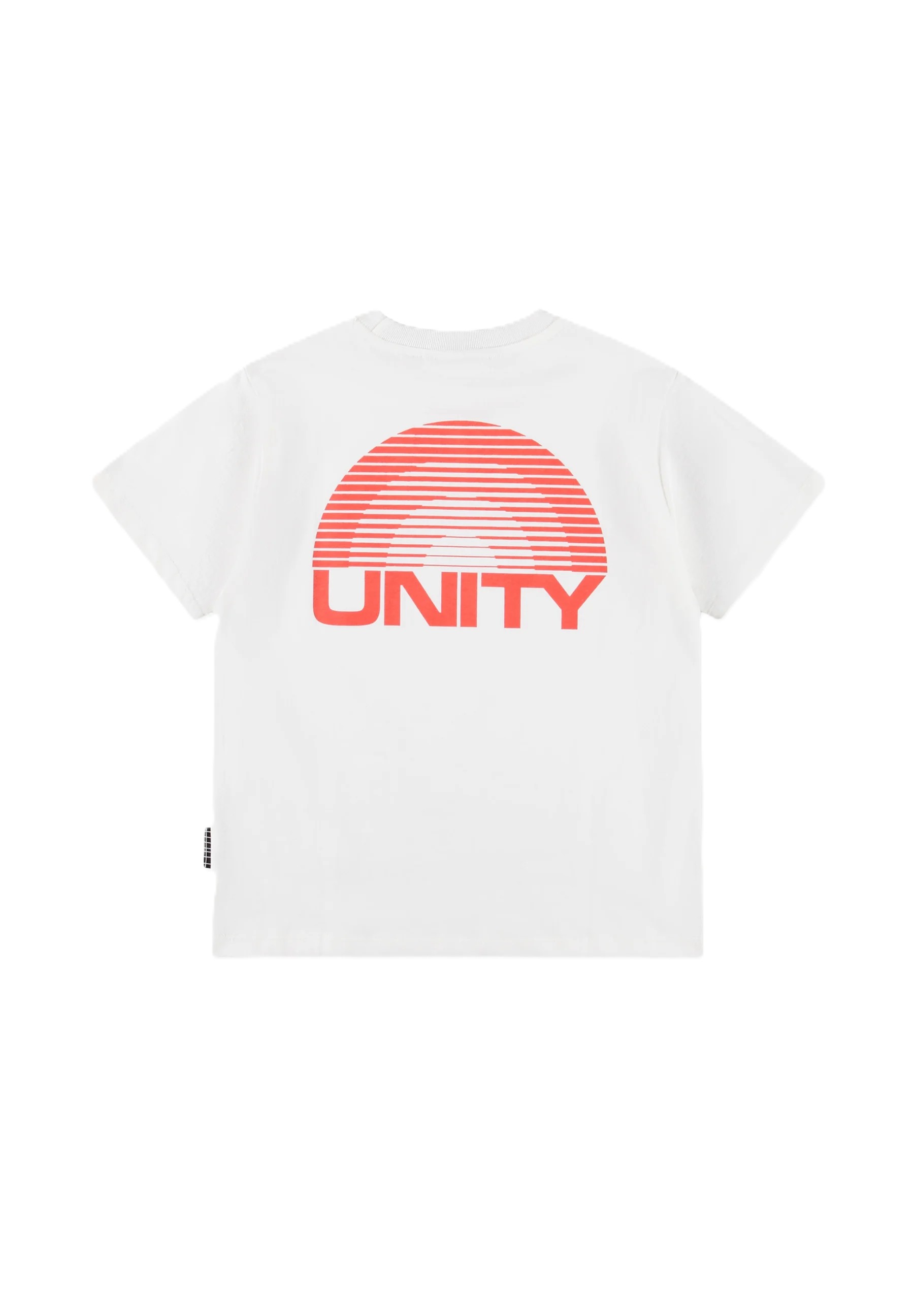 White T-shirt made of soft organic cotton with short sleeves and ribbed neckline. The T-shirt has a loose fit with a print of the text Unity.