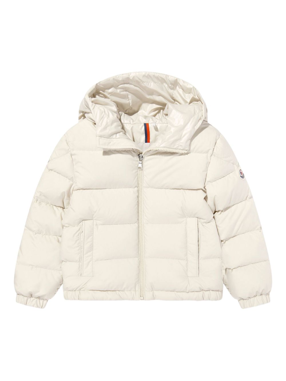 white quilted design hooded neckline zip fastening tricolour-stripe hood detail logo patch
