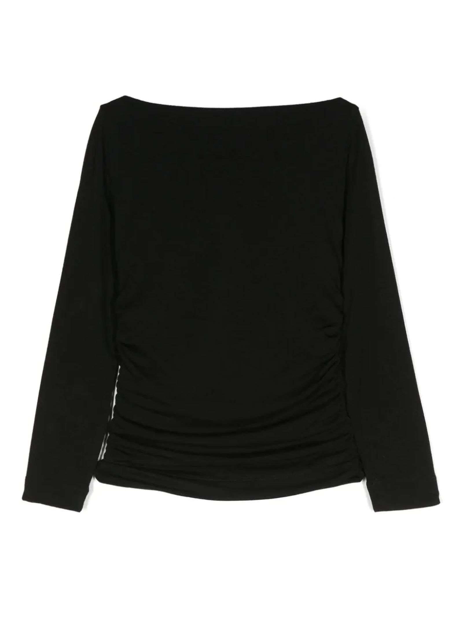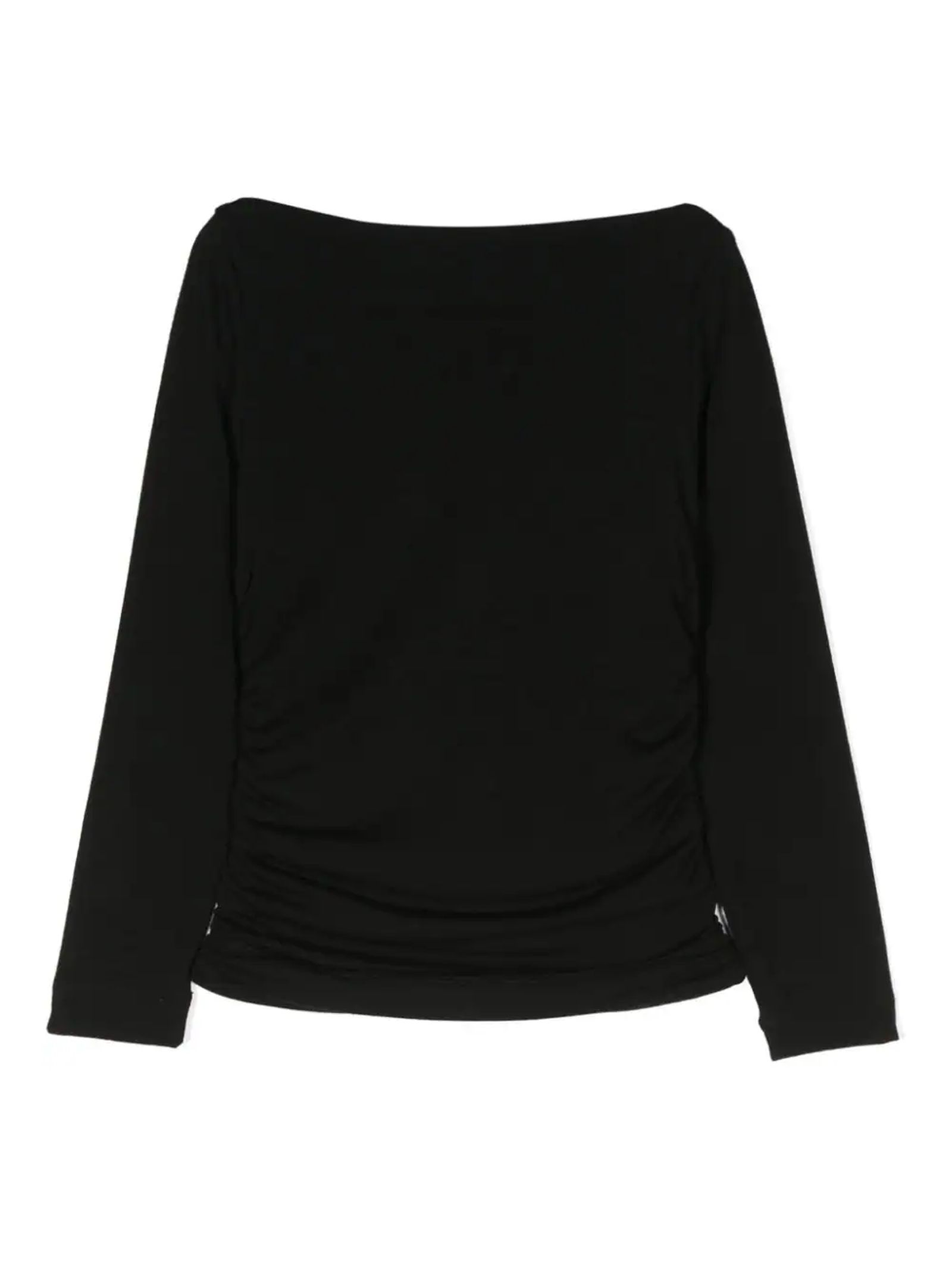 black polyester tshirtjersey weavedetail with rufflessilver logo plaquedraped necklinelong sleevesstraight hem