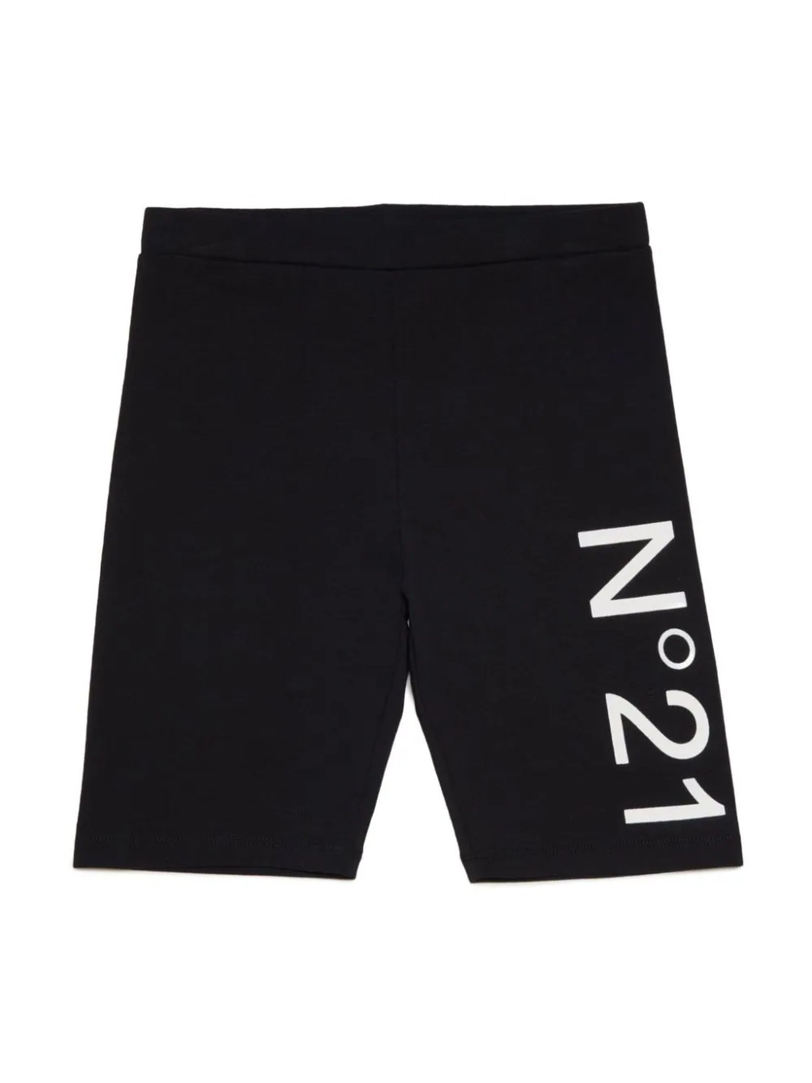 Black stretch-cotton shorts, jersey texture, logo print at the leg, ribbed waistband, knee-length