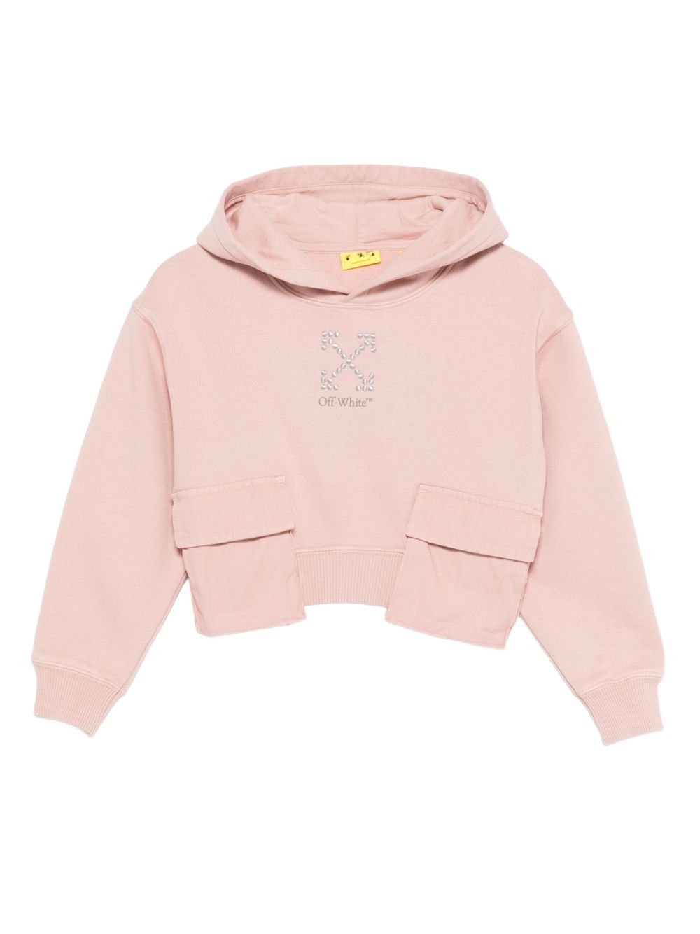 pink hooded neckline cropped hem flap patch pockets logo print long sleeves