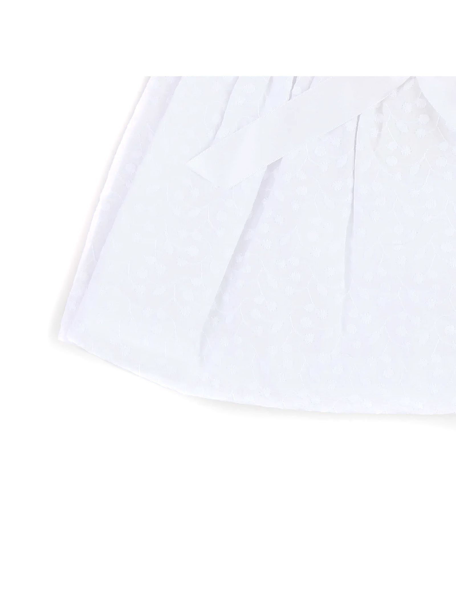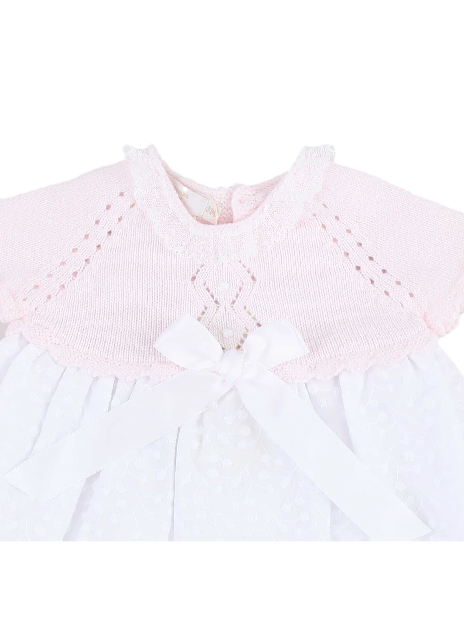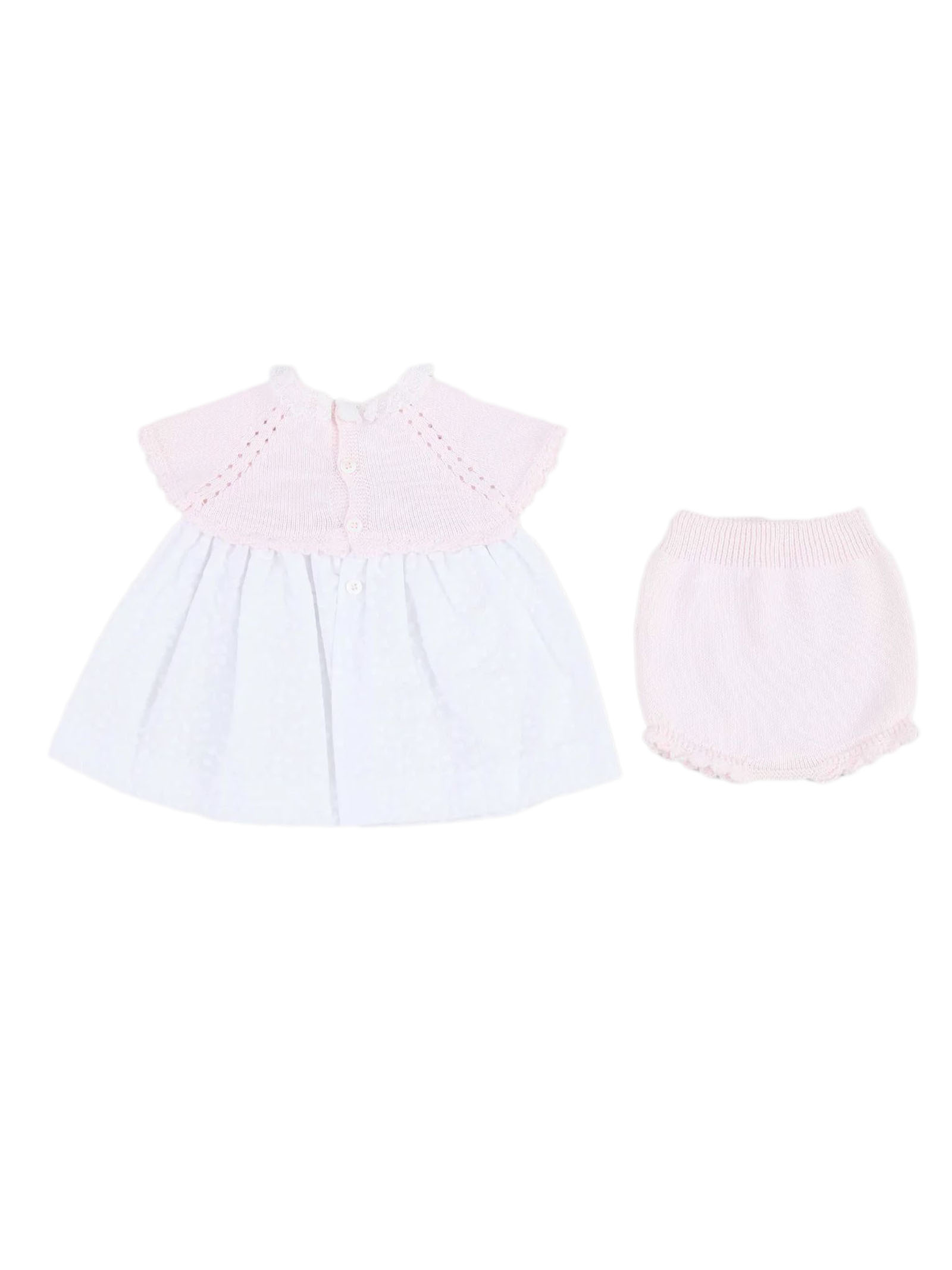 Newborn outfit featuring a dress and bloomers: a pink knit bodice with openwork detailing and a central bow, a light white cotton skirt, matching pink knit bloomers, back closure with small buttons, and ribbed hem