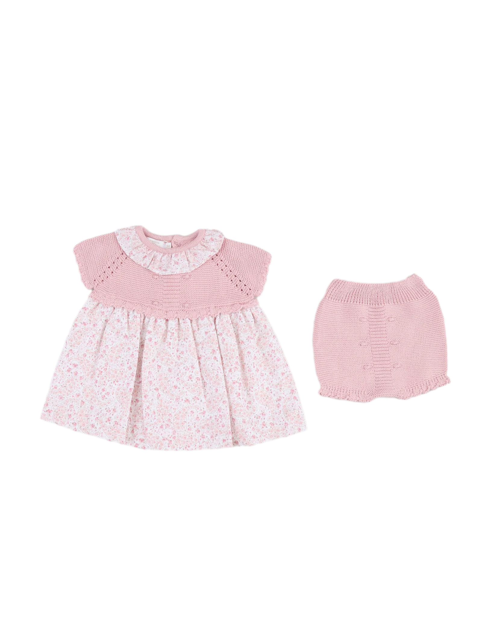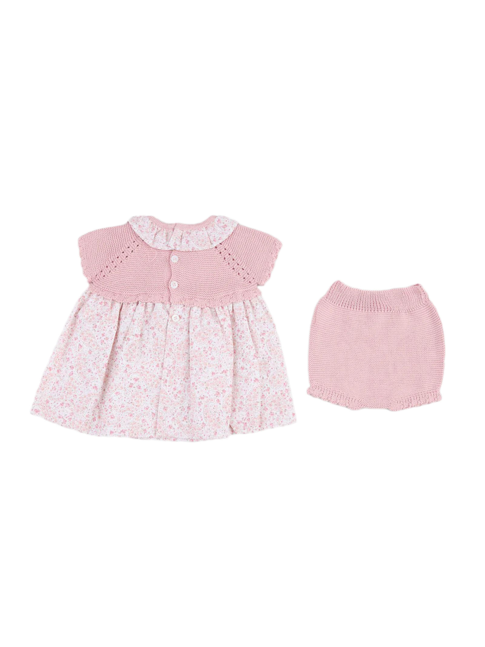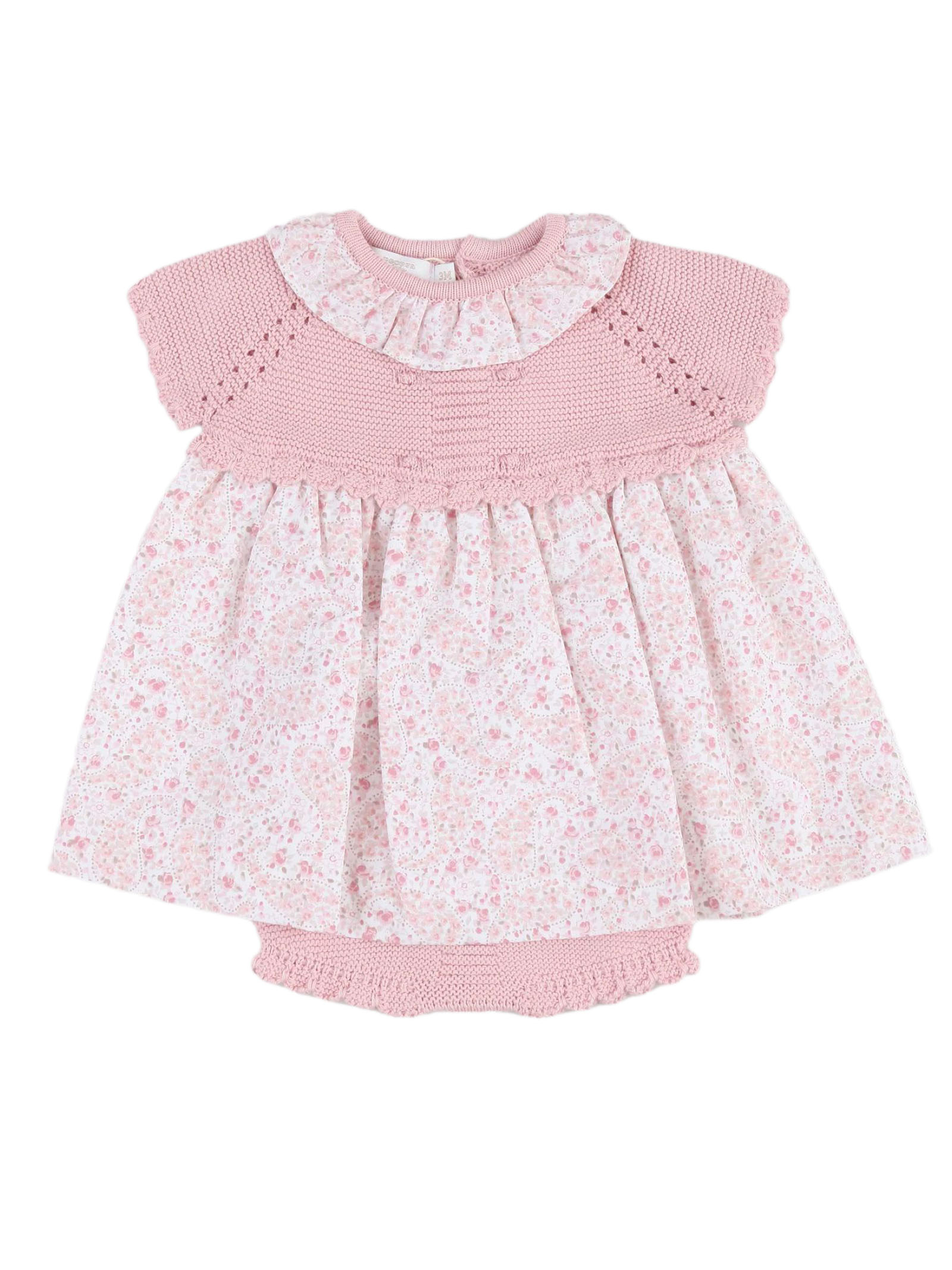 Pink dress with a knit bodice and a lightweight cotton skirt featuring a floral pattern, a Peter Pan collar, and short sleeves