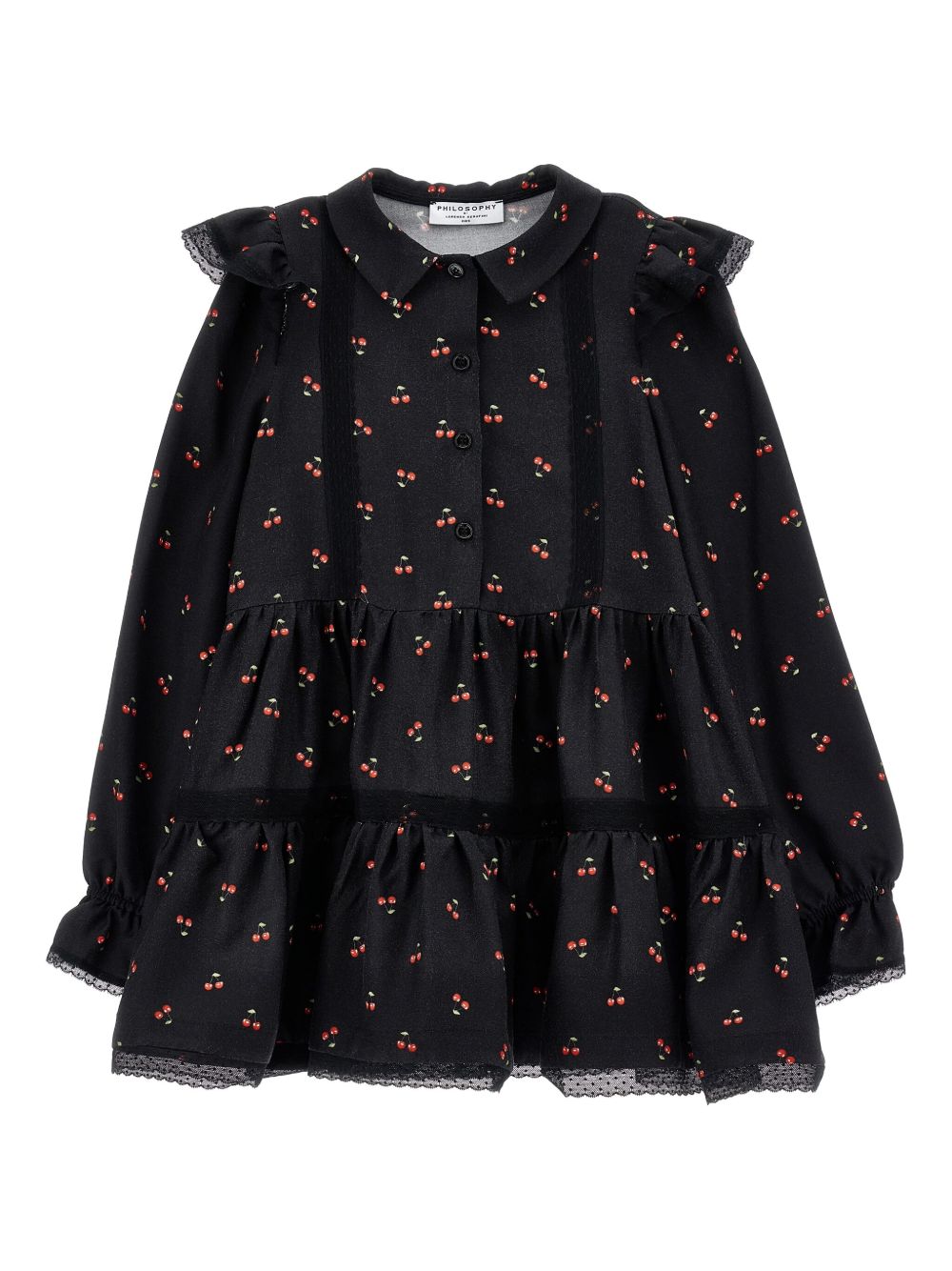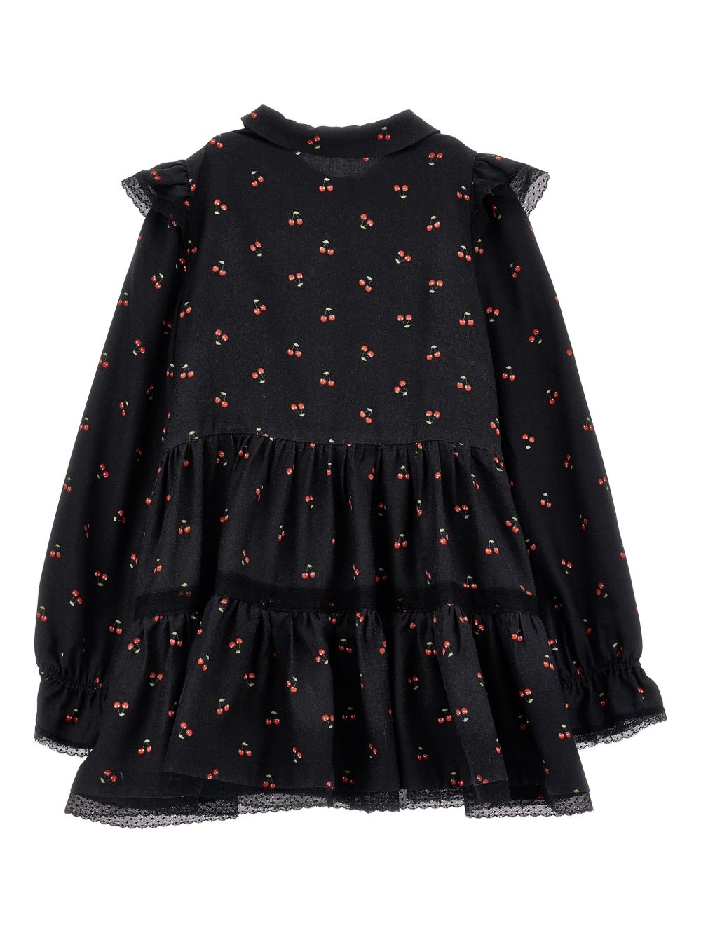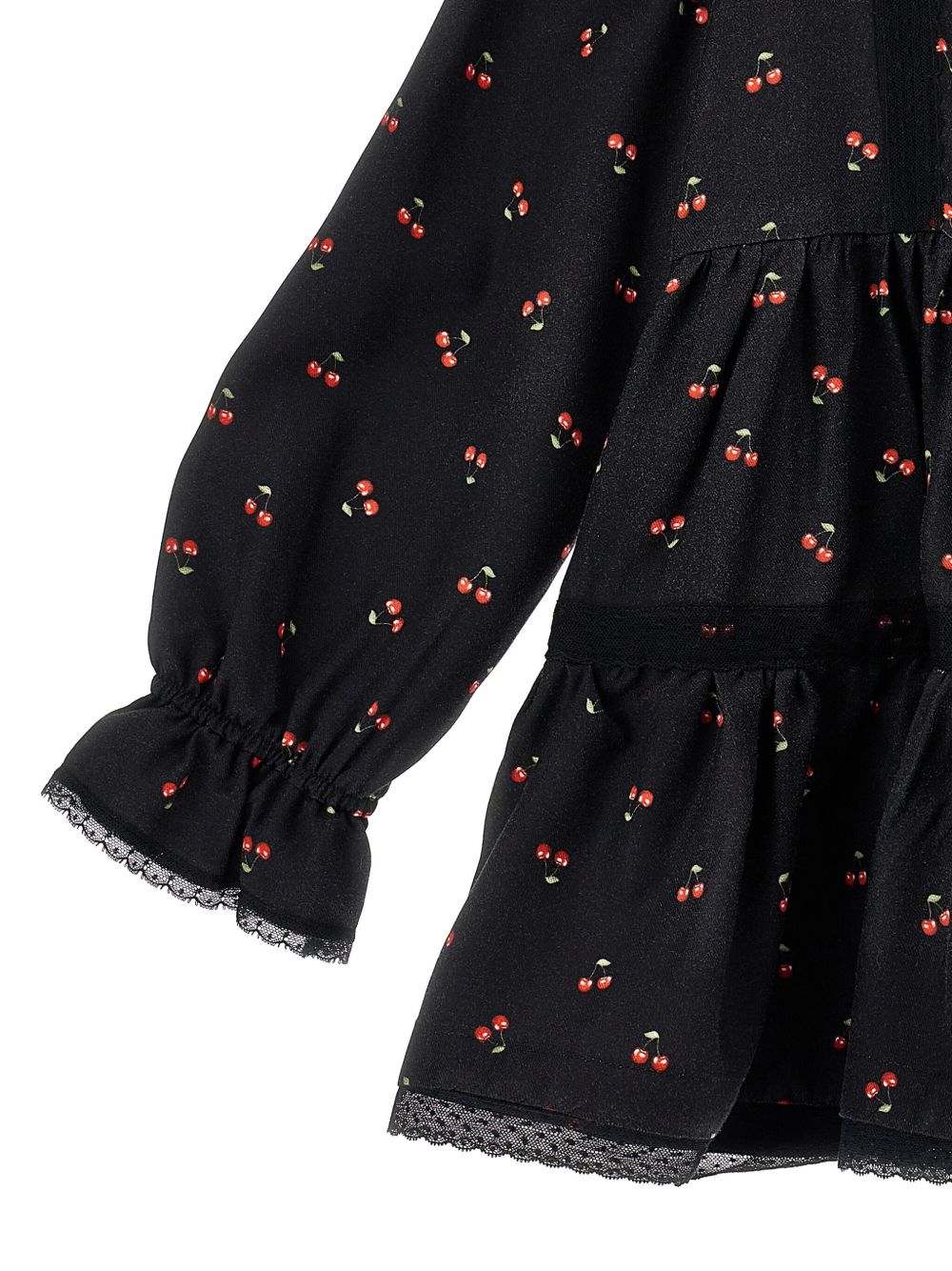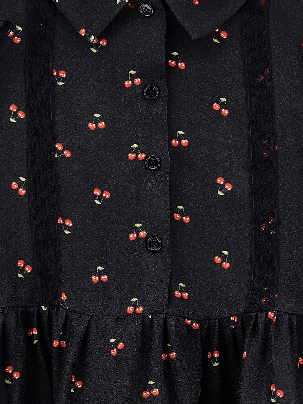 black cherry print ruffled collar button fastening tiered skirt lace trim