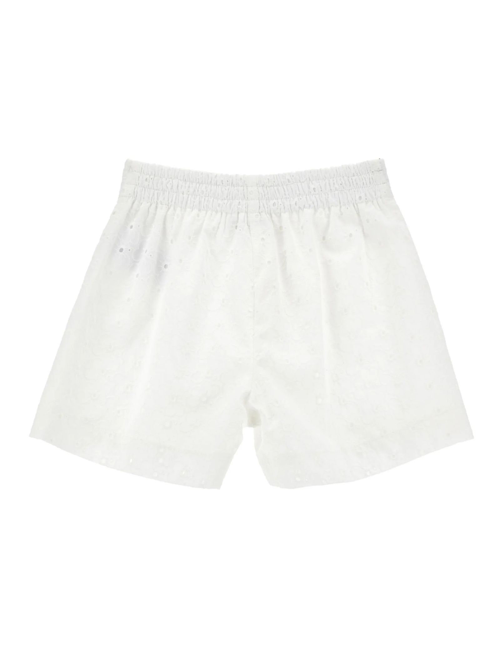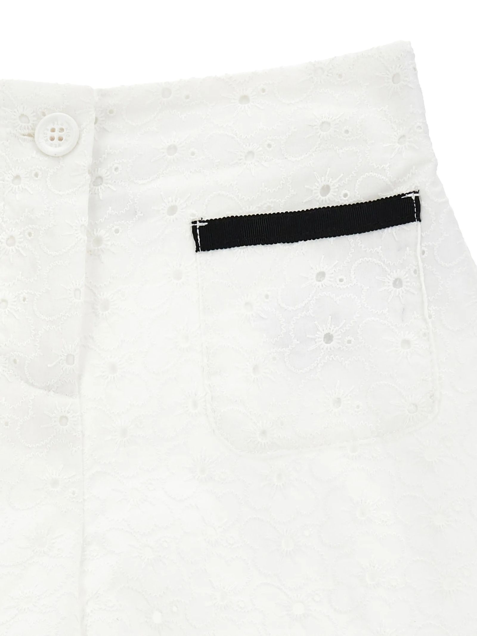 White cotton shorts with buttonholes, button closure, two pockets, black hem, and an elastic waistband