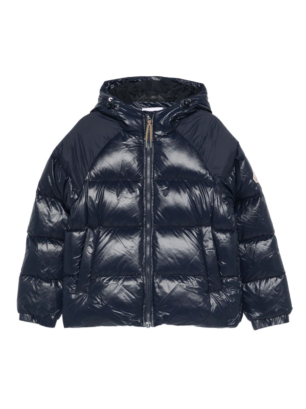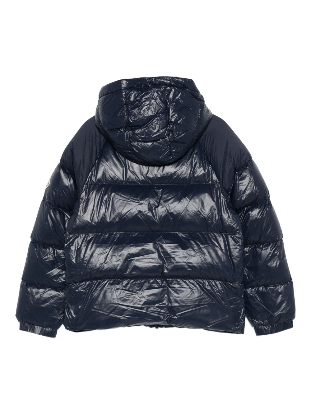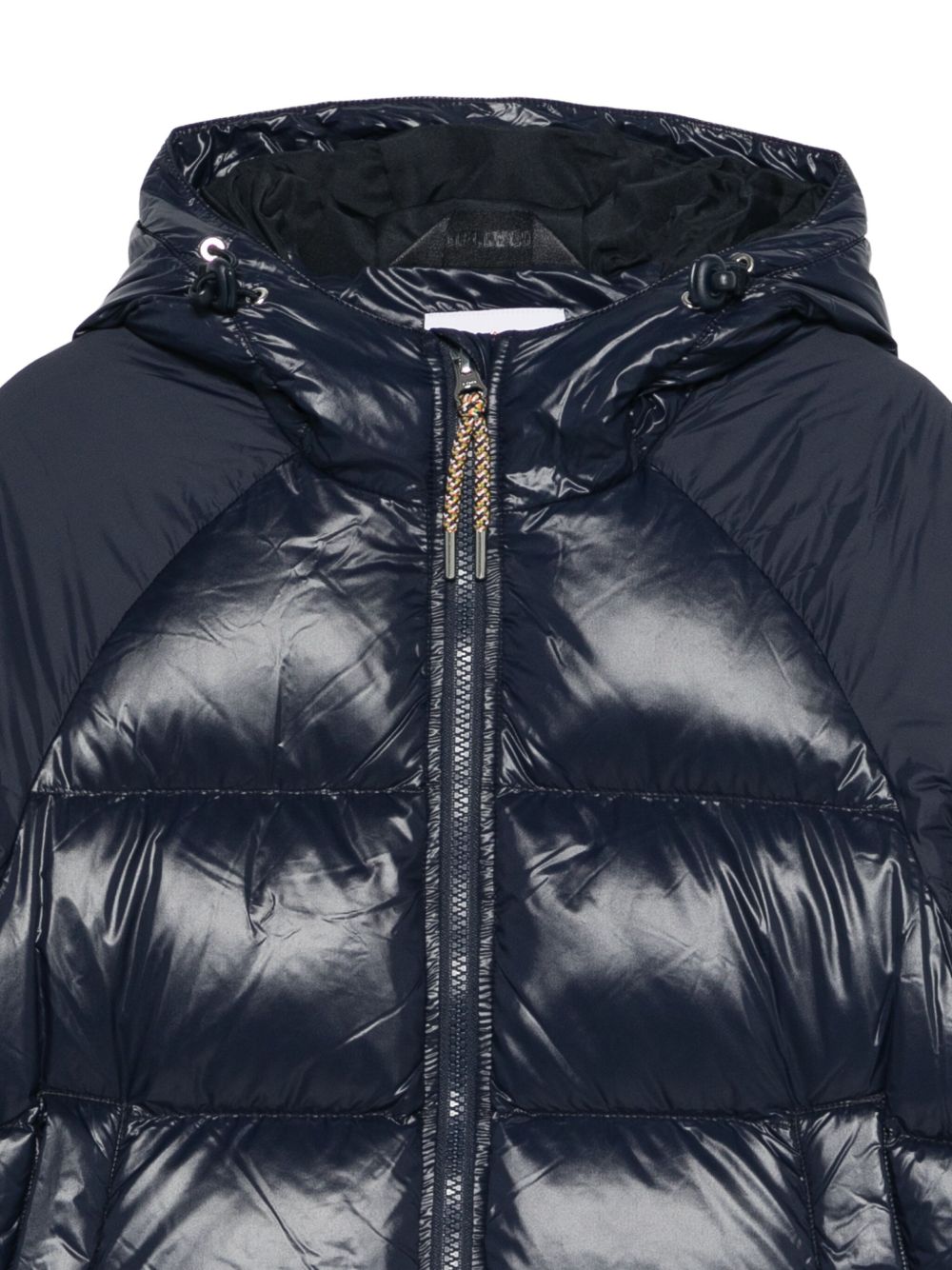 navy blue padded design drawstring hood zip fastening long sleeves logo patch