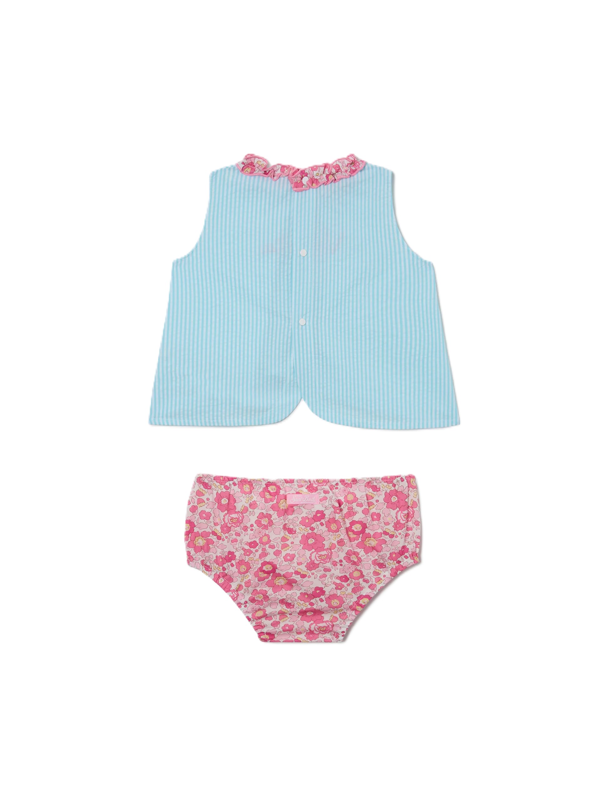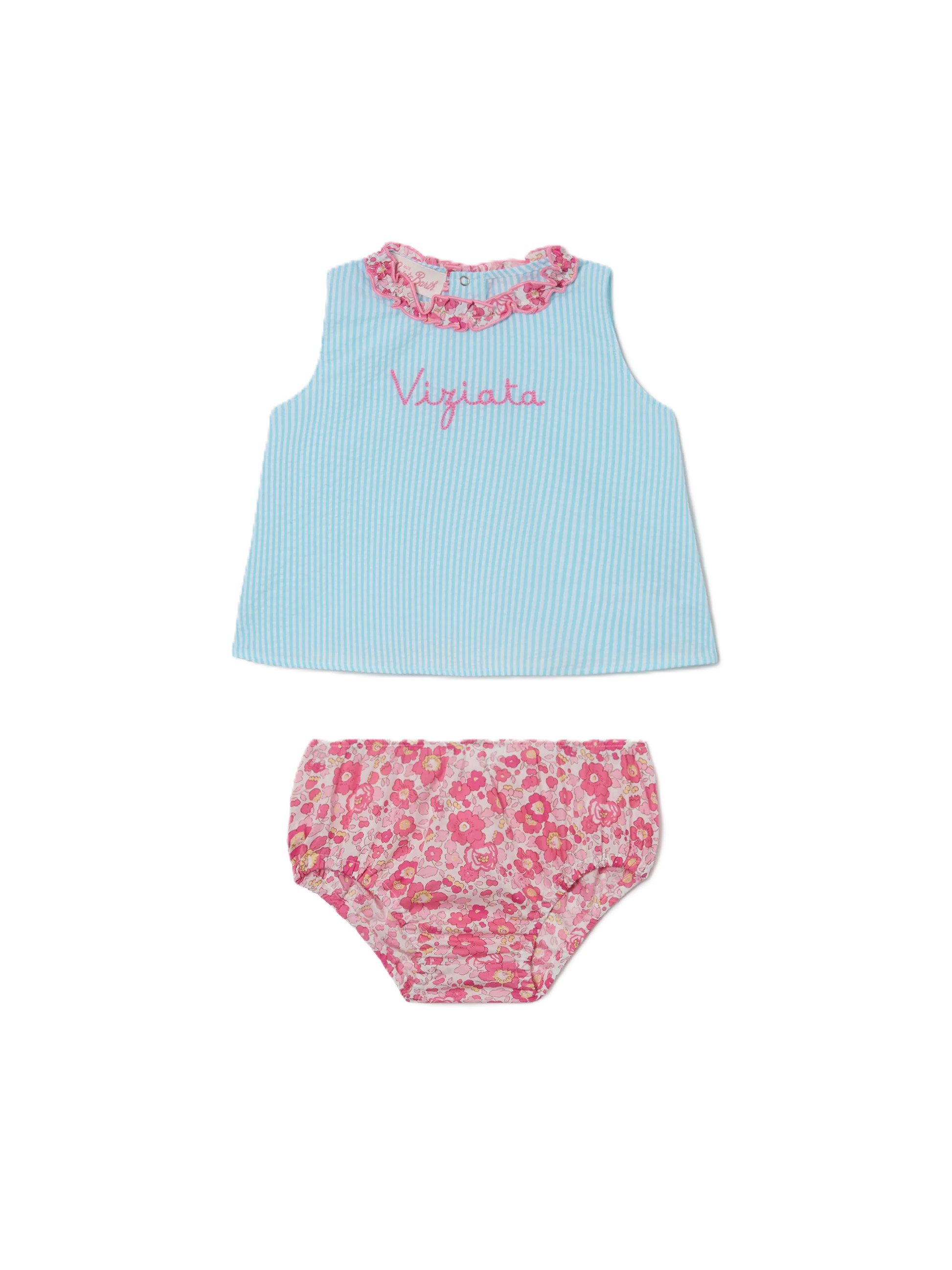 The Abbie newborn set includes a mint green seersucker pinafore dress and a matching Betsy Liberty diaper cover in shades of pink, yellow, light green, and white. Made of pure cotton, it features a Liberty Fabric ruffled collar and Viziata embroidery on the front. A fresh and delicate baby girl's outfit, perfect for the summer season.