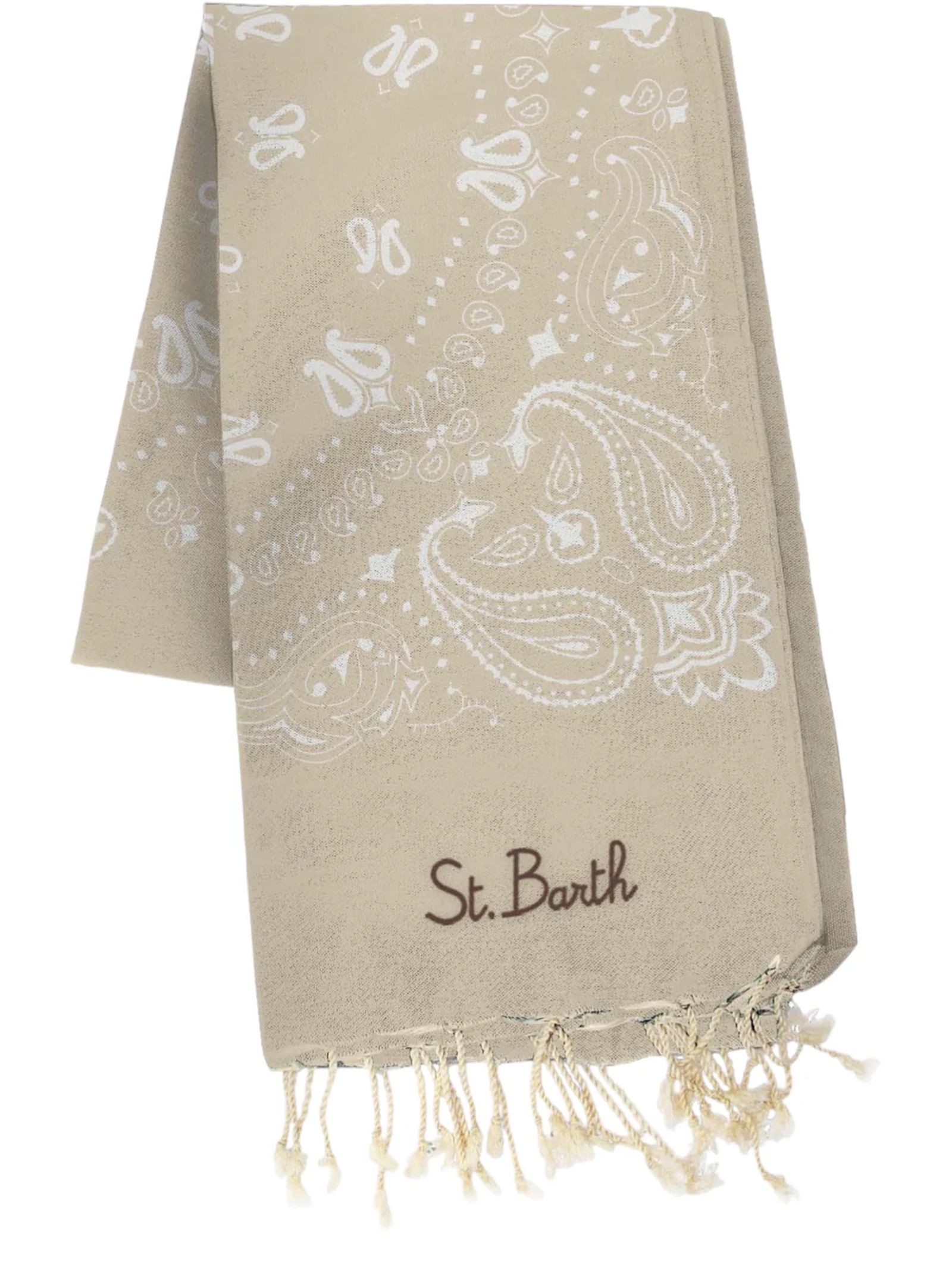 Beige paisley-print cotton beach towel, embroidered St. Barth logo, fringes, Dimensions: 100 x 200 cm