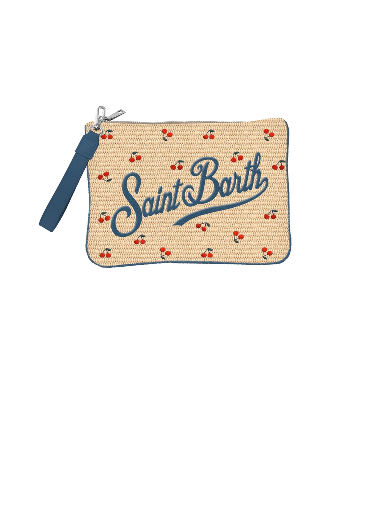 Beige straw Parisienne bag with an all-over cherry print, adjustable and removable shoulder strap, removable wrist strap, embroidered logo, single compartment, interior logo patch, striped lining, silver-tone hardware, top zip closure, Width 27 cm, Height