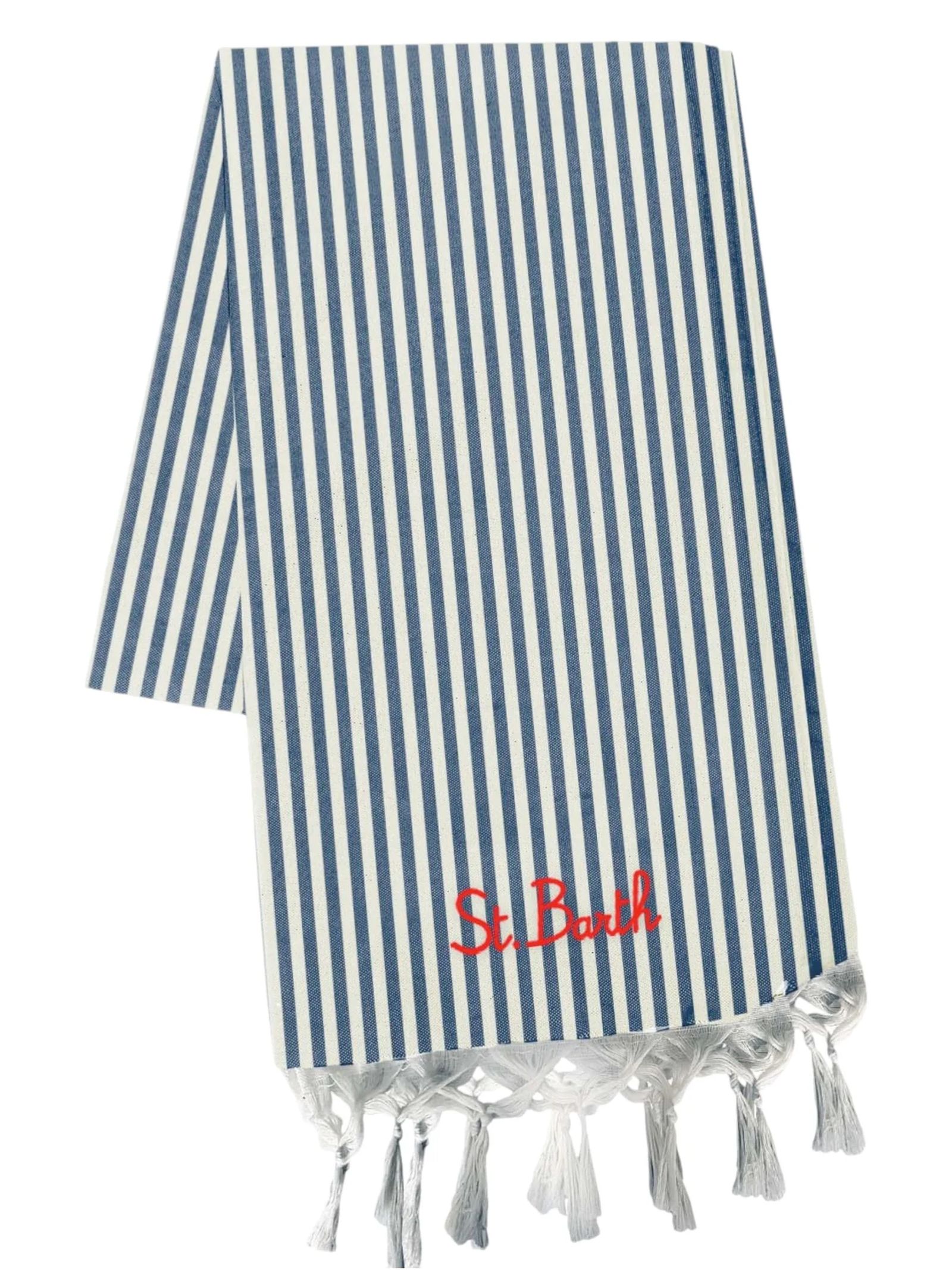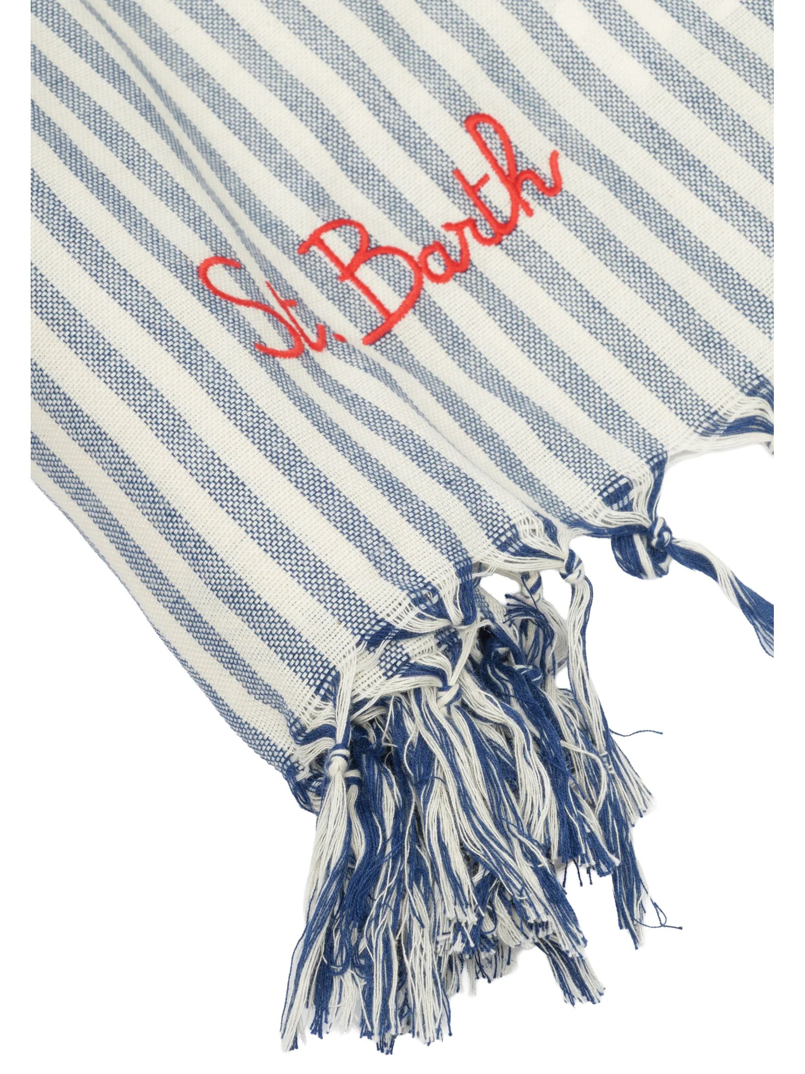 Blue and white striped cotton beach towel, embroidered St. Barth logo, fringe. Dimensions: 100 x 200 cm