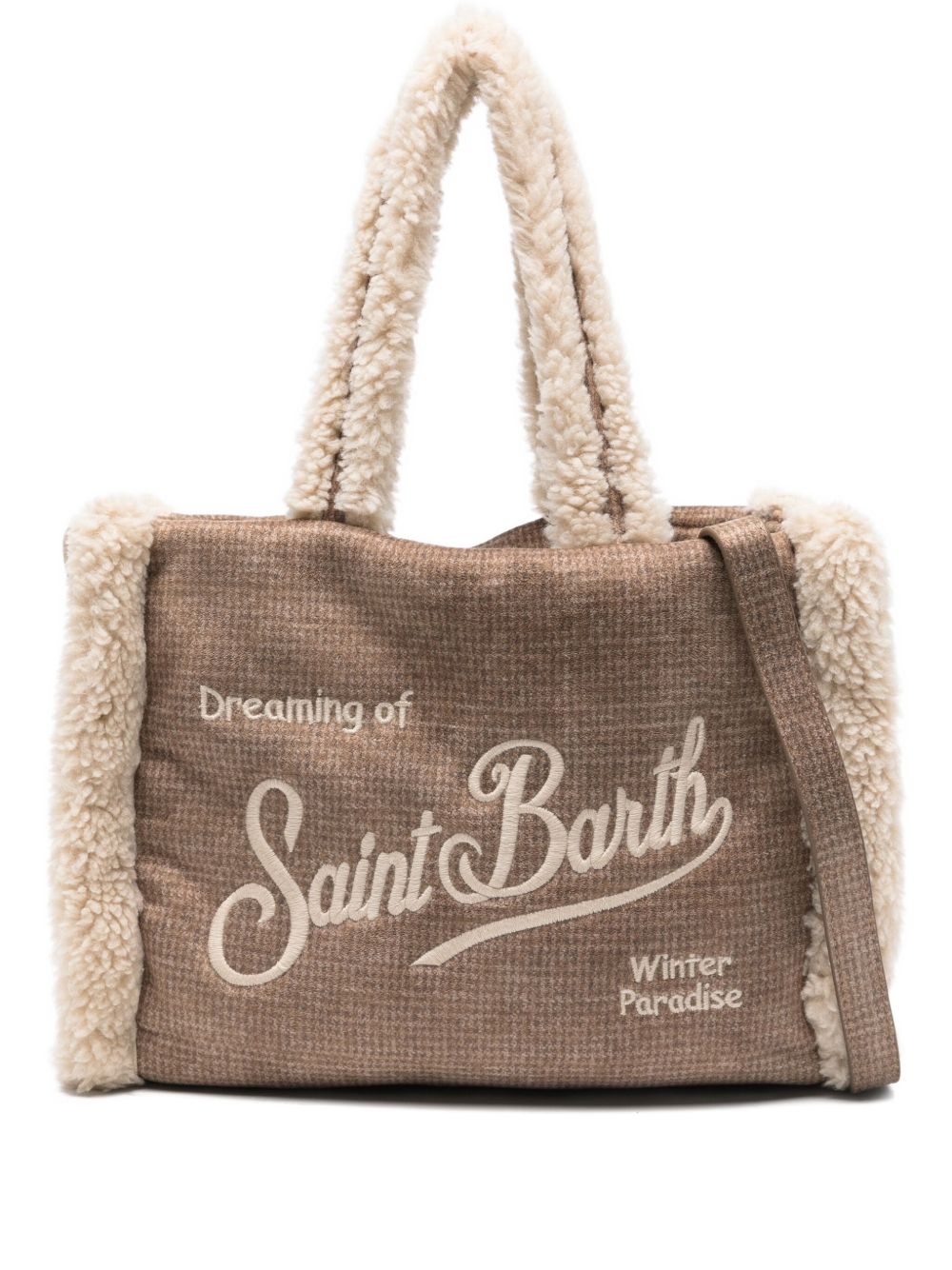 brown faux-fur trim embroidery logo top handle detachable shoulder strap internal zip-fastening pocket
