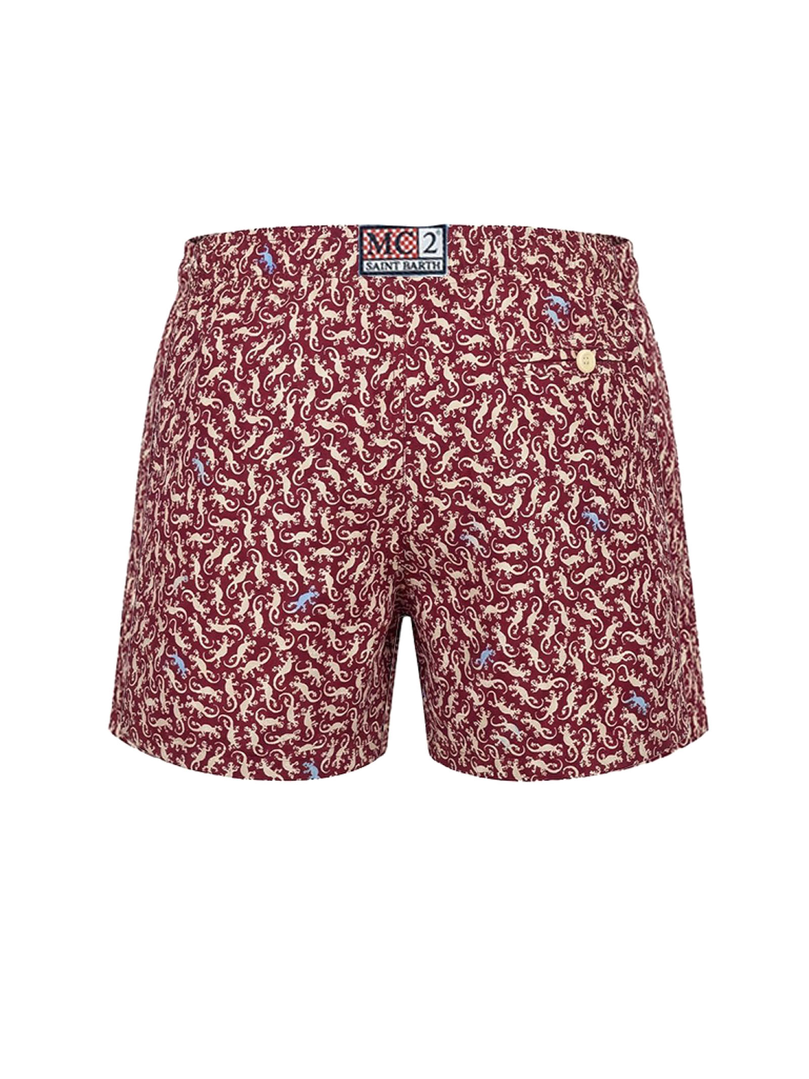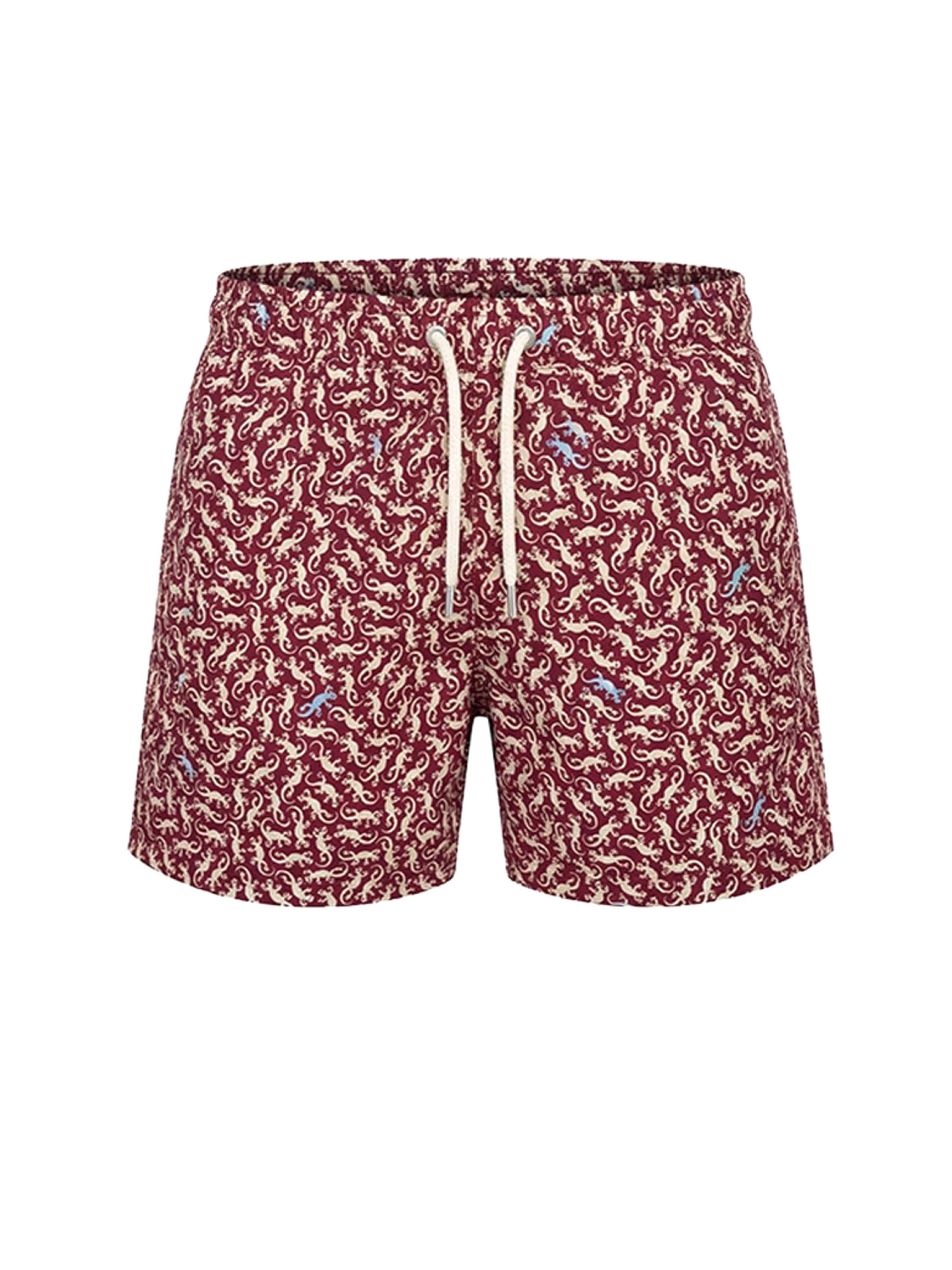 Burgundy swimsuit with all-over gecko print, elastic waistband with drawstring, all-over gecko print,back pocket with flap and drainage holes