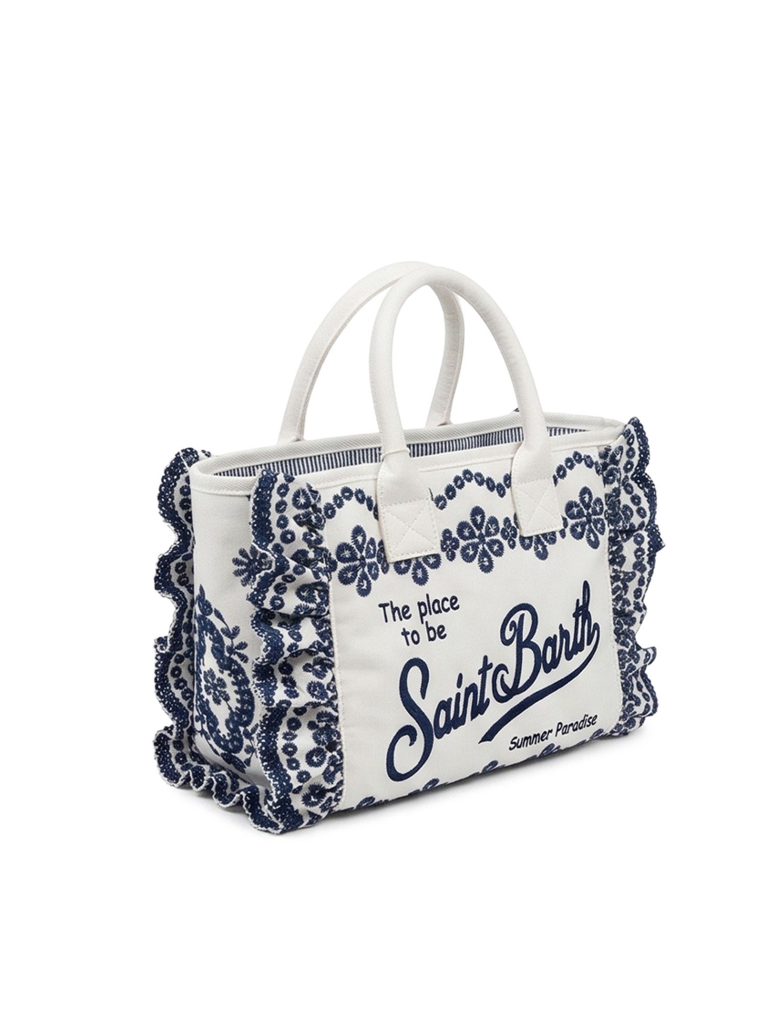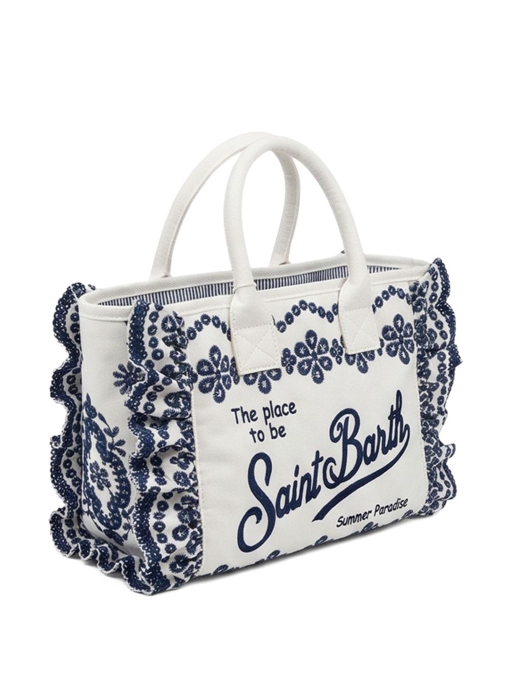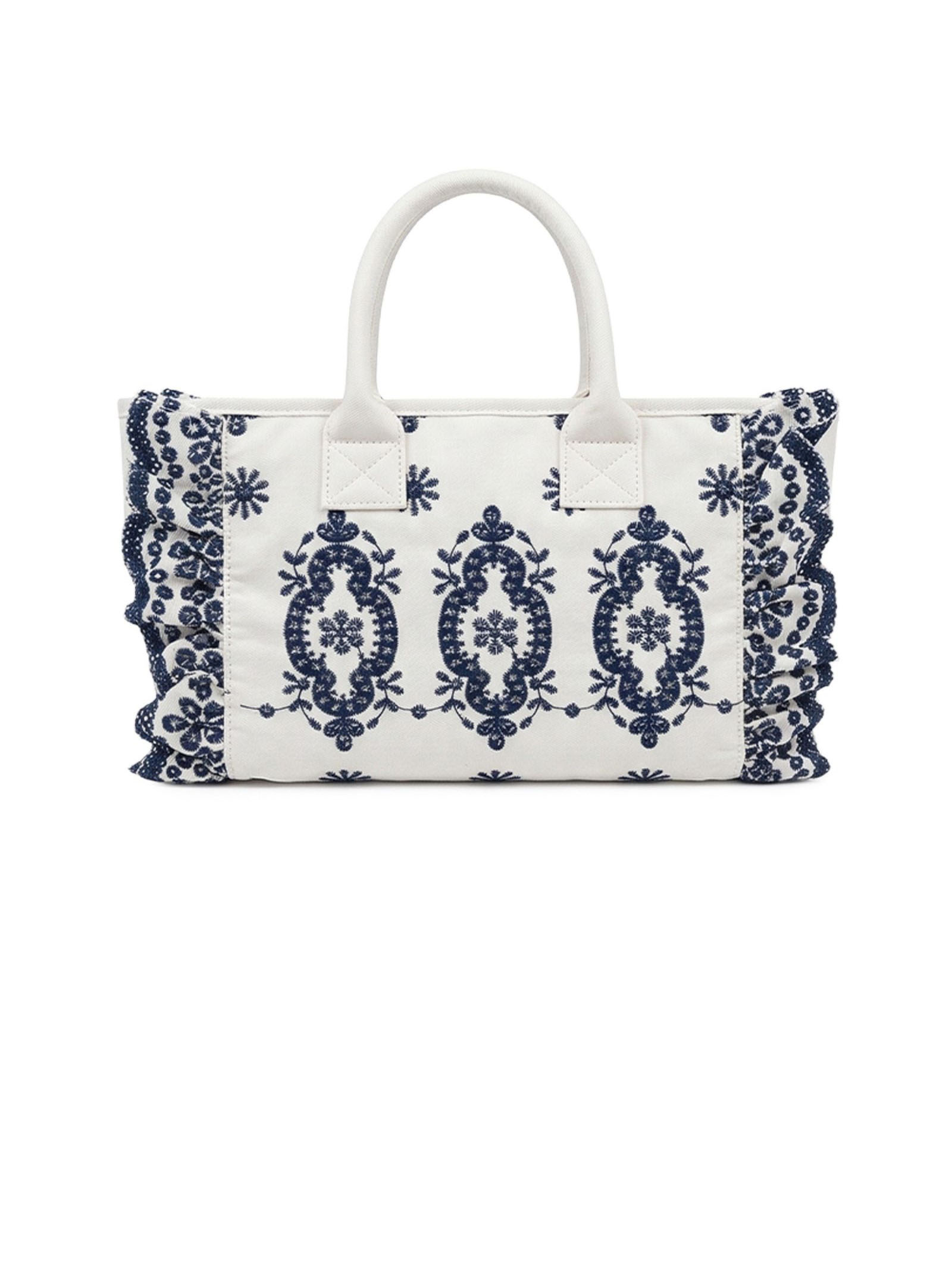 Colette bag in white and blue broderie anglaise, adjustable shoulder strap, navy logo on the front, fringe along the edges, two top handles. Dimensions: 26 x 23 x 15 cm