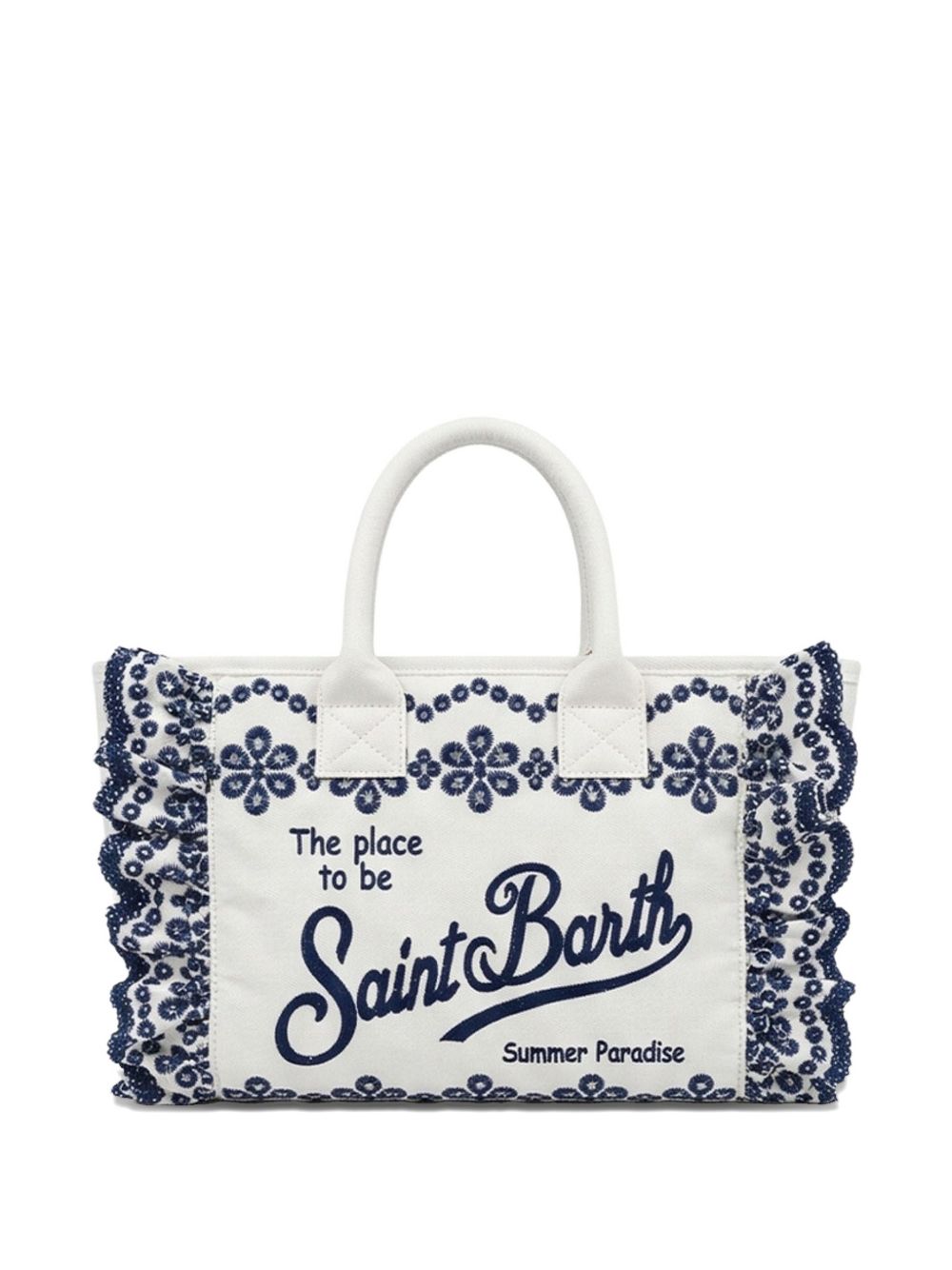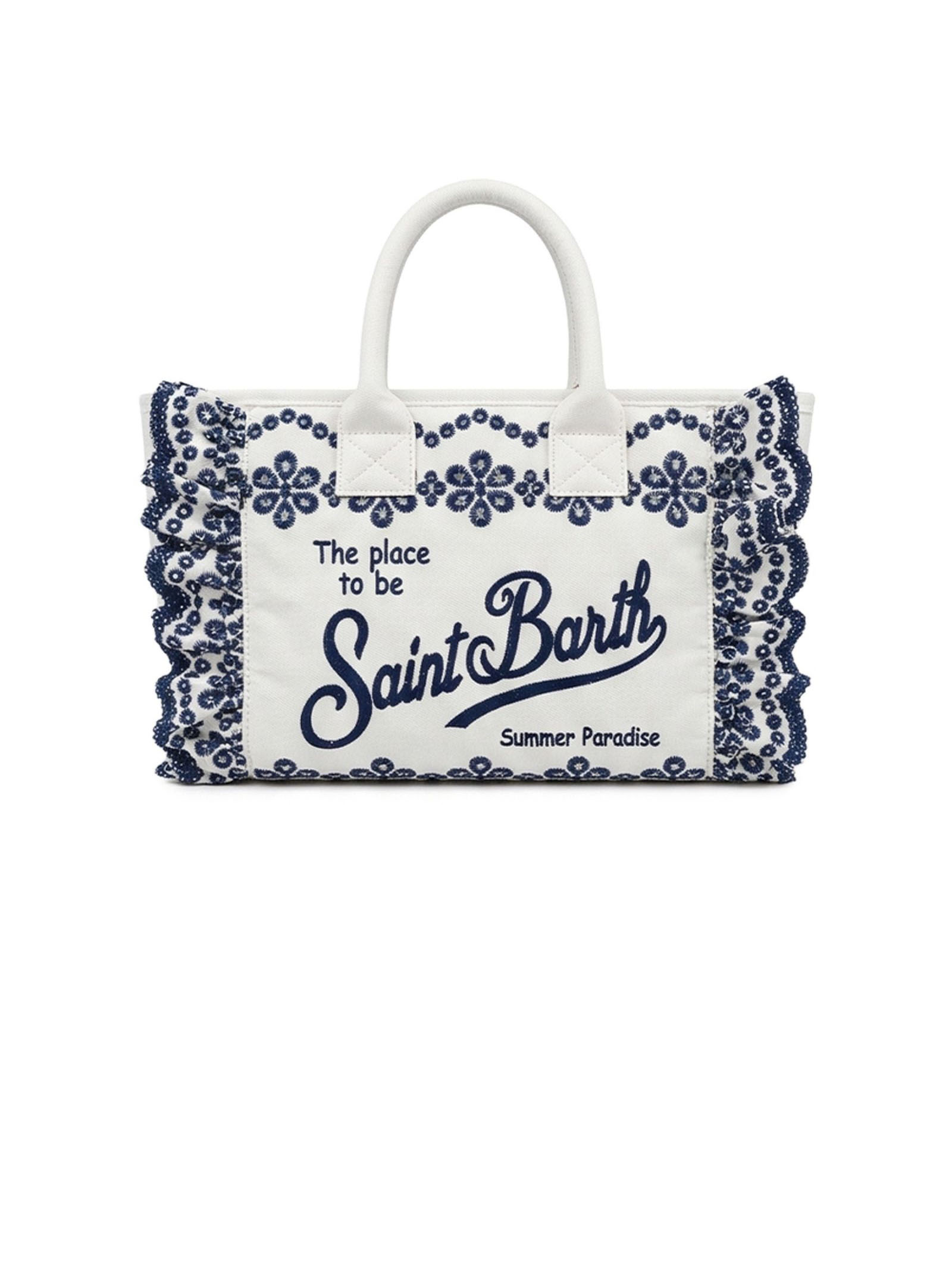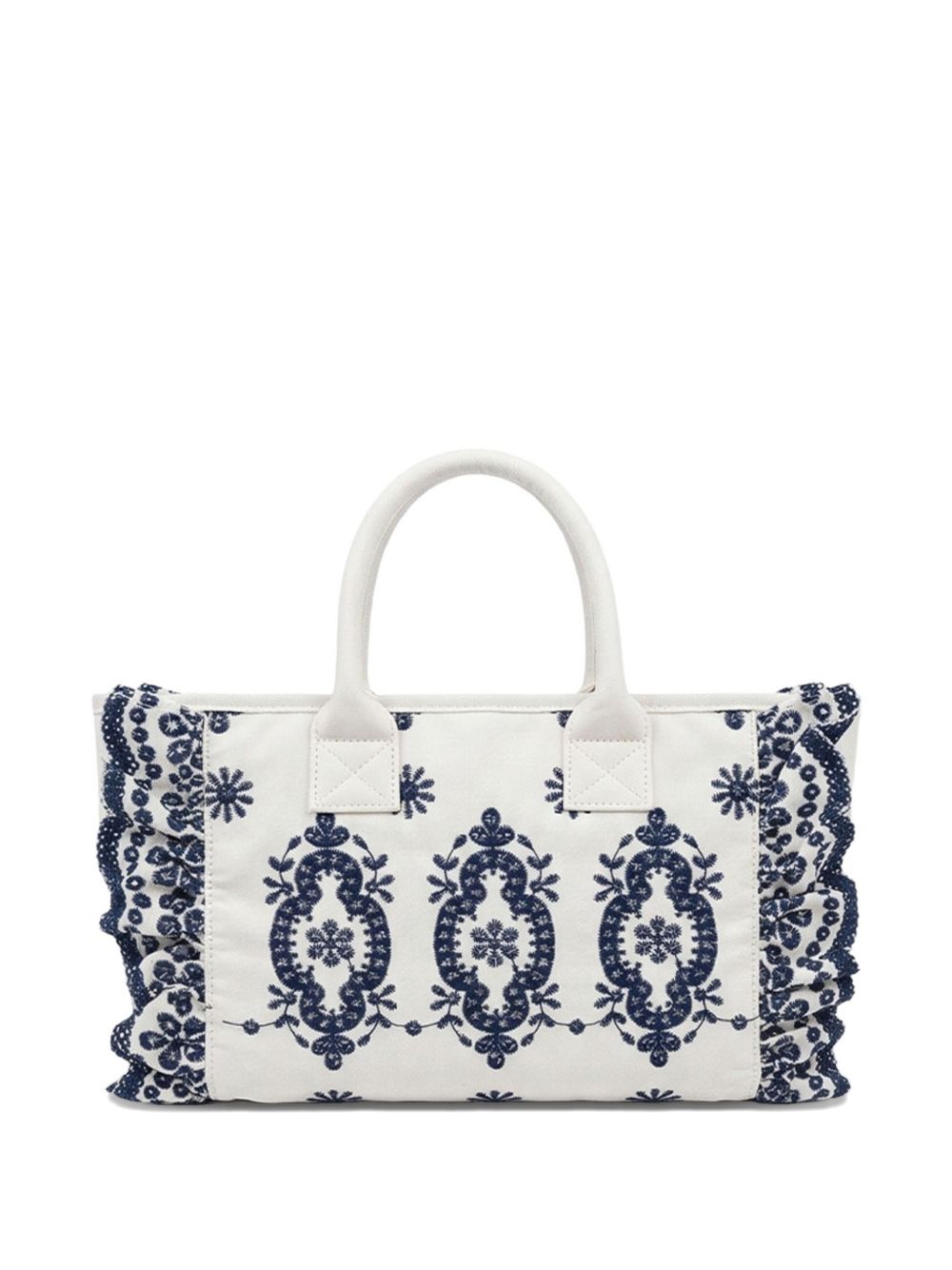 Colette bag in white and blue broderie anglaise, adjustable shoulder strap, navy logo on the front, fringe along the edges, two top handles. Dimensions: 26 x 23 x 15 cm