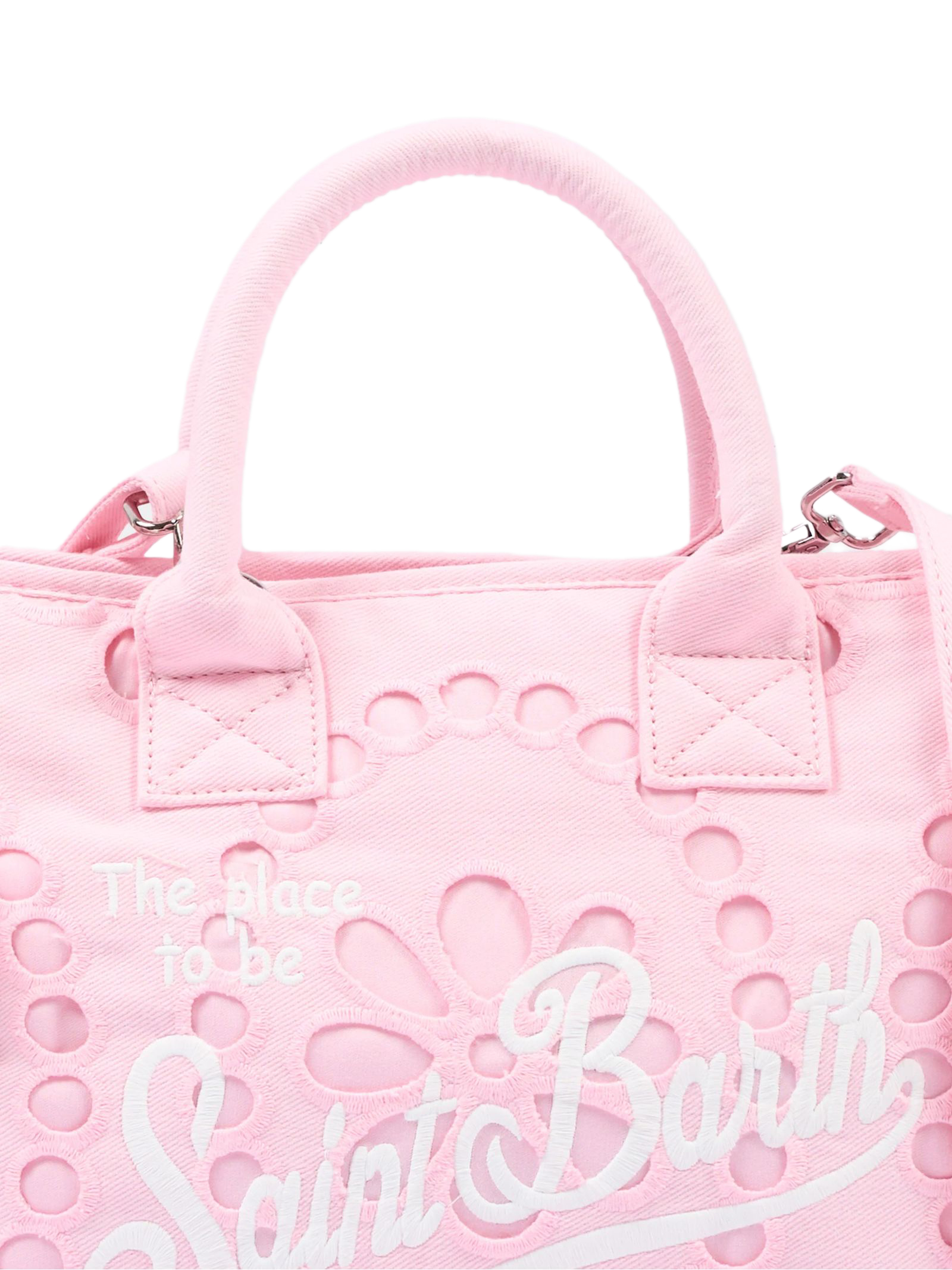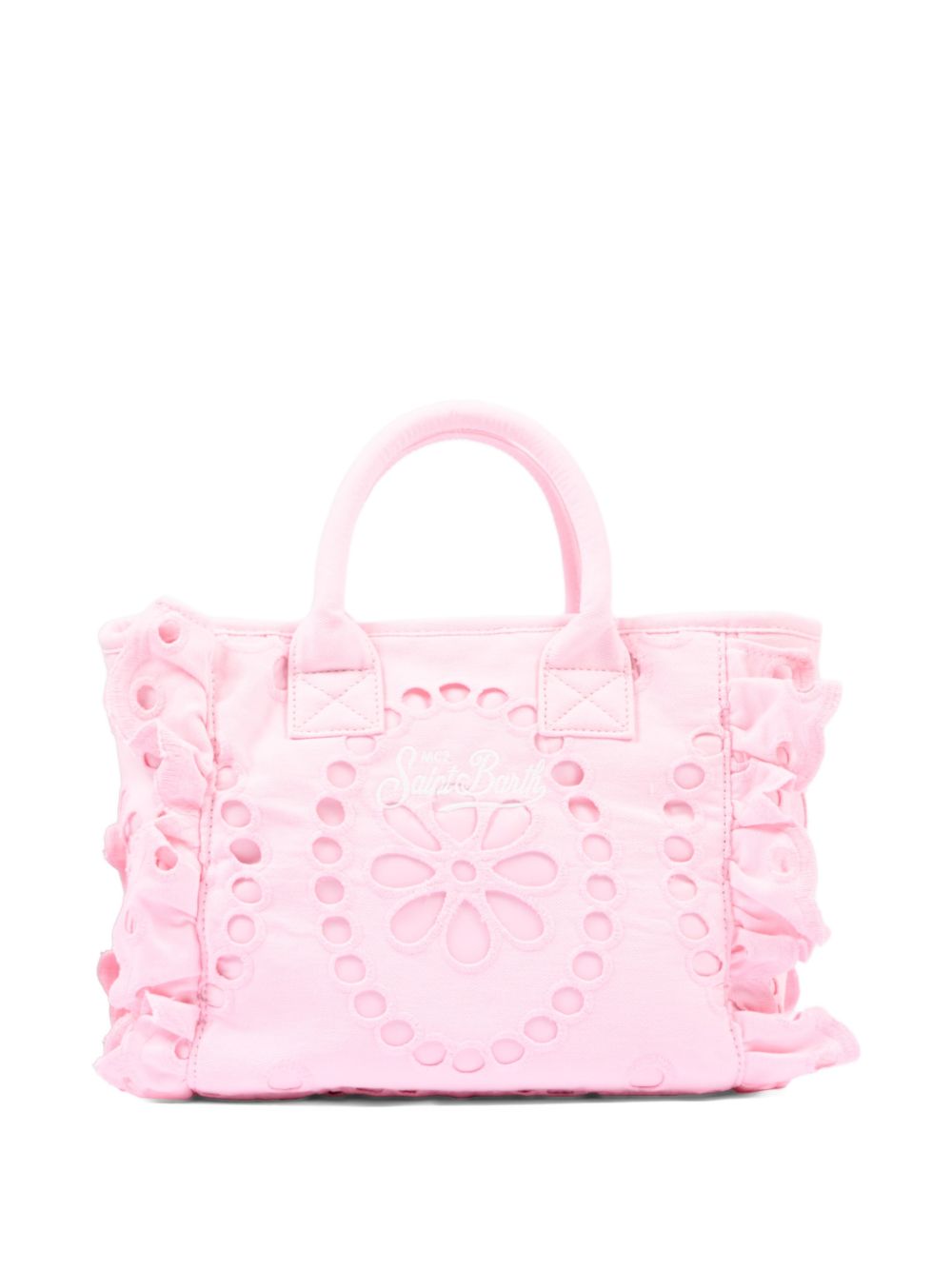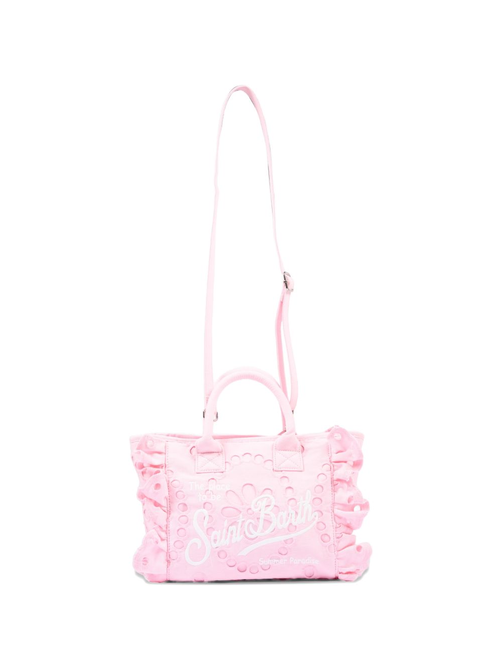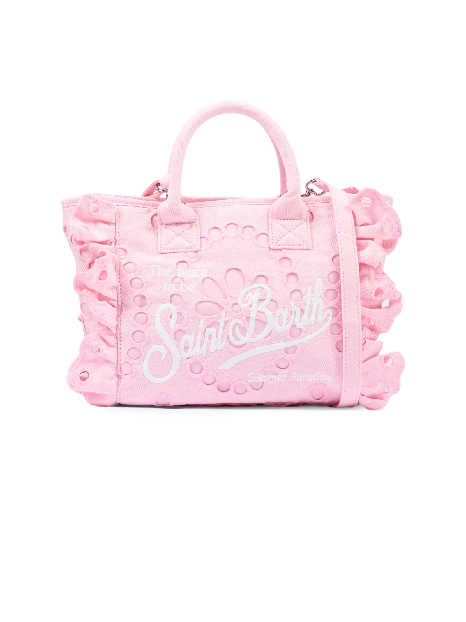 Colette Volant pink canvas bag with openwork detailing inspired by broderie anglaise; the Saint Barth script logo stands out on the front with contrasting lettering; padded handles are complemented by a matching removable shoulder strap; side ruffles with