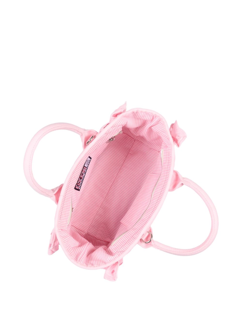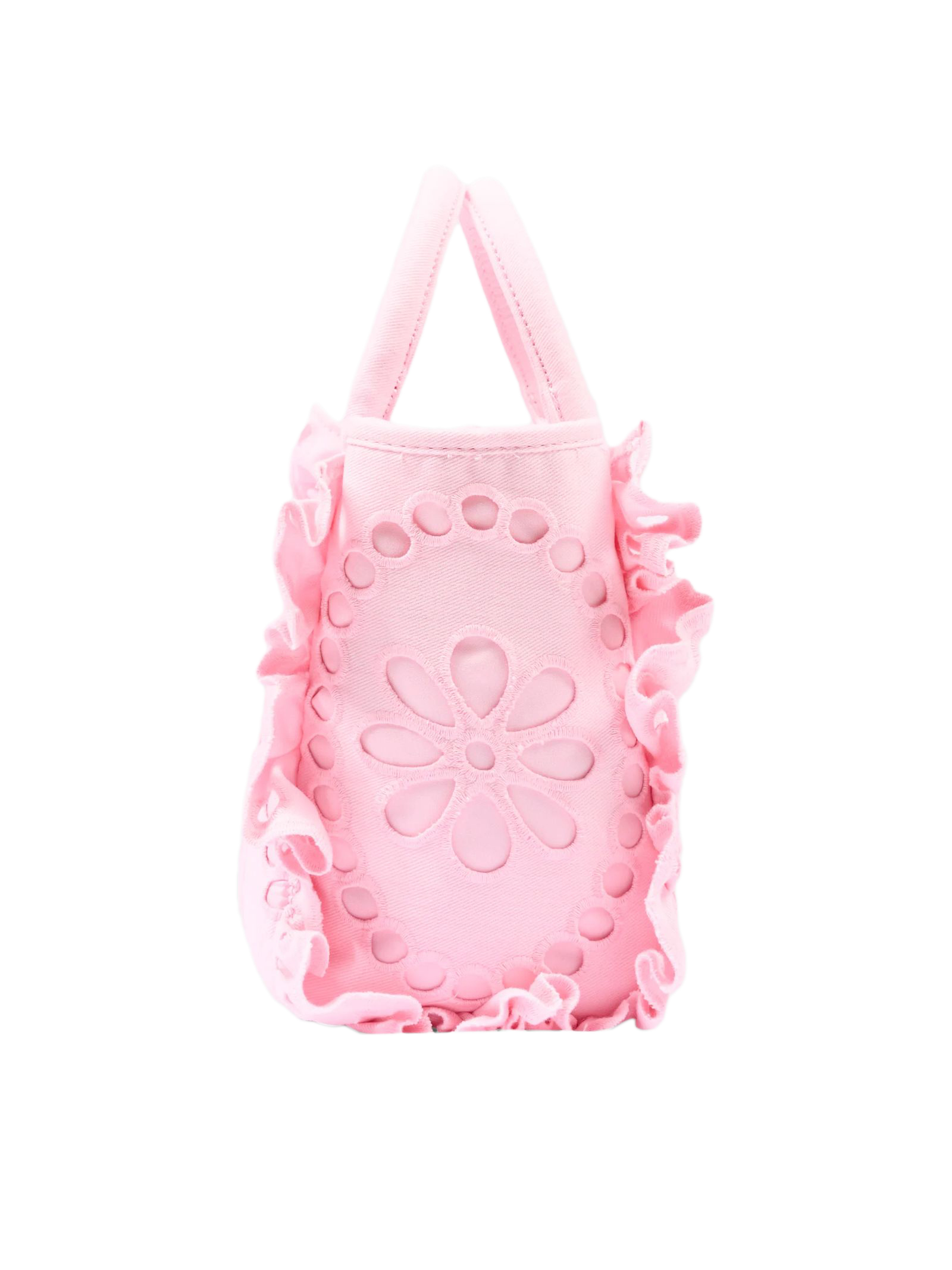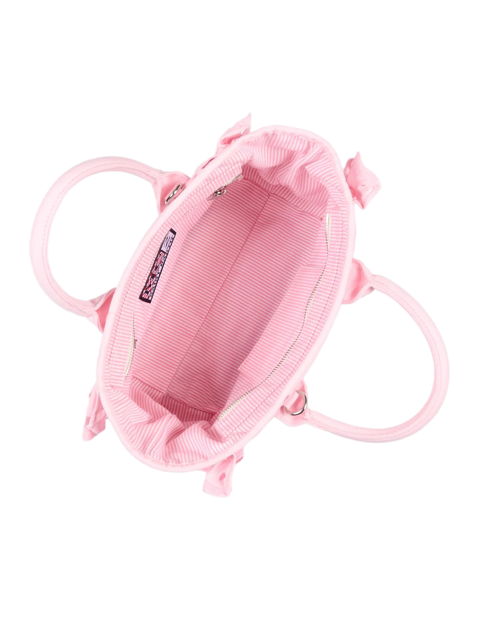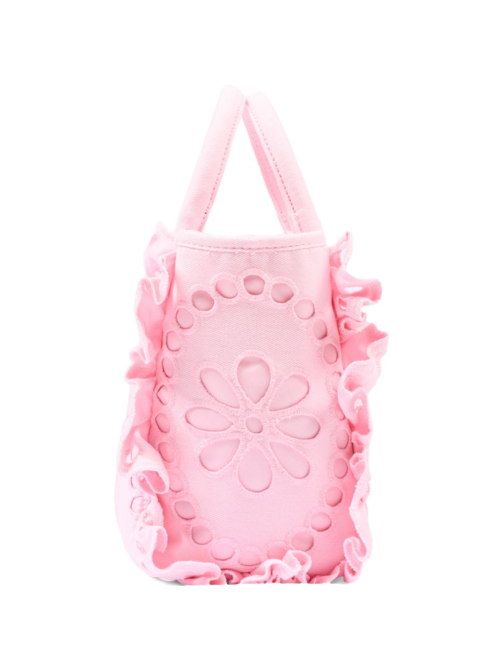 Colette Volant pink canvas bag with openwork detailing inspired by broderie anglaise; the Saint Barth script logo stands out on the front with contrasting lettering; padded handles are complemented by a matching removable shoulder strap; side ruffles with
