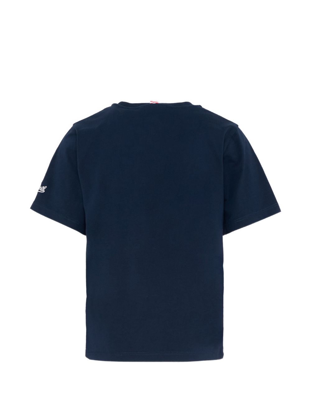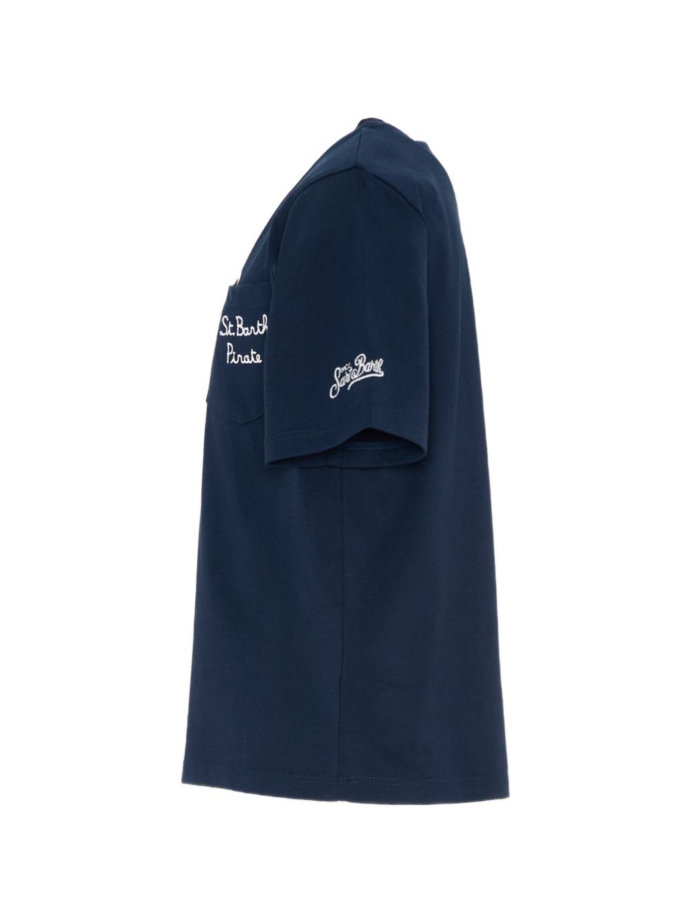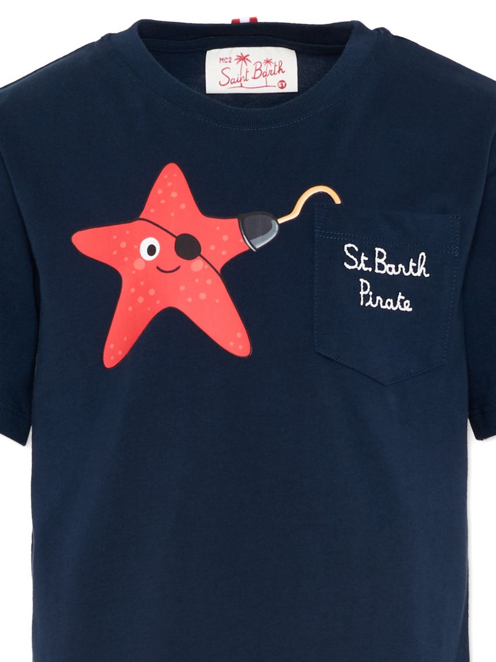Eddy T-shirt in blue cotton jersey with a crew neck and short sleeves, featuring a large cartoon starfish with pirate-inspired details, accompanied by the words St. Barth Pirate embroidered above the patch pocket