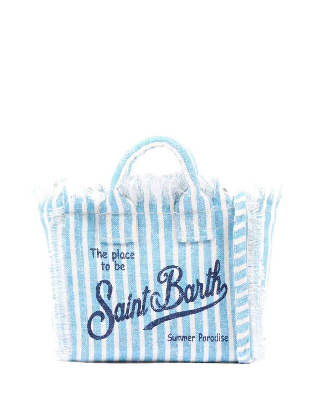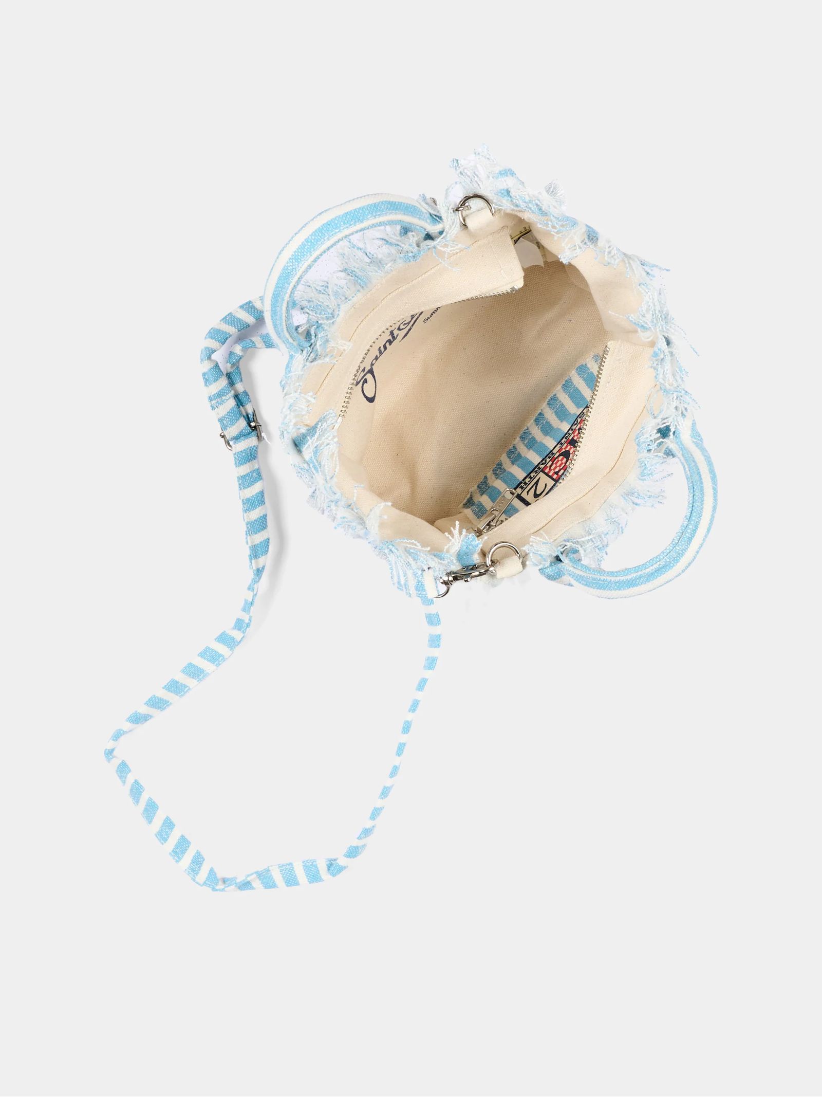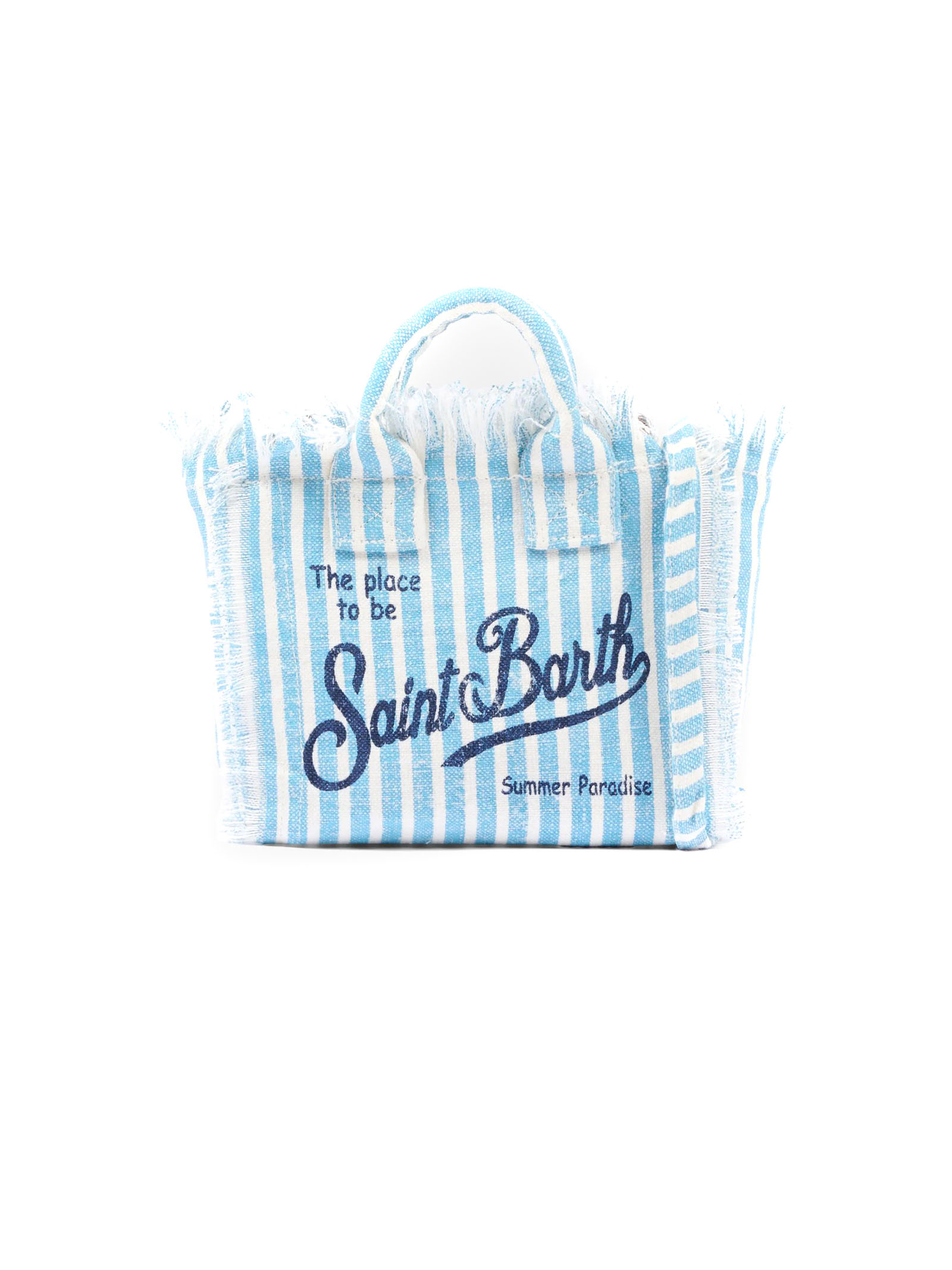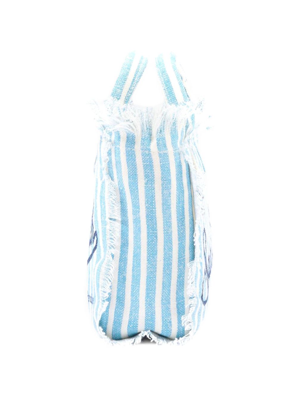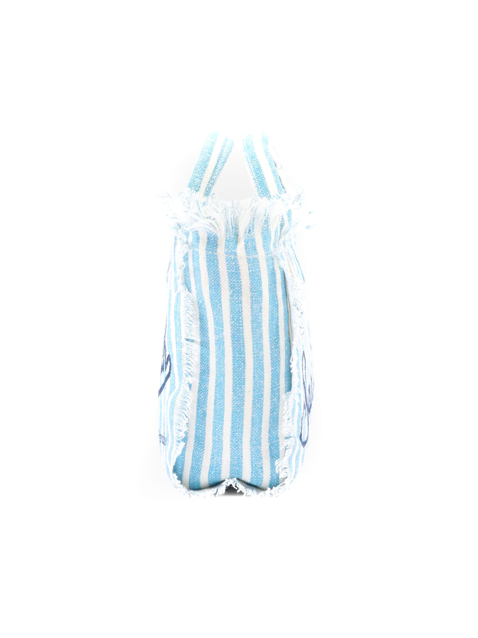 Light blue Linen Mini Vanity Bag With A Striped Pattern And Blue Logo Print, Blue Shoulder Strap, Side Fringes, Double Top Handles, And A Zipper Closure, 18 X 16 X 9 Cm