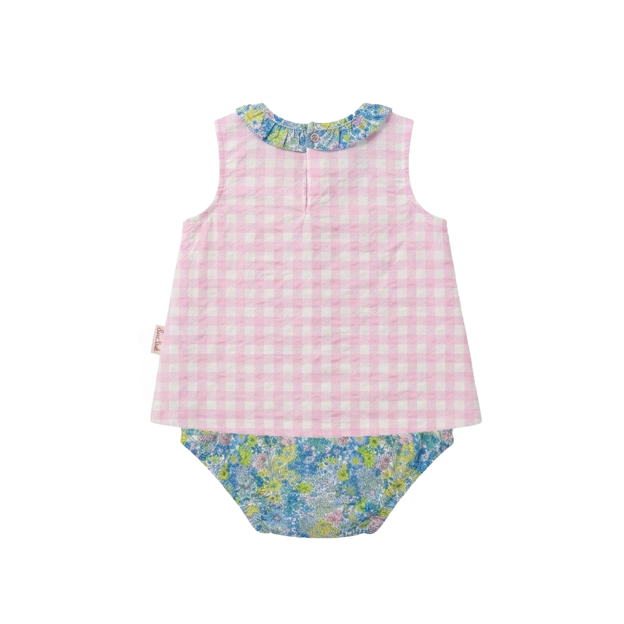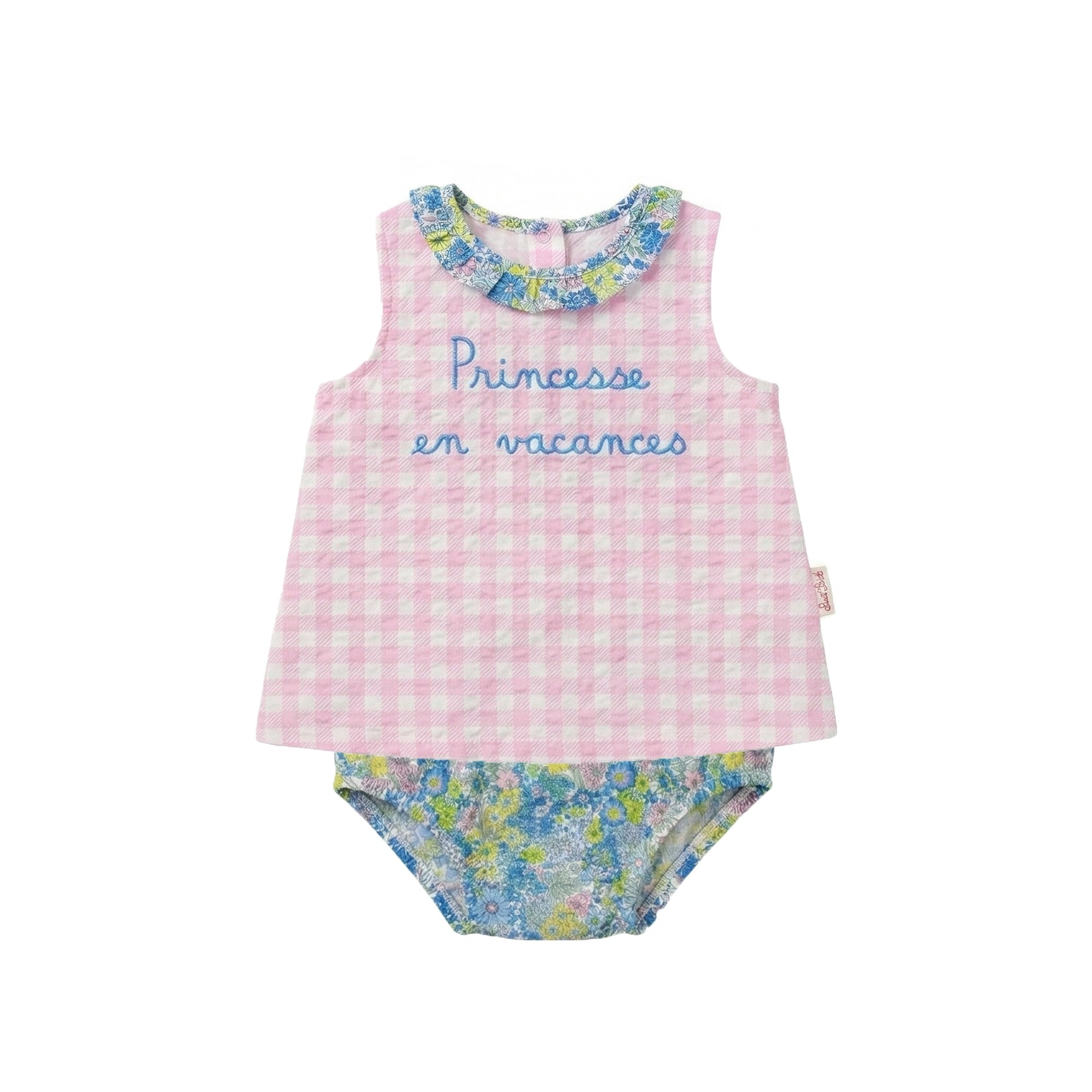 blue "Princesse en vacances" lettering on the front, snap buttons on the back, and multicolored floral culottes.