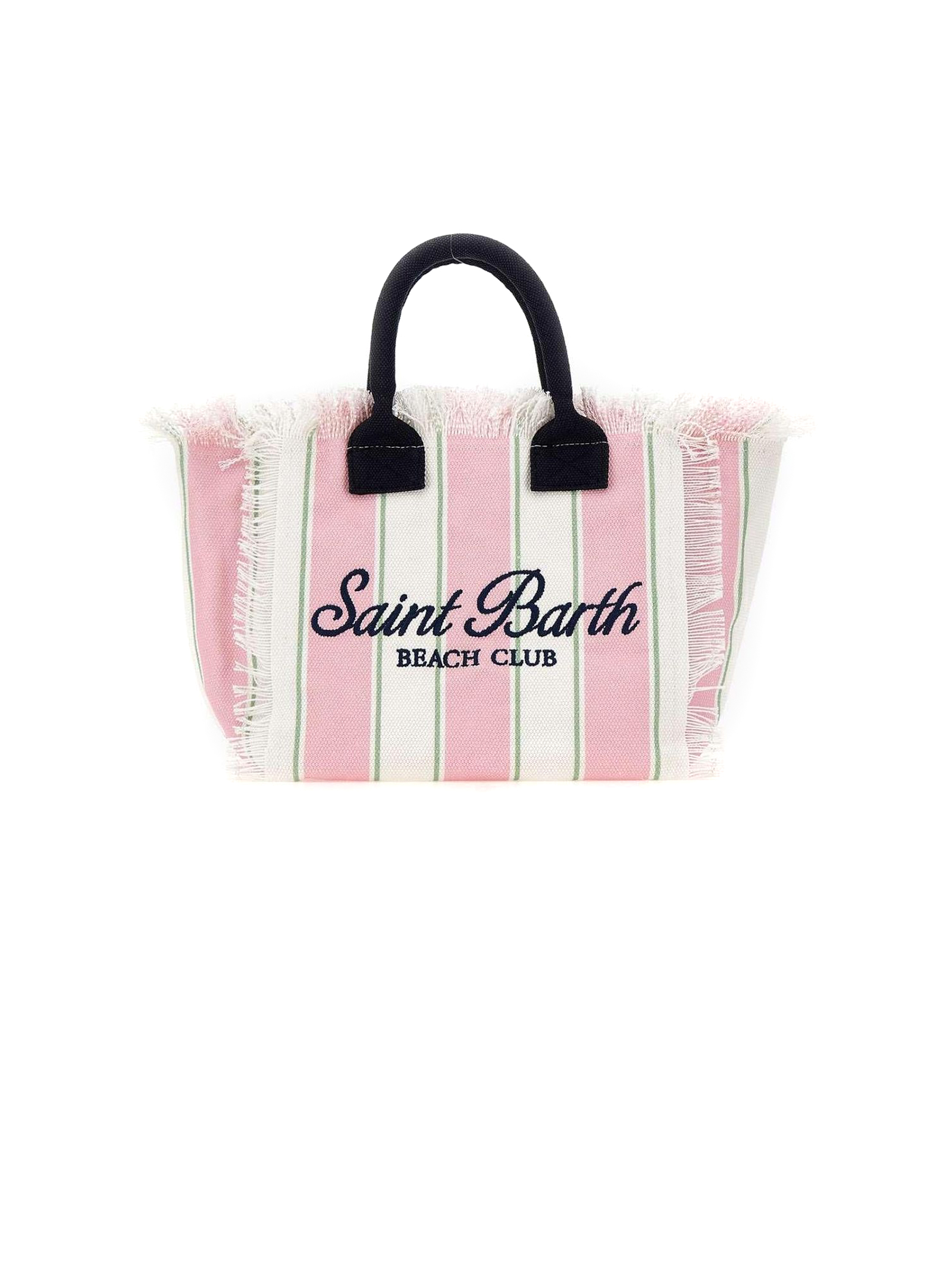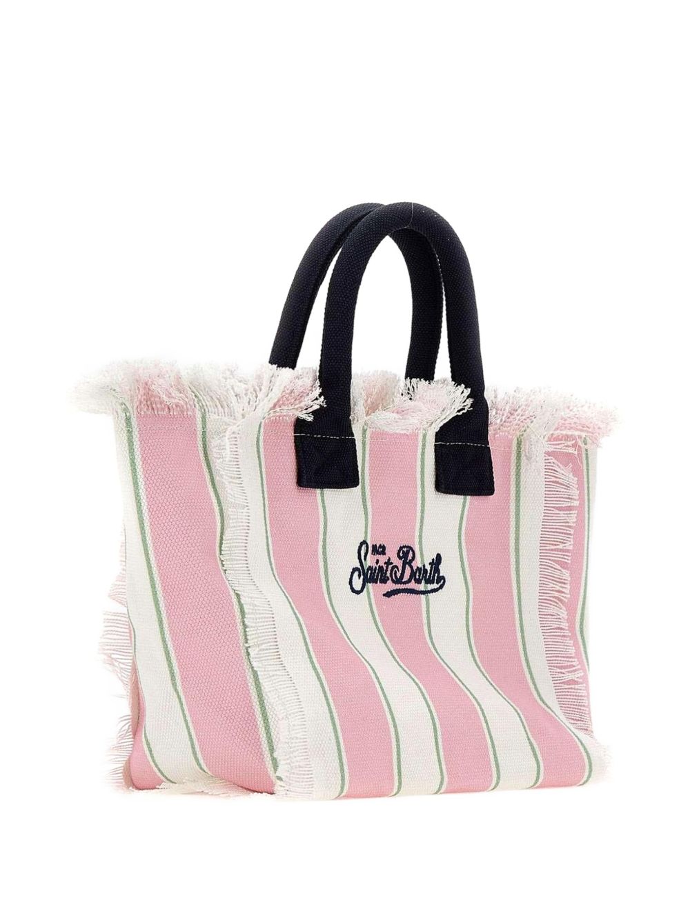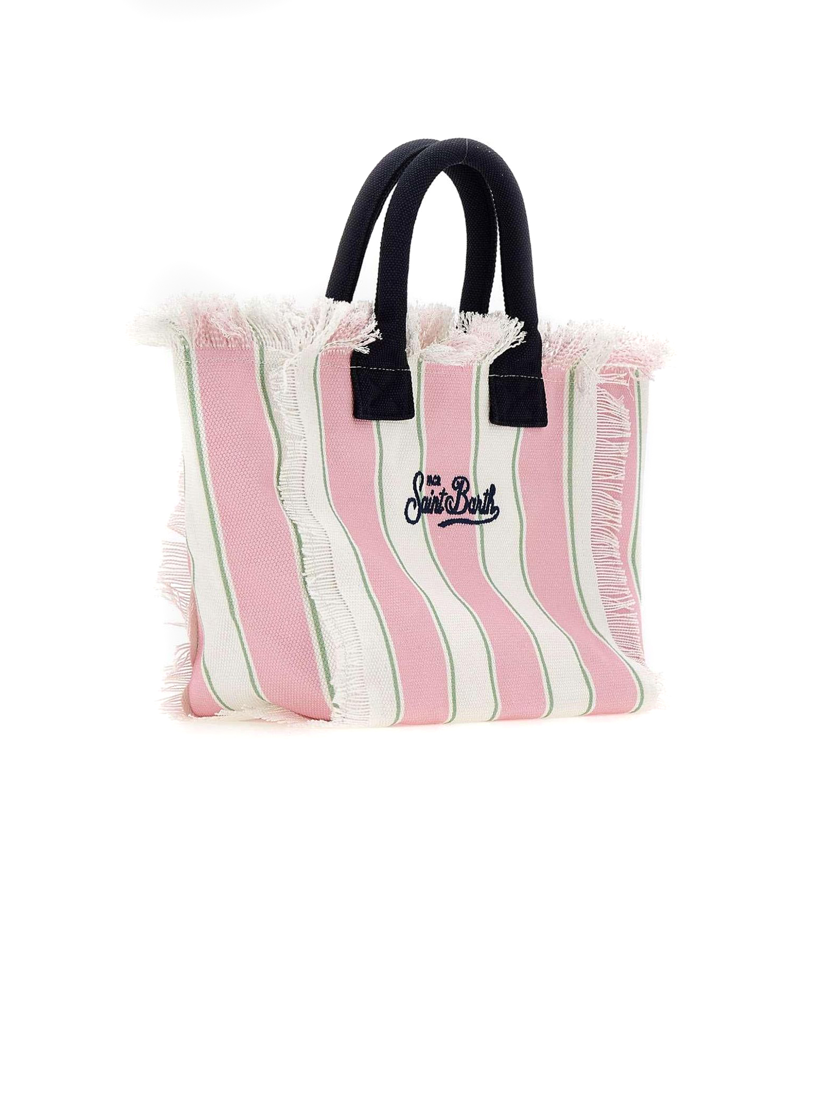 Pink and white cotton canvas bag with fringe detailing, an interior pocket, a zipper closure, double tubular handles, an adjustable and removable shoulder strap, a striped print with a large contrasting logo, 26 x 23 x 15 cm