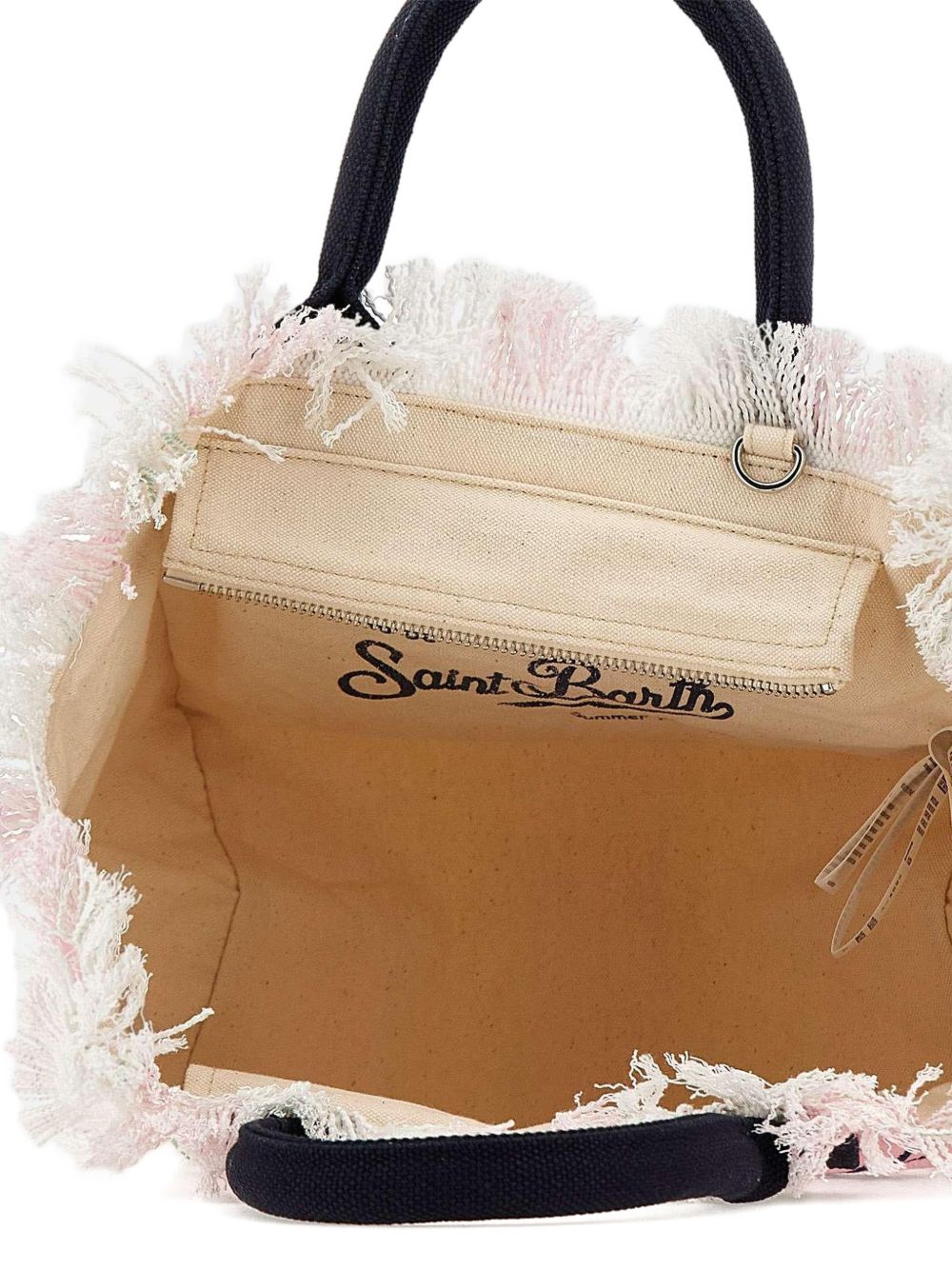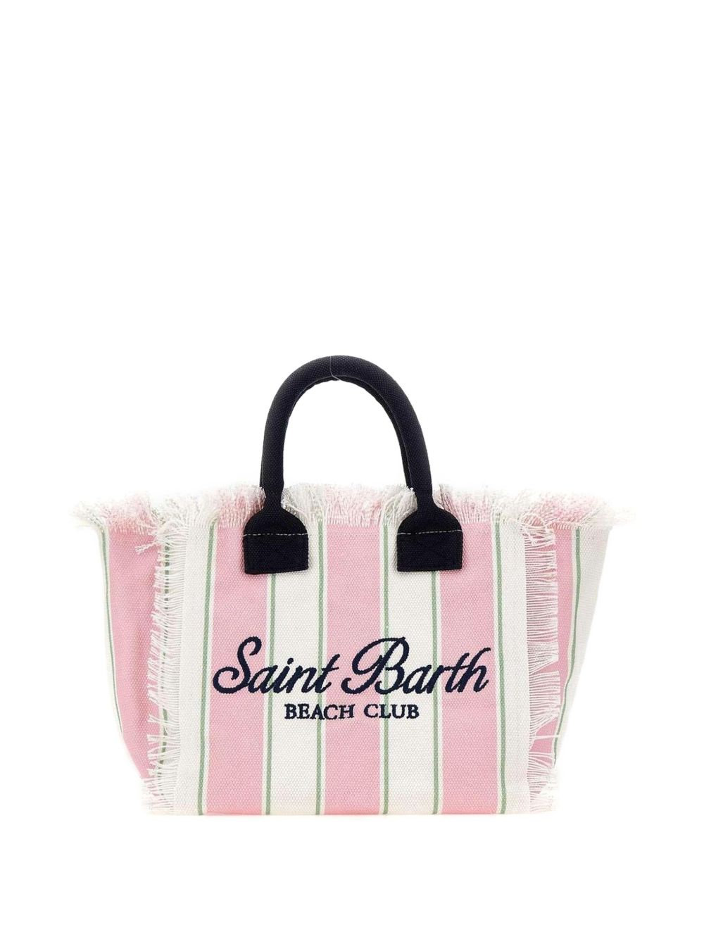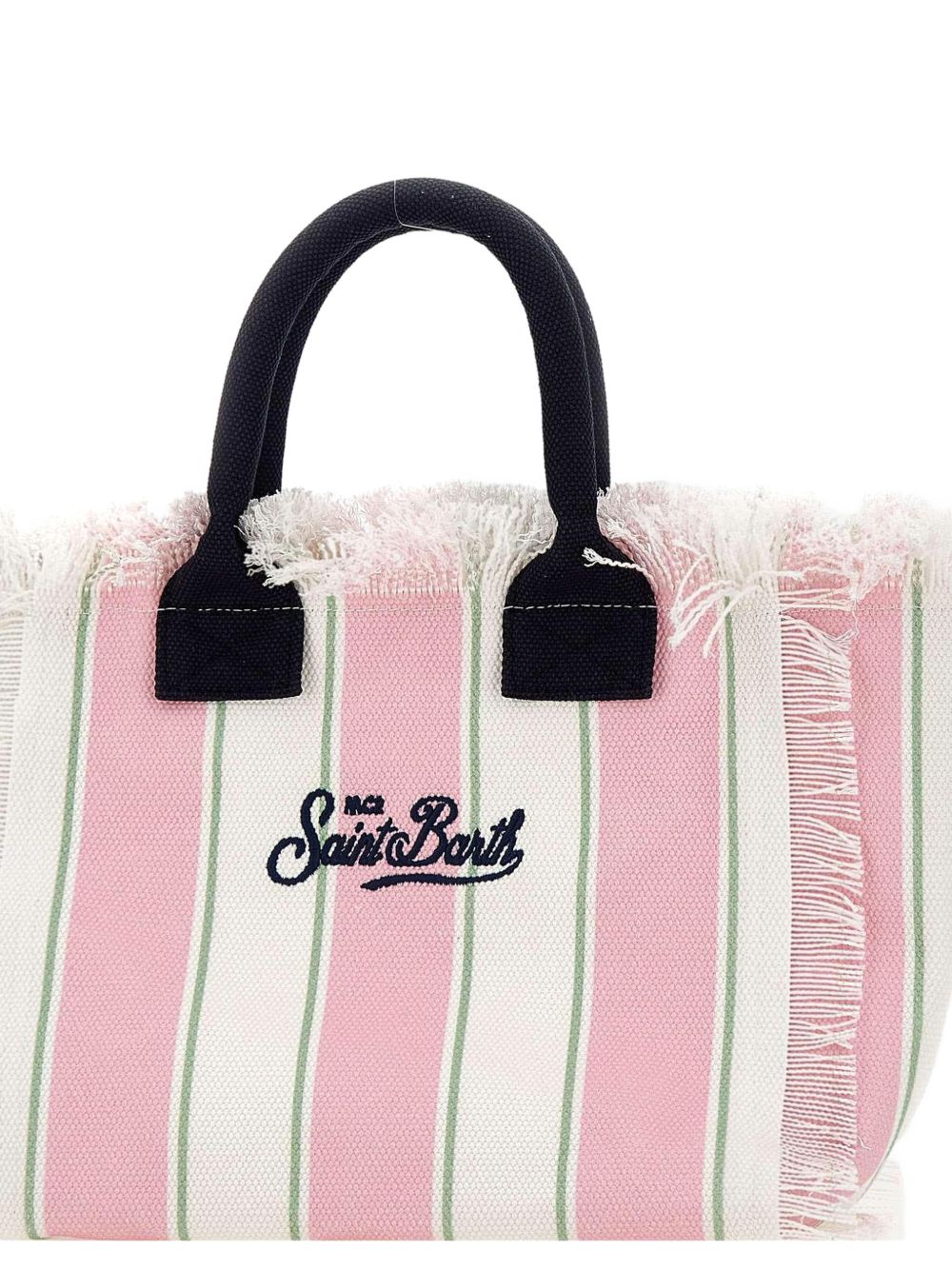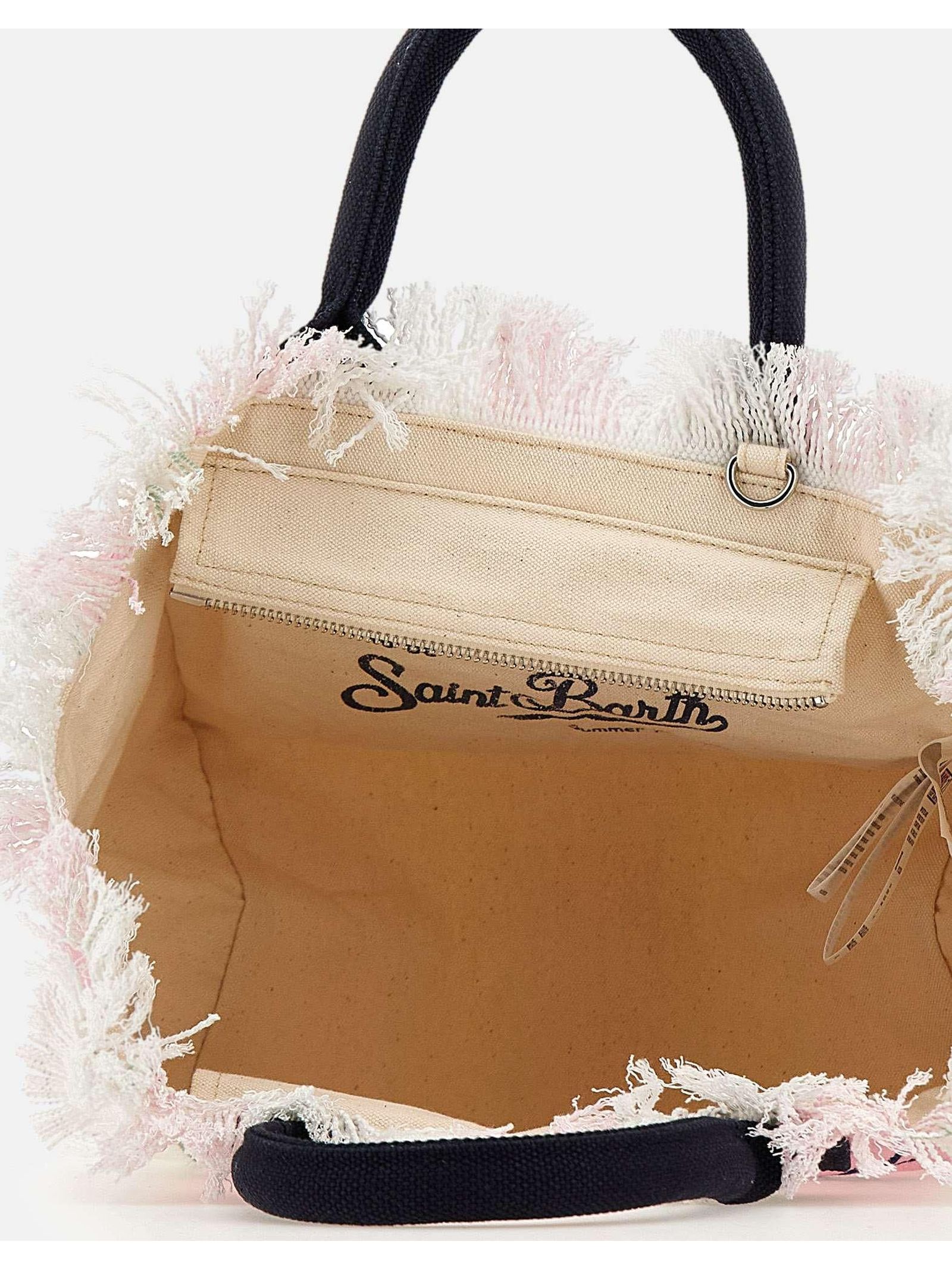 Pink and white cotton canvas bag with fringe detailing, an interior pocket, a zipper closure, double tubular handles, an adjustable and removable shoulder strap, a striped print with a large contrasting logo, 26 x 23 x 15 cm