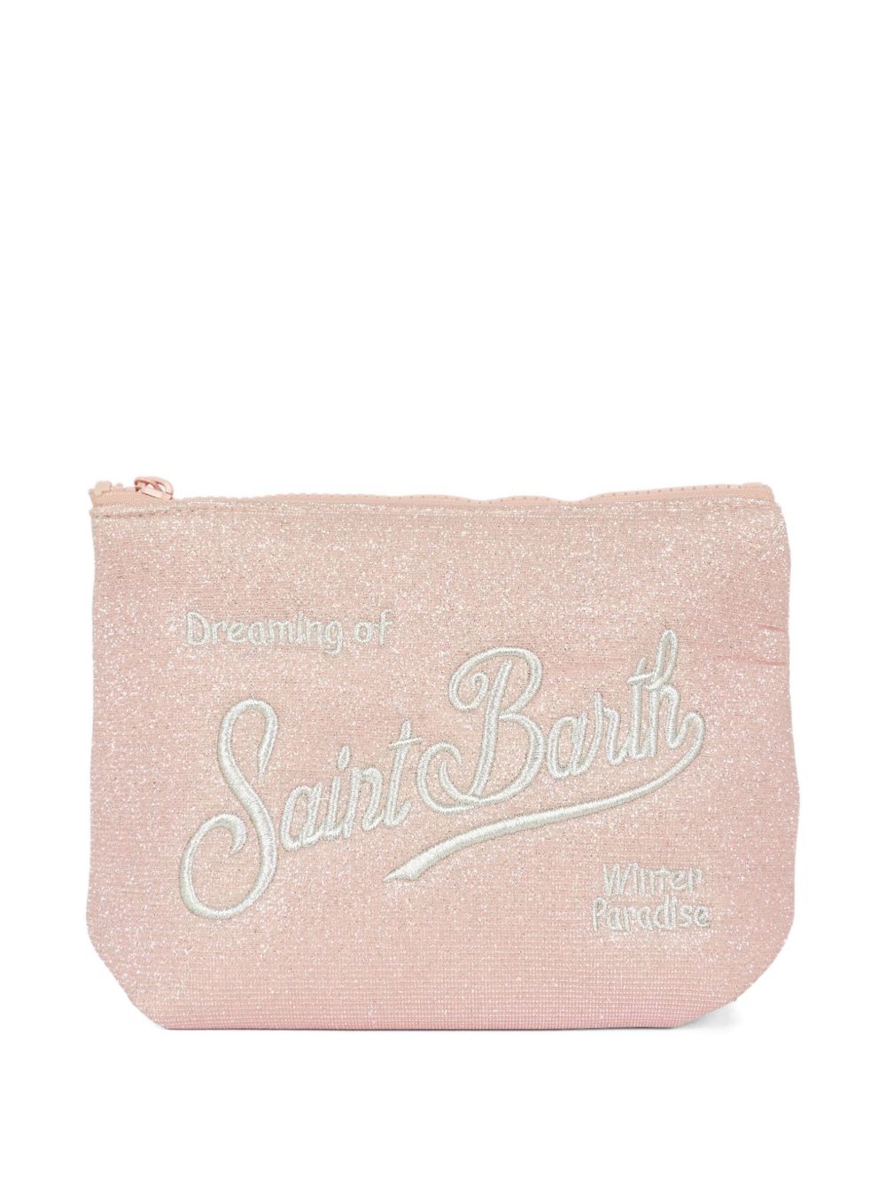 pink glitter finish embroidered lettering zip fastening wrist strap rectangular shape