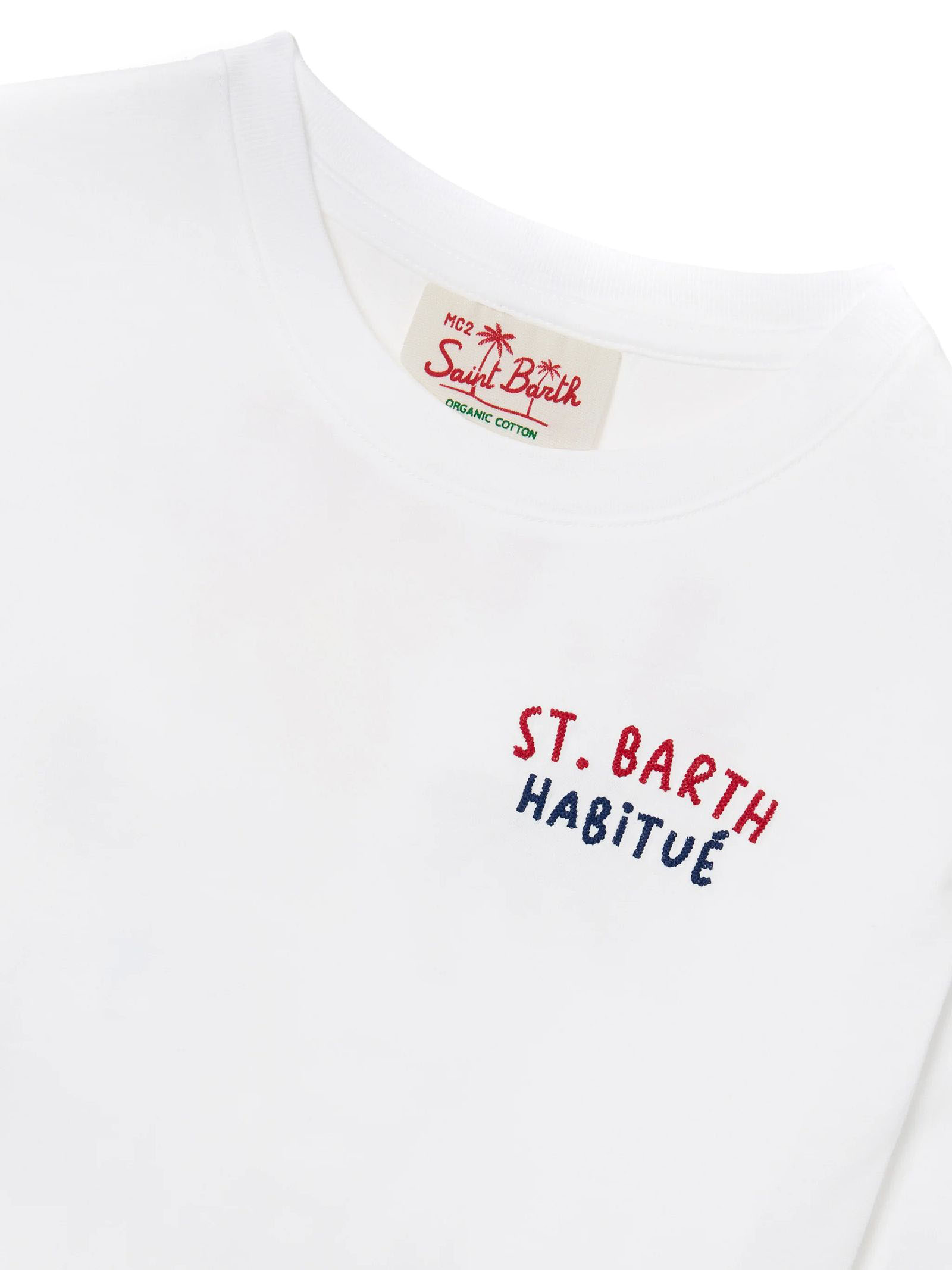 Portland Jr T-shirt in pure cotton jersey, white, beach print on the back, Habitué text on the back, Habitué embroidery on the chest, contrasting St. Barth embroidery on the sleeve, ribbed crew neck, short sleeves, straight cut, regular fit