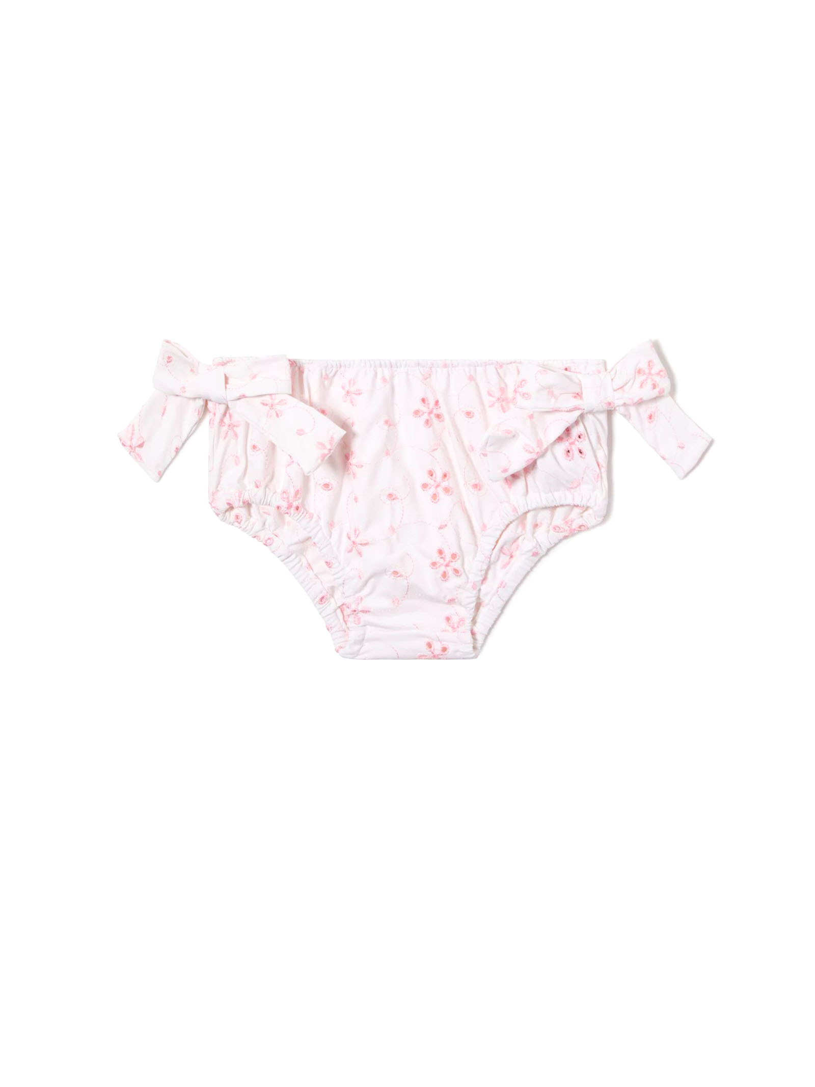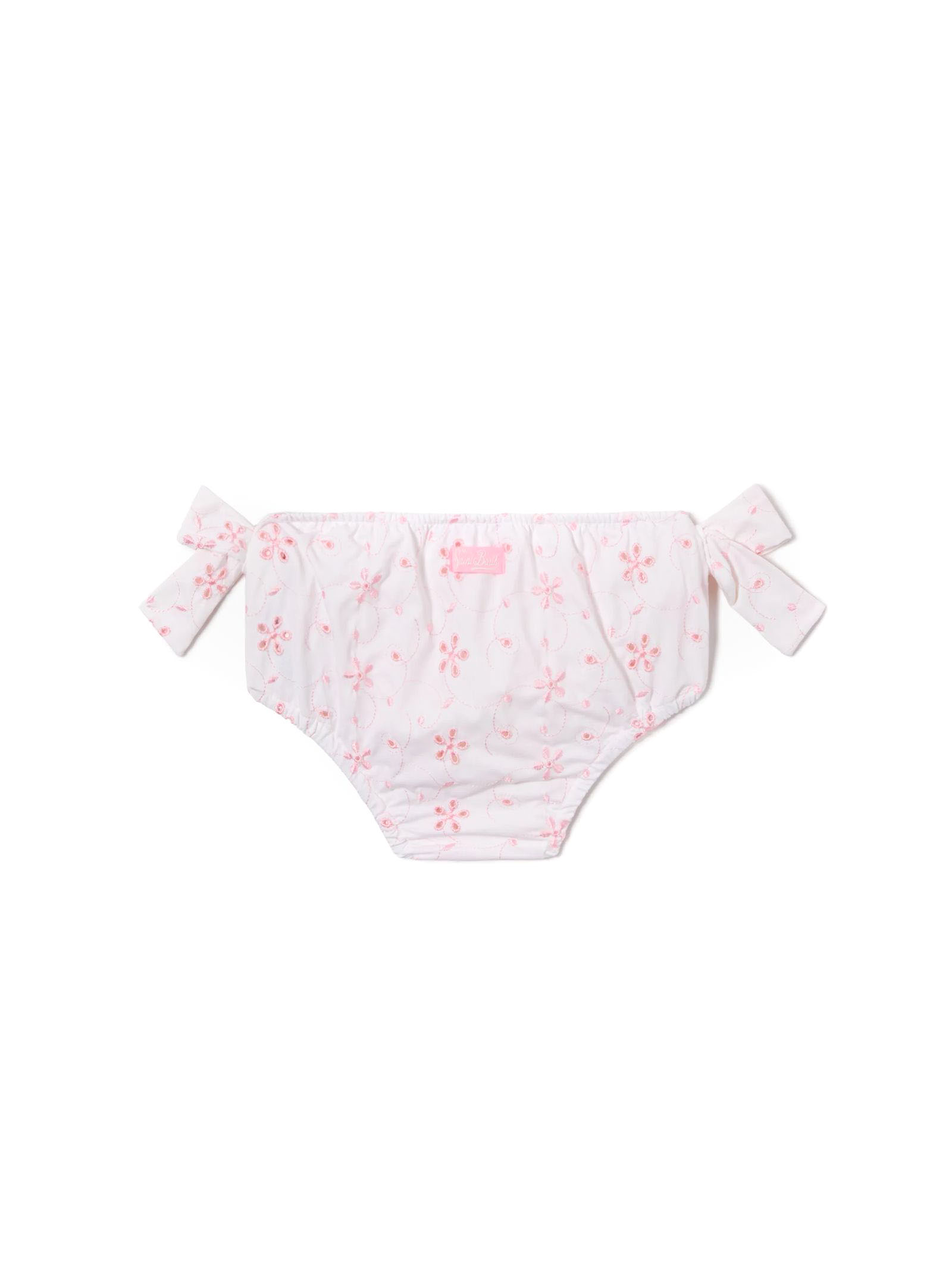 Rainbow Baby Girl Swim Diaper Cover, White, Broderie Anglaise, Floral Print, Decorative Bows at the Waist, Elastic Waistband, Elastic Leg Openings, Lightweight Fabric, Comfortable Fit