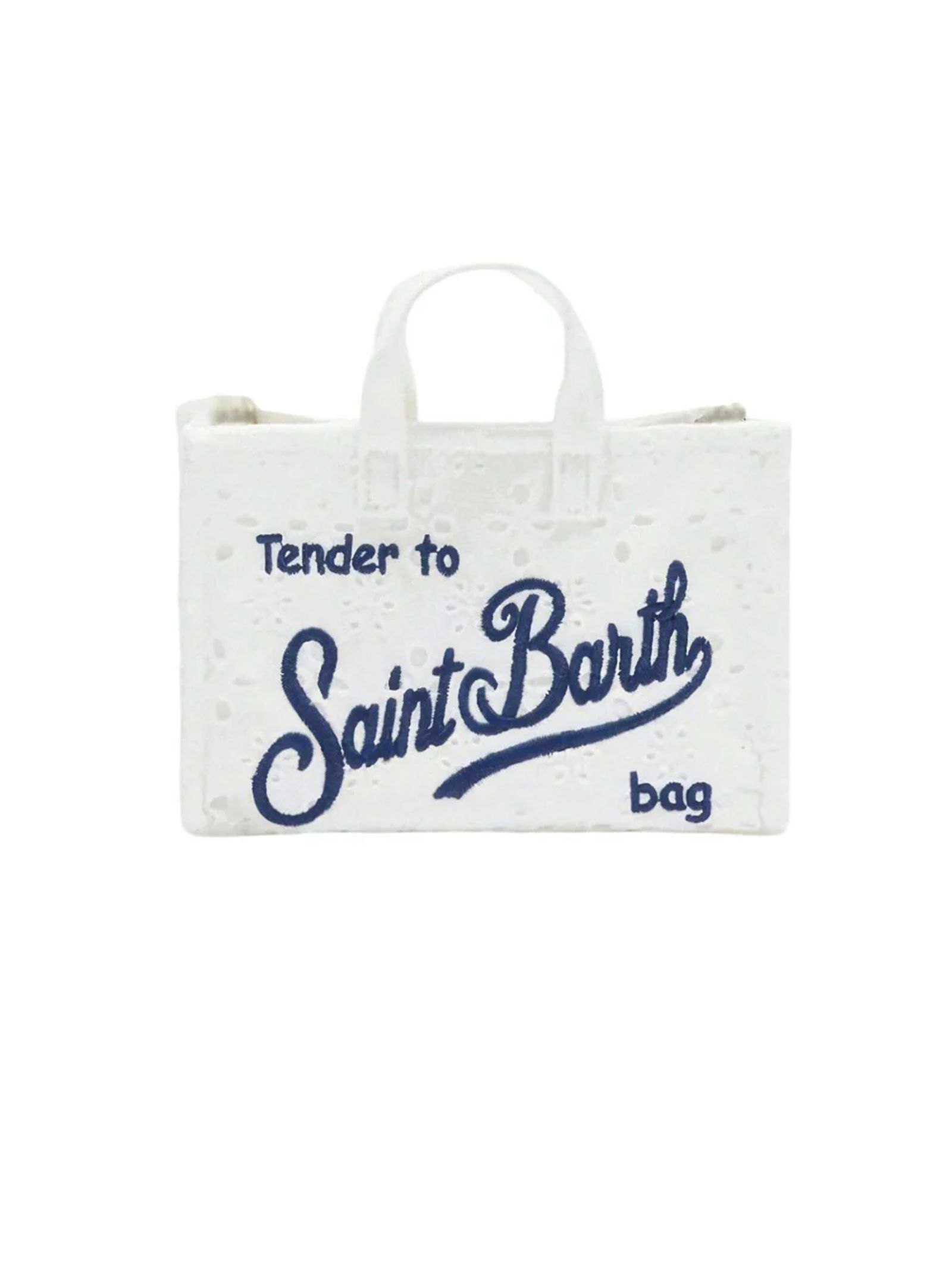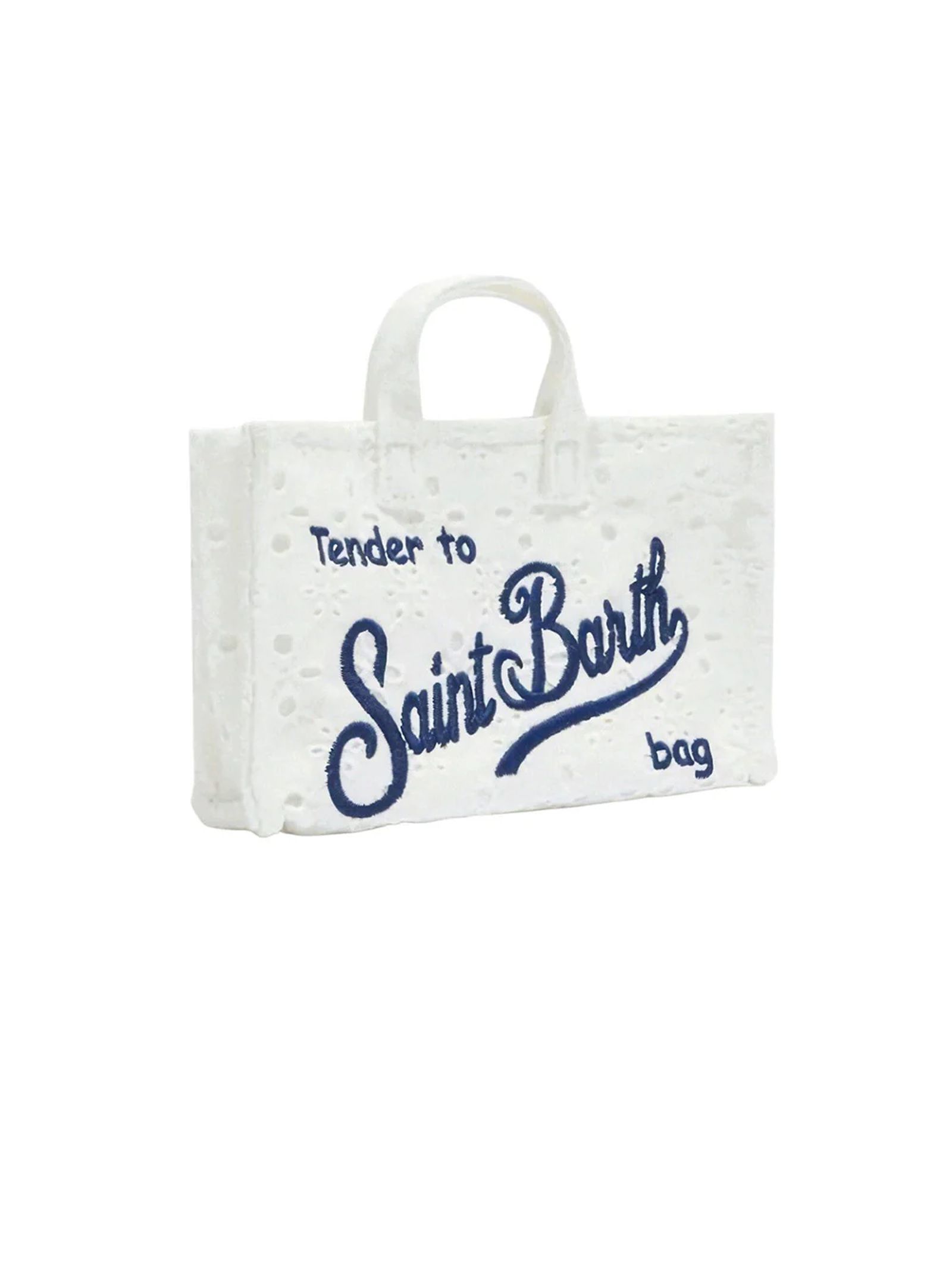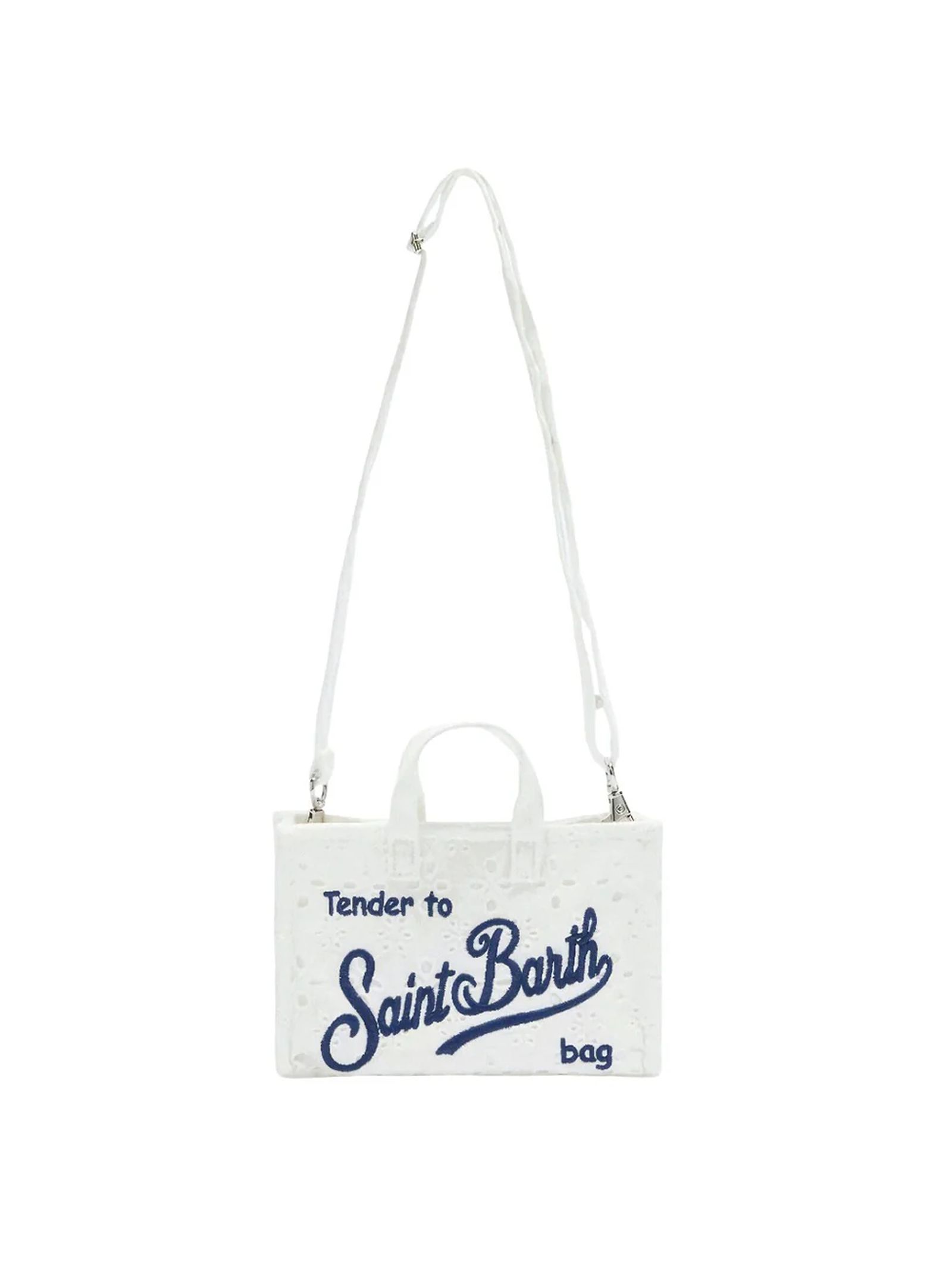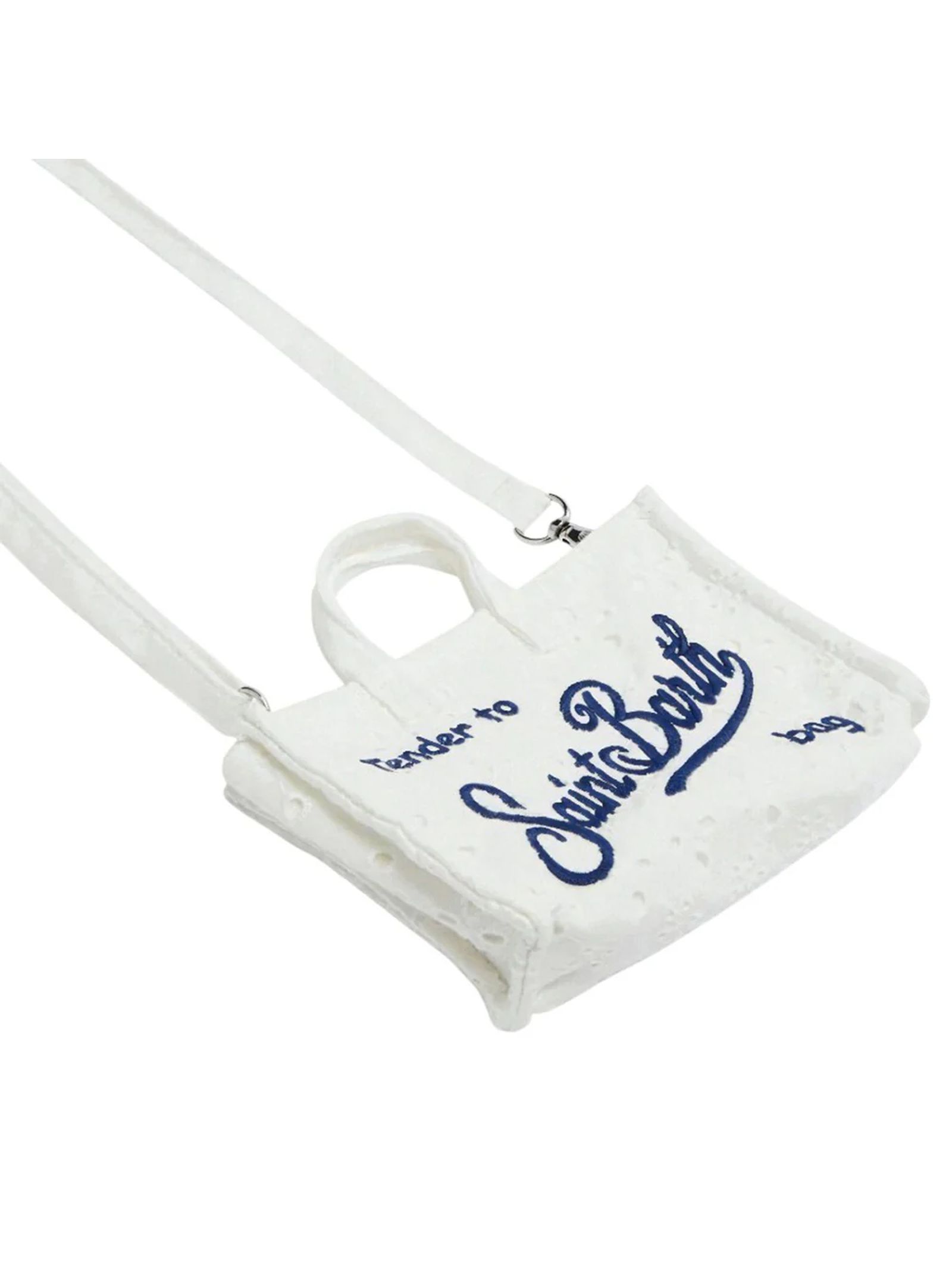 White Sangallo Phone Bag with shoulder strap, magnetic closure for added security, exclusive embroidered Saint Barth logo, removable shoulder strap for dual use: shoulder bag or mini clutch, dimensions: 15 x 10 x 3.5 cm