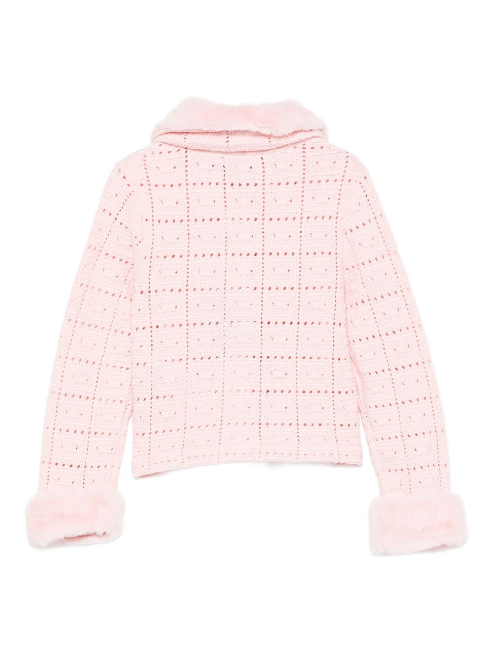 pink faux-fur collar open knit embellished buttons long sleeves faux-fur cuffs
