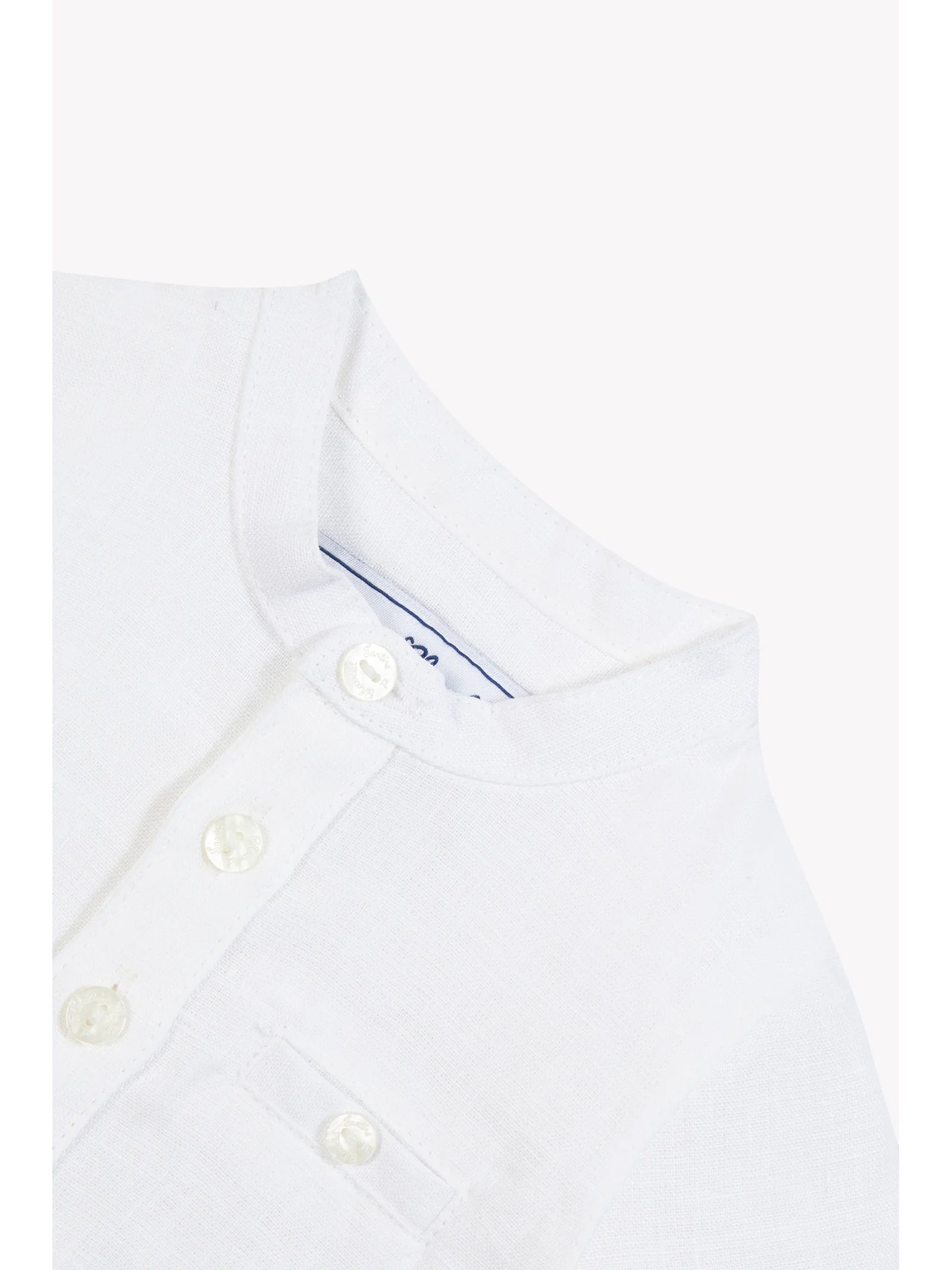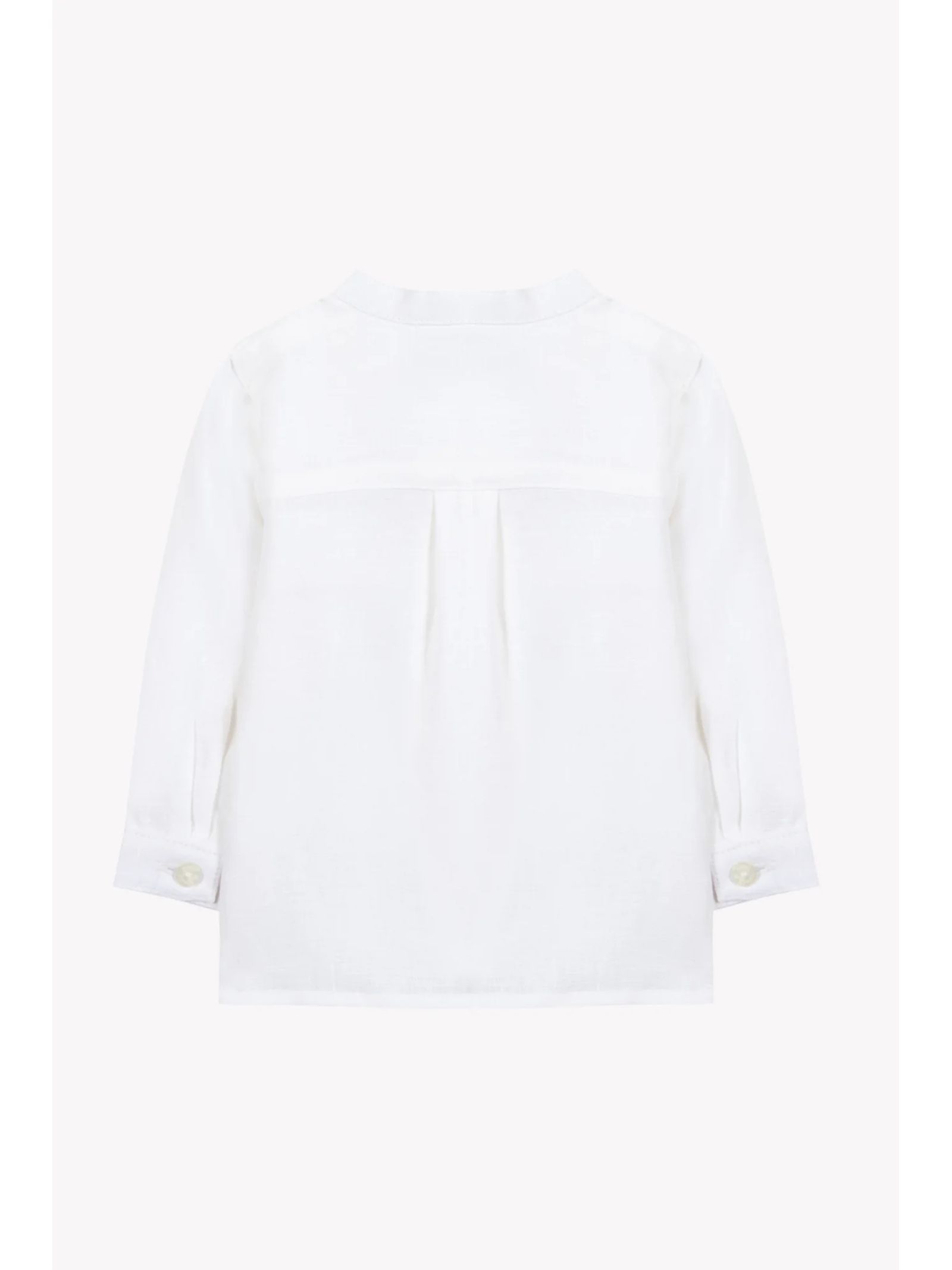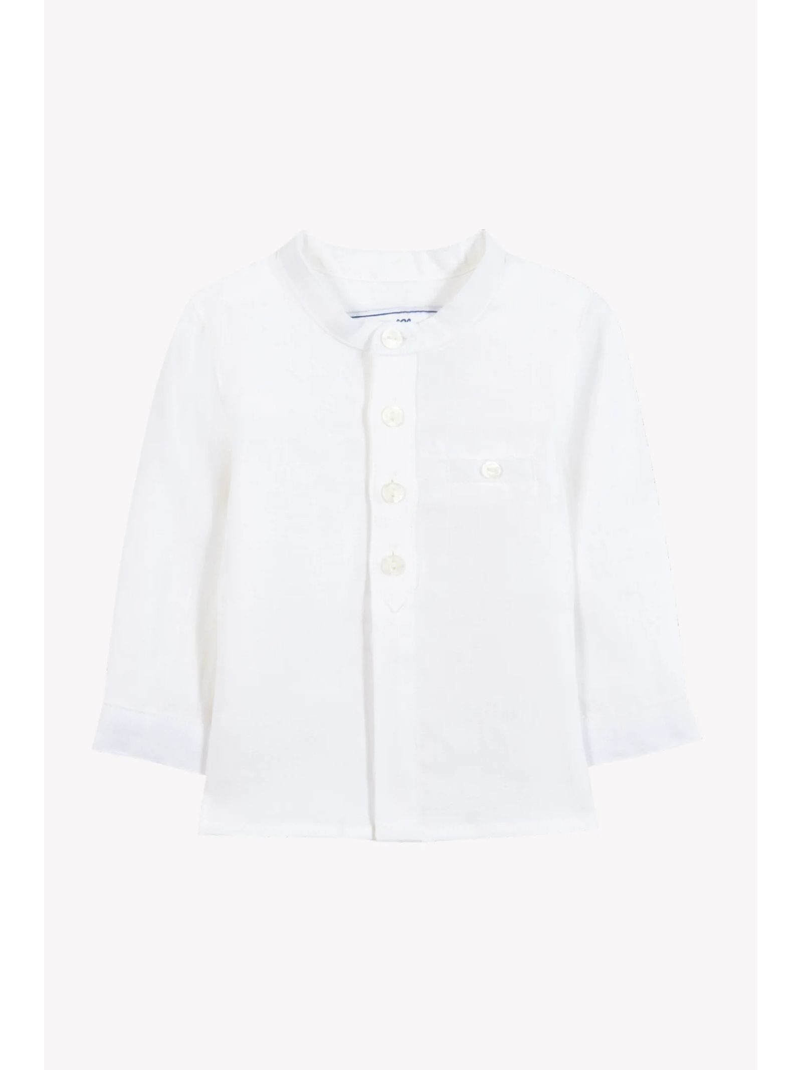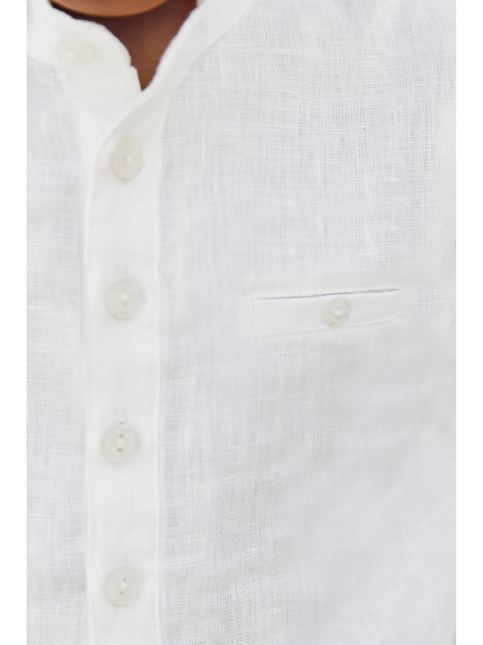 White linen shirt with a mandarin collar and long sleeves for extra coverage, perfect for formal occasions