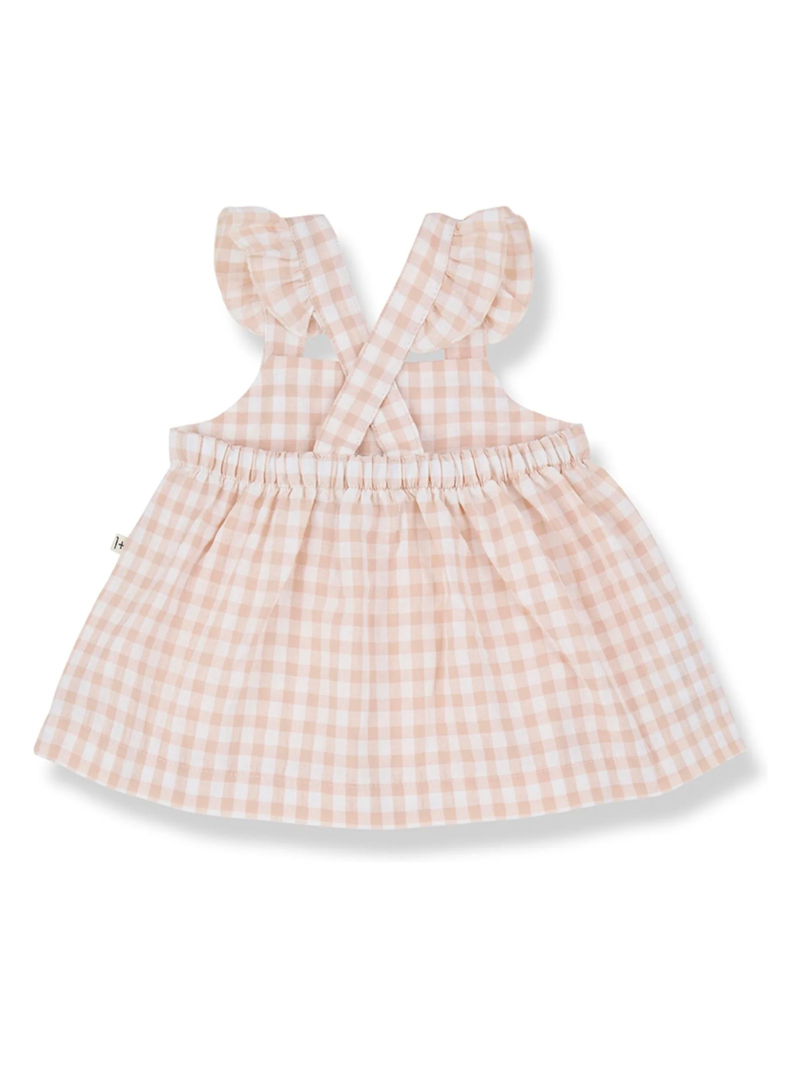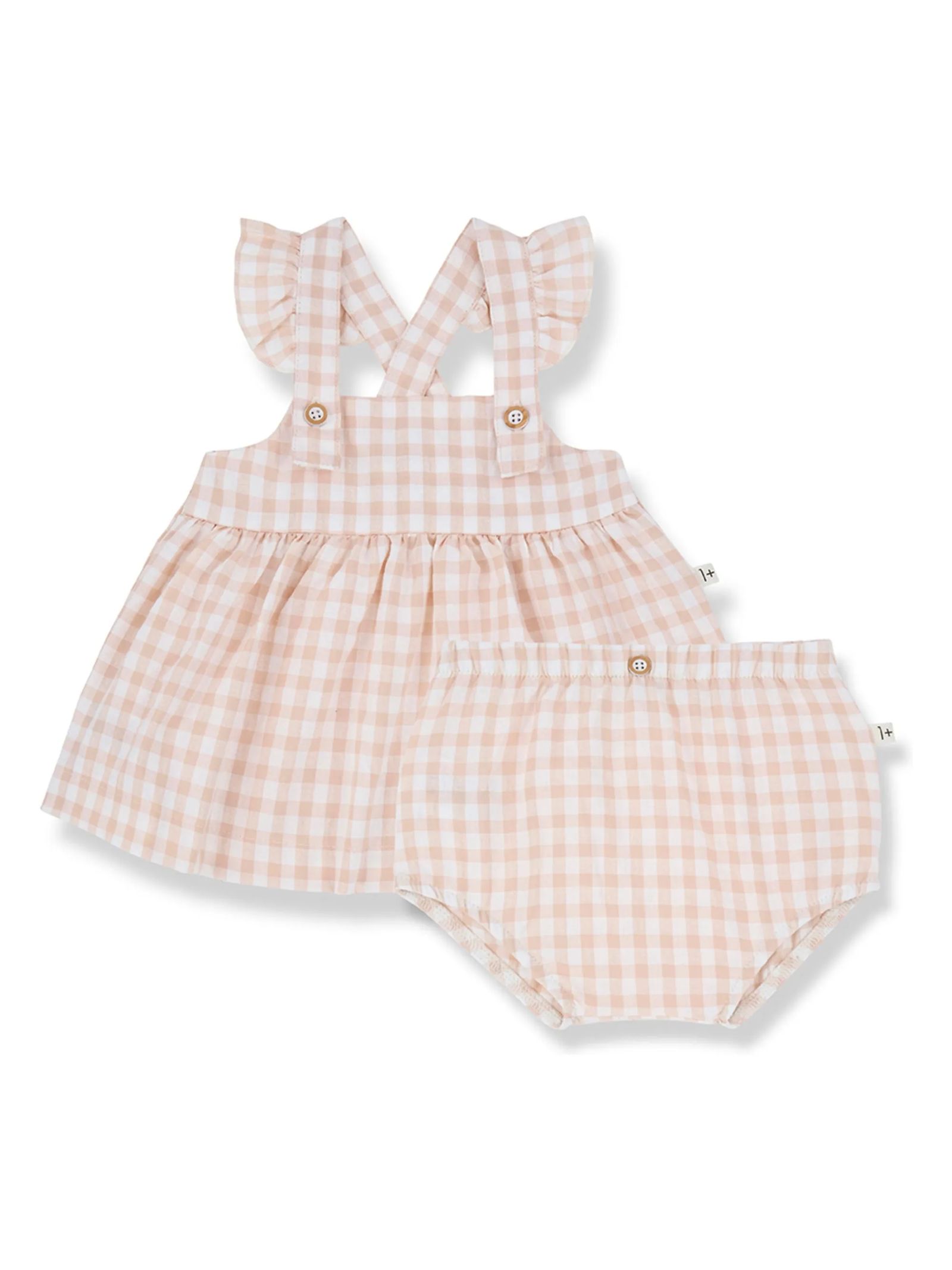 Abito in cotone bianco e rosa confezione da due pezzi: abito + bloomer, spalline arricciate fissate con bottoni in legno, morbido elastico sul retro dell'abito, vita e gambe del bloomer con elastico, bottone decorativo in legno sulla cintura