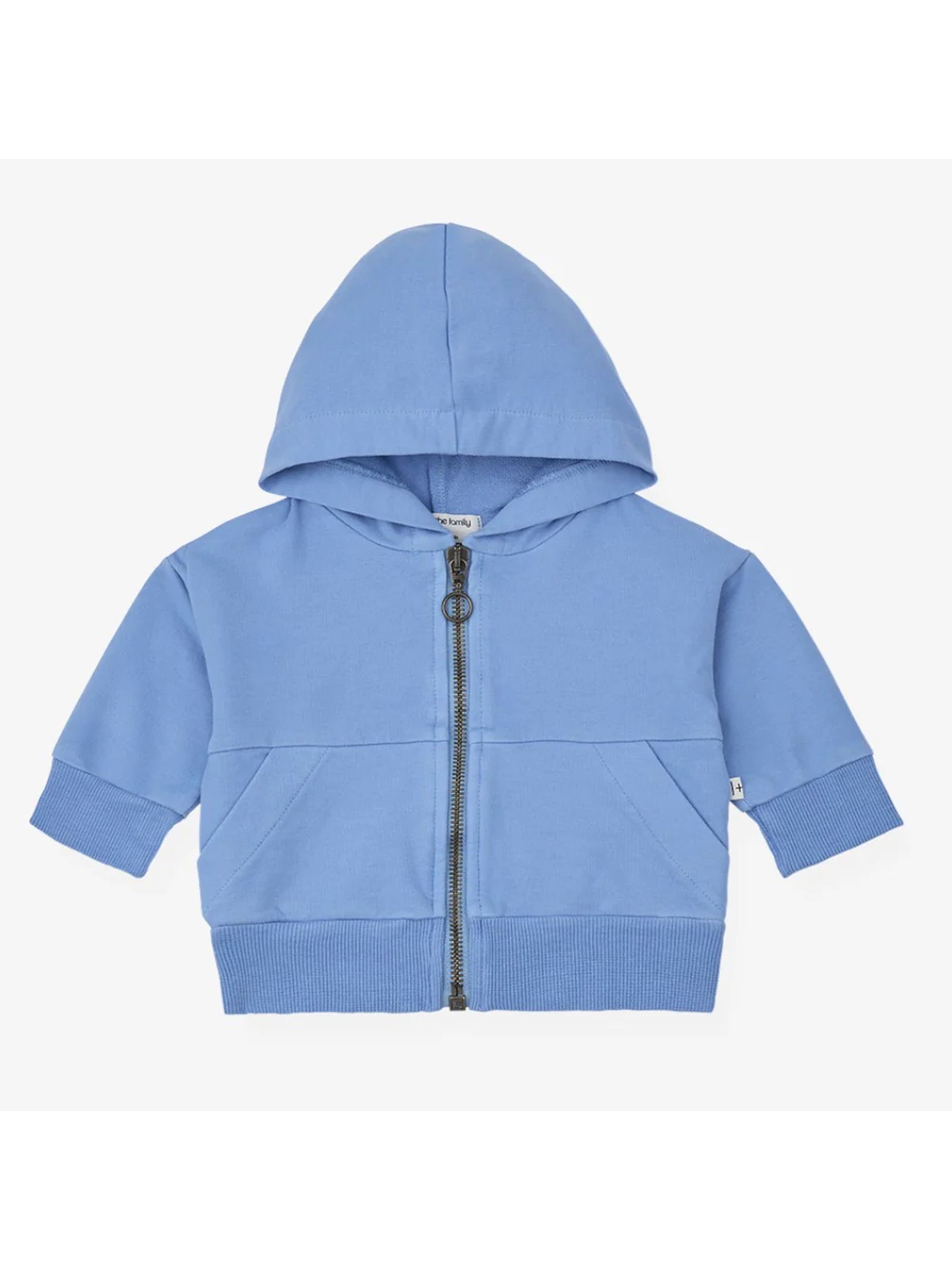 Felpa con cappuccio in cotone blu, tessuto morbido e confortevole, chiusura con cerniera senza nichel, polsini e orlo a costine, piedini funzionali sul davanti