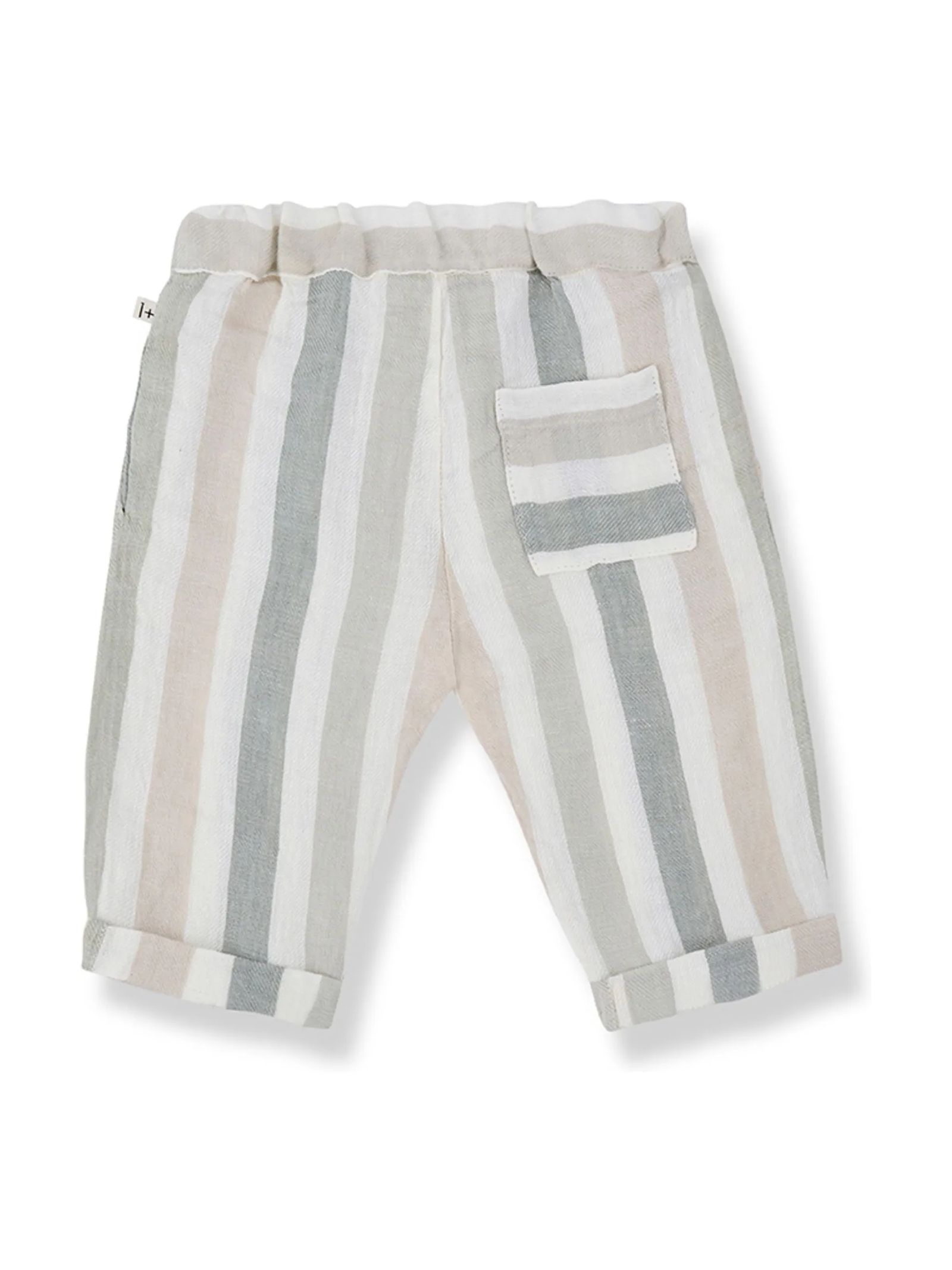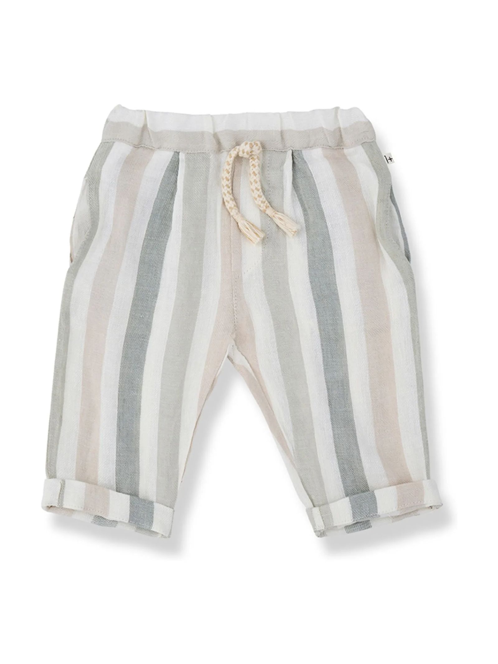 Pantalone in lino beige con design a righe, morbido elastico in vita per una vestibilità comoda, coulisse decorativa in vita, tasche funzionali in cucitura laterale, tasca posteriore a righe orizzontali