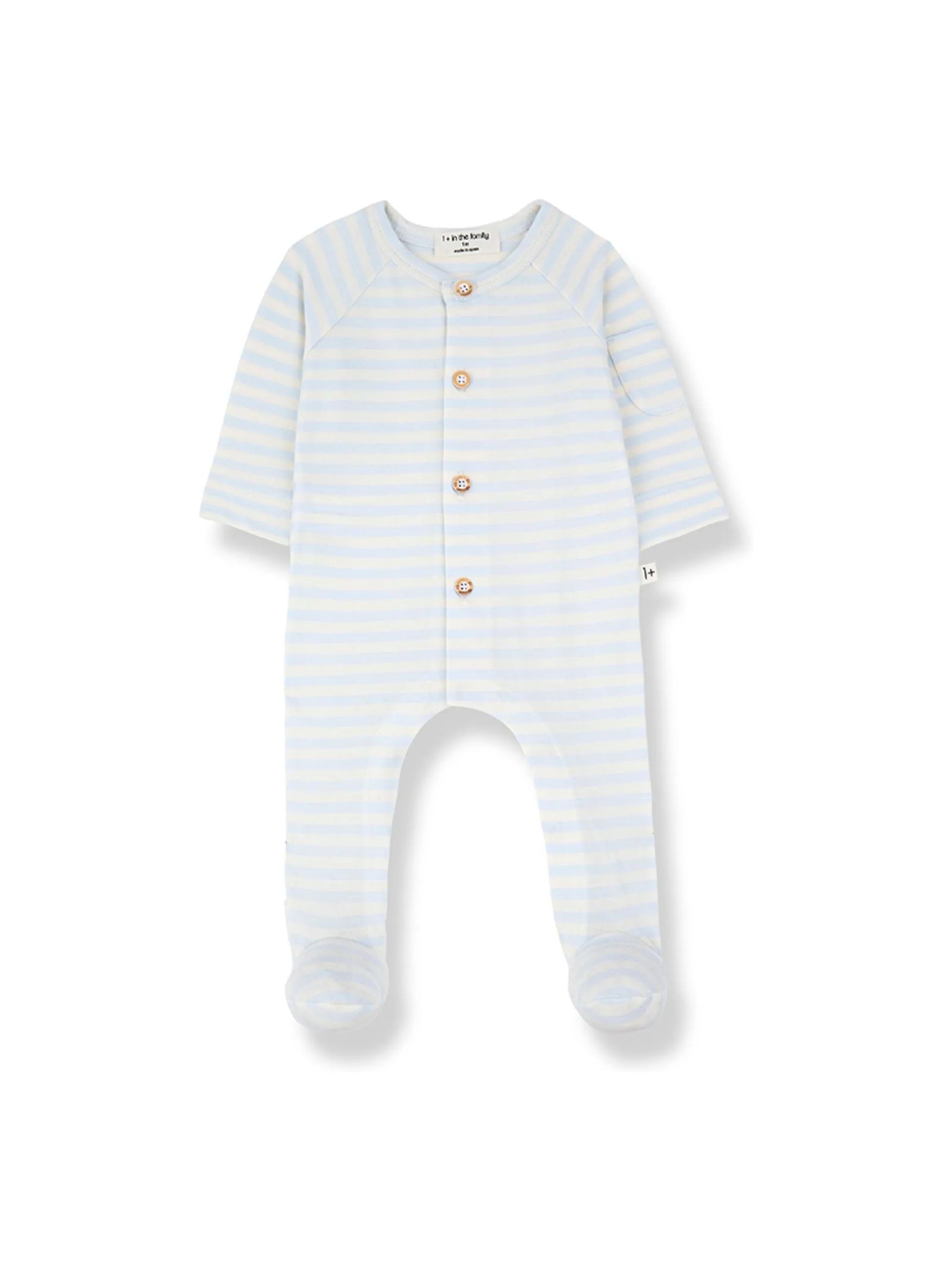 Tutina a righe in cotone bianco e blu, fibra sostenibile + tessuto extra morbido, fibra modale regola la temperatura corporea, chiusura frontale con bottoni in legno, piccola tasca sulla manica sinistra, bottoni automatici senza nichel intorno al cavallo,