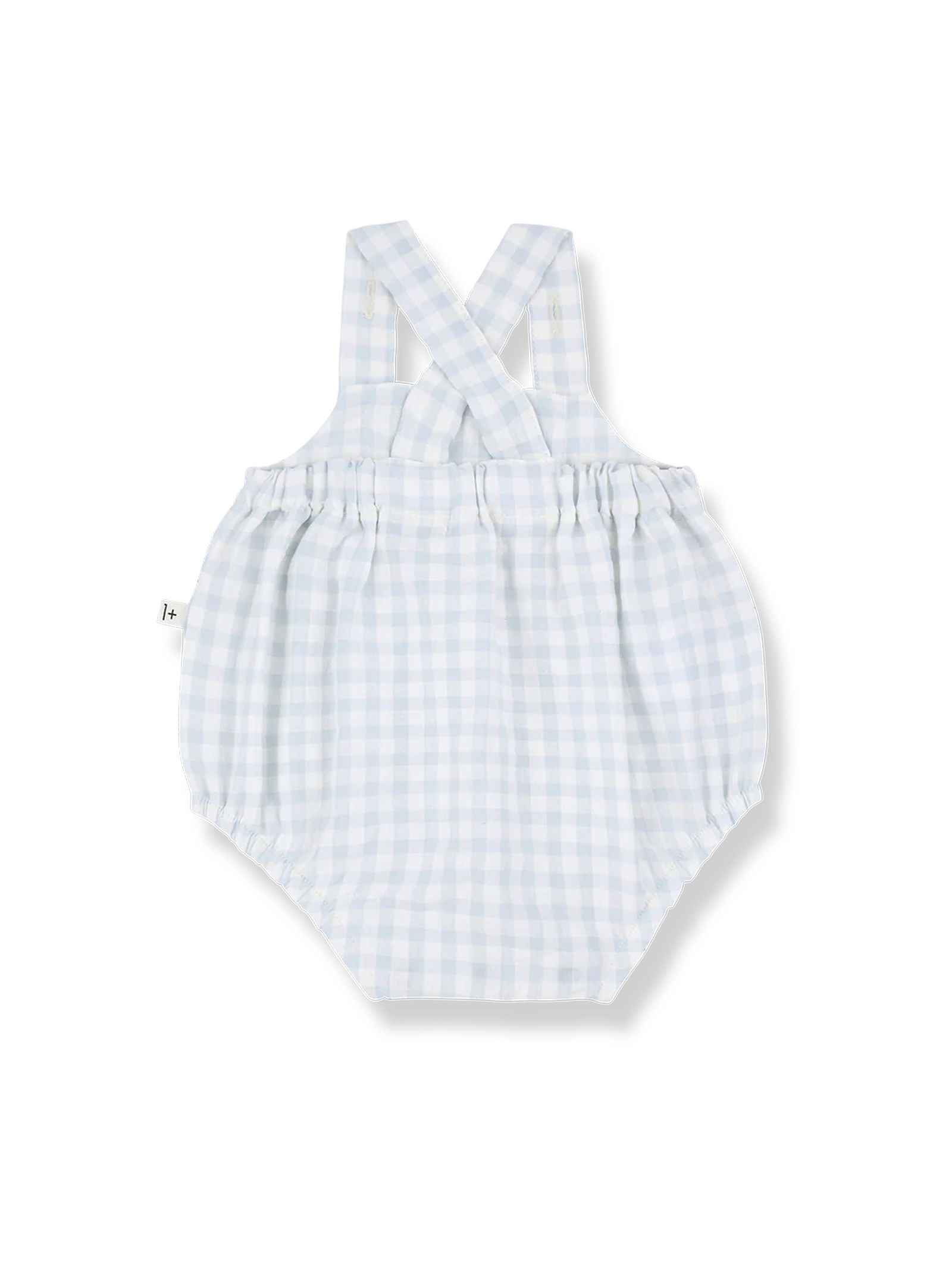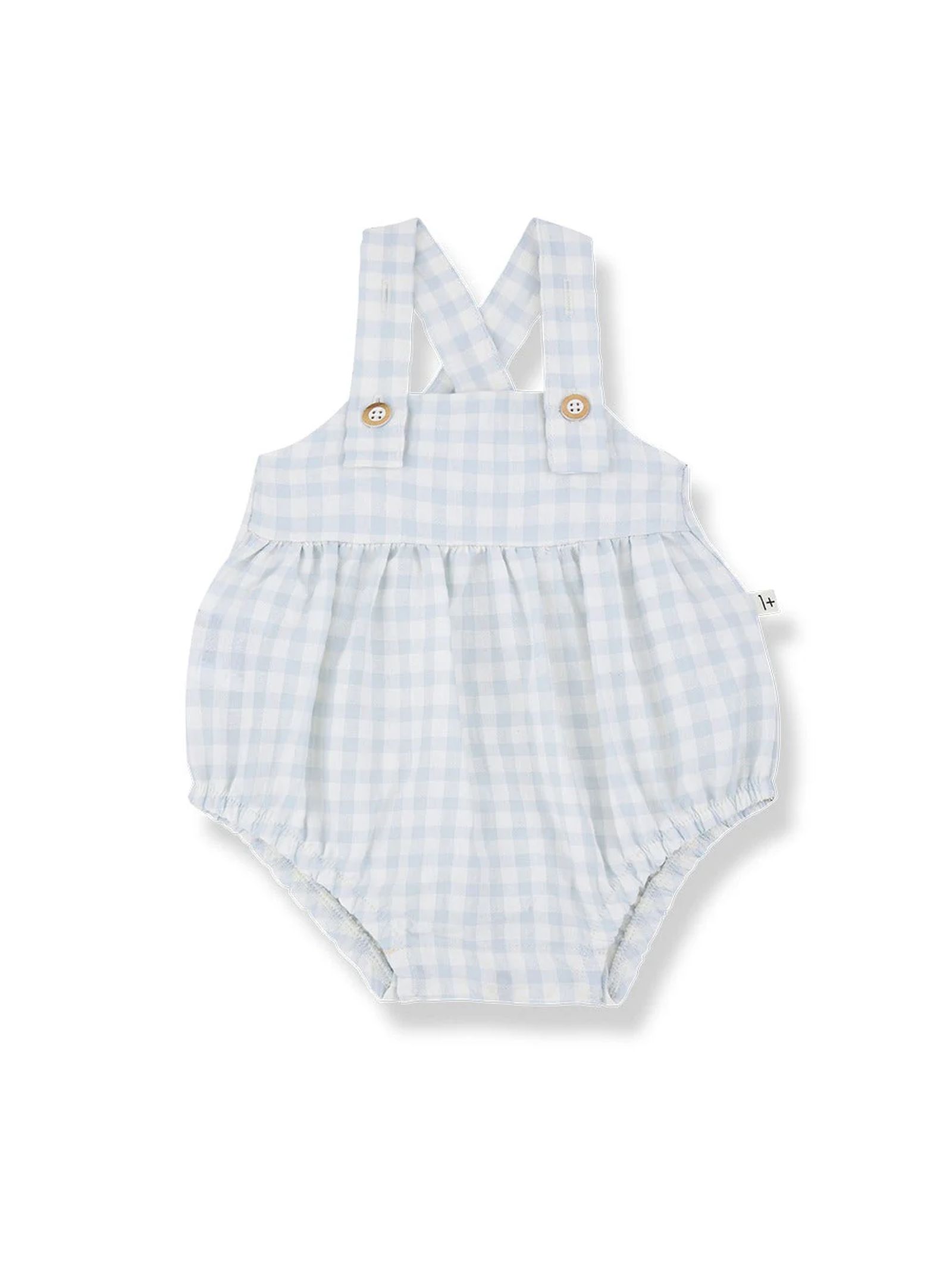 Tutina per neonati in misto cotone a quadretti, in una tonalità di blu nebbia, con spalline incrociate sul retro e dettagli con bottoni
