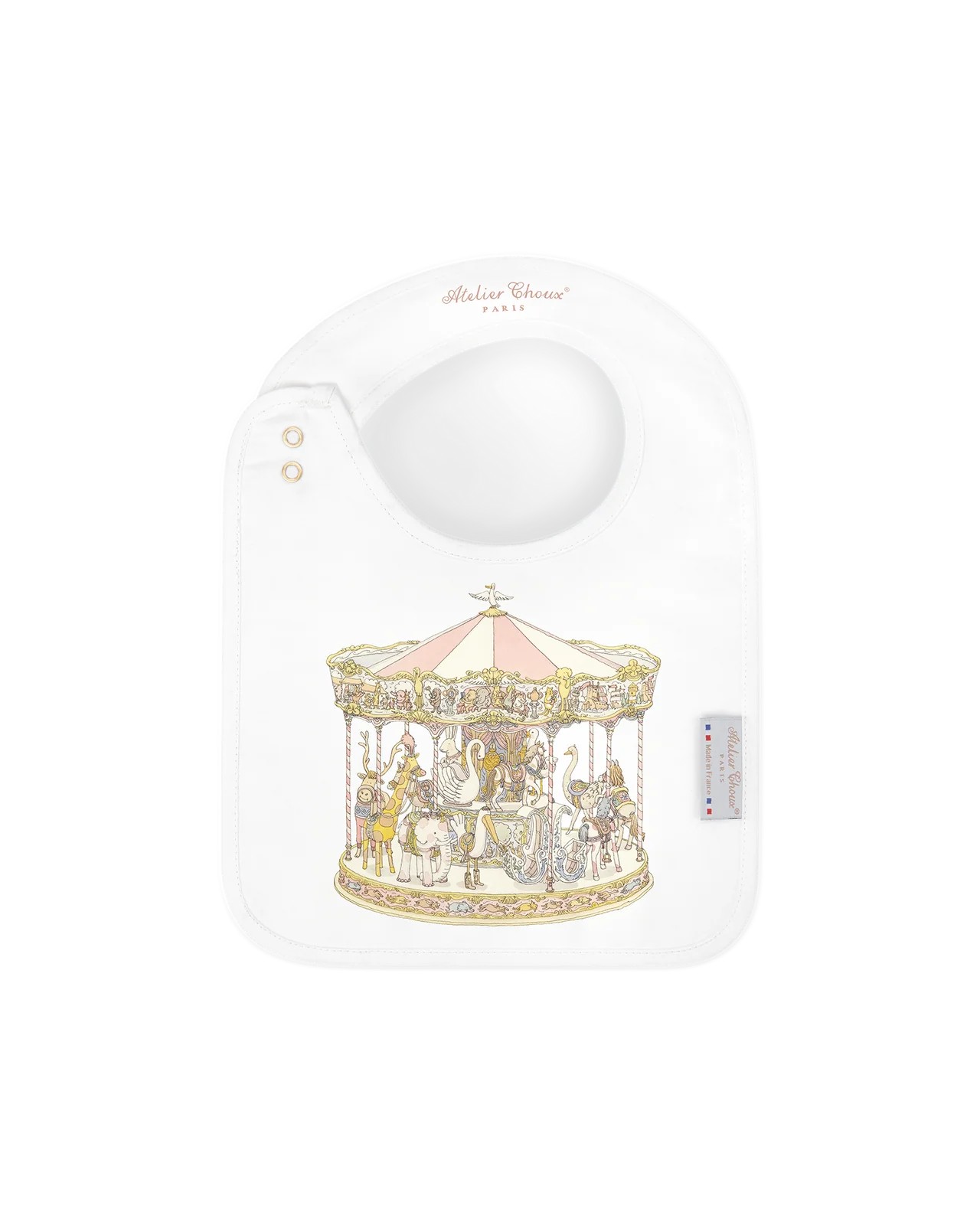 Il bavaglino in raso Atelier Choux - Carousel Pink è un accessorio elegante e indispensabile che dona un tocco di raffinatezza ai pasti, alla fase della dentizione e alle giornate fuori casa. Ideale per proteggere i vestitini delicati, raccogliere piccole macchie o aggiungere un tocco chic a qualsiasi look, offre eleganza e praticità per tutto il giorno.Reversibile e decorato con illustrazioni originali su entrambi i lati, il bavaglino Atelier Choux unisce praticità e fascino artistico. Il bavaglino è regolabile e presenta bottoni a pressione dorati con logo. Consigliato dalla nascita fino a 24 mesi.