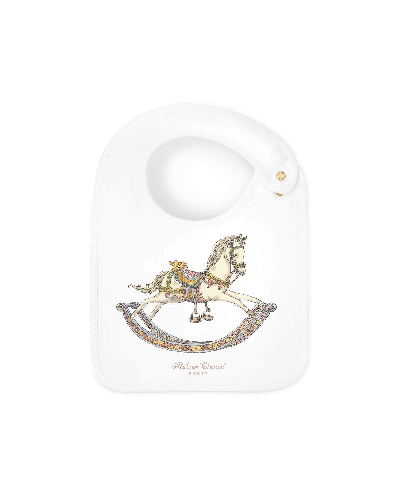 Il bavaglino in raso Atelier Choux - Cavallo a Dondolo è un accessorio elegante e indispensabile che dona un tocco di raffinatezza ai pasti, alla fase della dentizione e alle giornate fuori casa. Ideale per proteggere i vestitini delicati, raccogliere piccole macchie o aggiungere un tocco chic a qualsiasi look, offre eleganza e praticità per tutto il giorno.Reversibile e decorato con illustrazioni originali su entrambi i lati, il bavaglino Atelier Choux unisce praticità e fascino artistico. Il bavaglino è regolabile e presenta bottoni a pressione dorati con logo. Consigliato dalla nascita fino a 24 mesi.