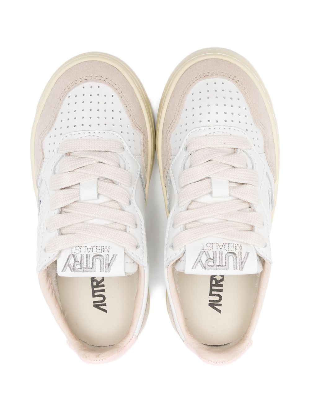 tomaia in pelle bianco sporco, linguetta sul tallone in pelle scamosciata, dettagli traforati, suola giallo pallido, chiusura con lacci.