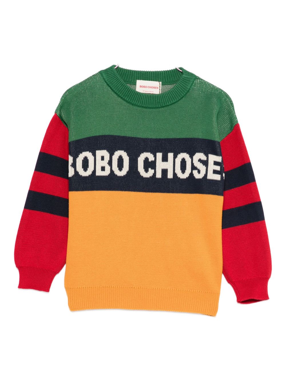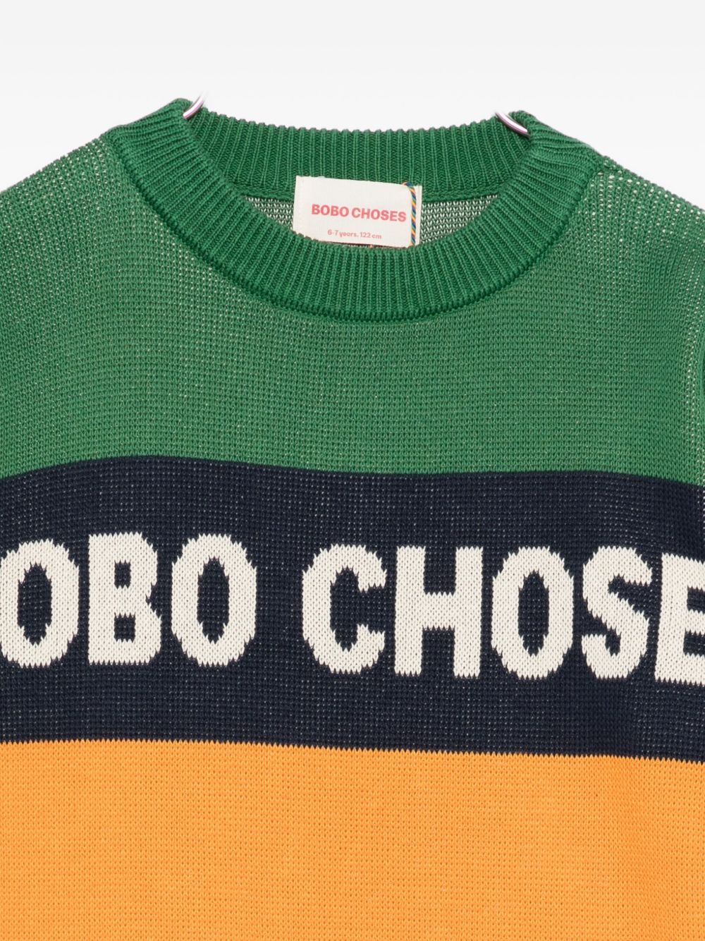 maniche a righe verdi rosse e nere, bande colorate orizzontali, girocollo, logo jacquard