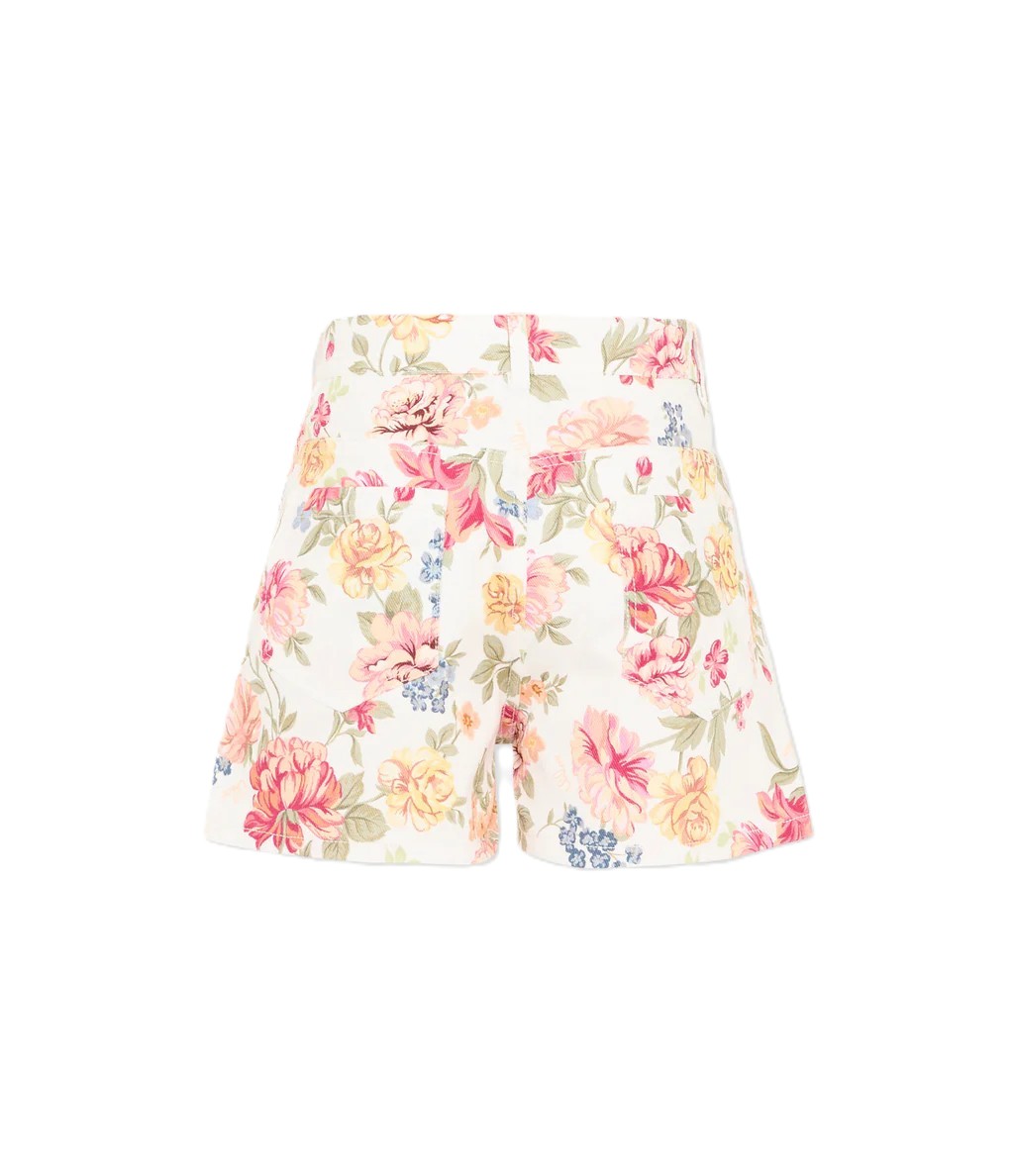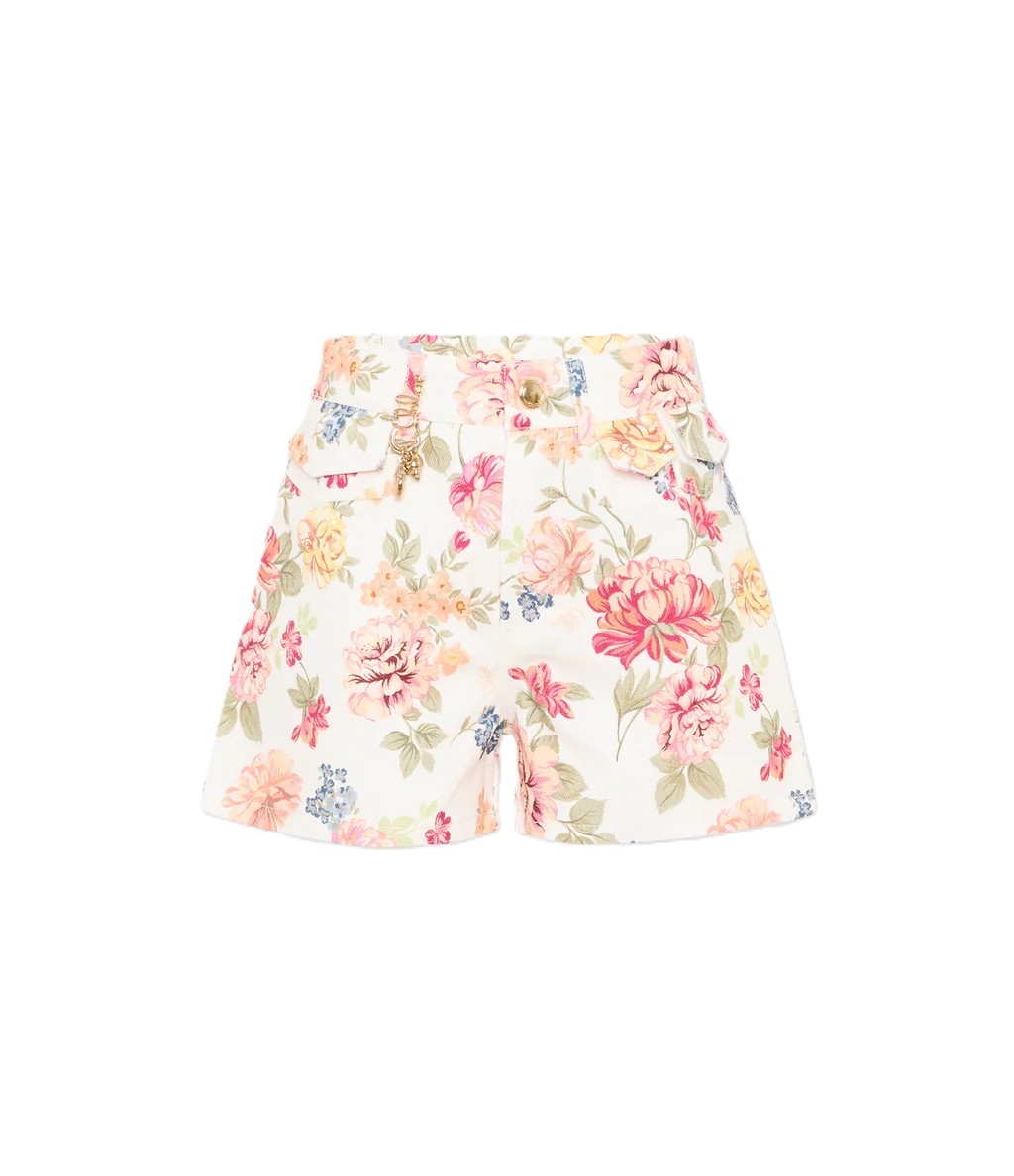 Shorts in twill di cotone Chloé Kids con stampa floreale all-over su base chiara, caratterizzati da vita regolare con passanti e pratica regolazione interna con elastico e bottone. Il modello presenta tasche frontali e posteriori applicate, arricchite da un piccolo charm logo dorato che richiama lestetica raffinata della maison. Linea leggermente svasata e mano morbida del tessuto creano un effetto femminile e raffinato sullinsieme del motivo a fiori.