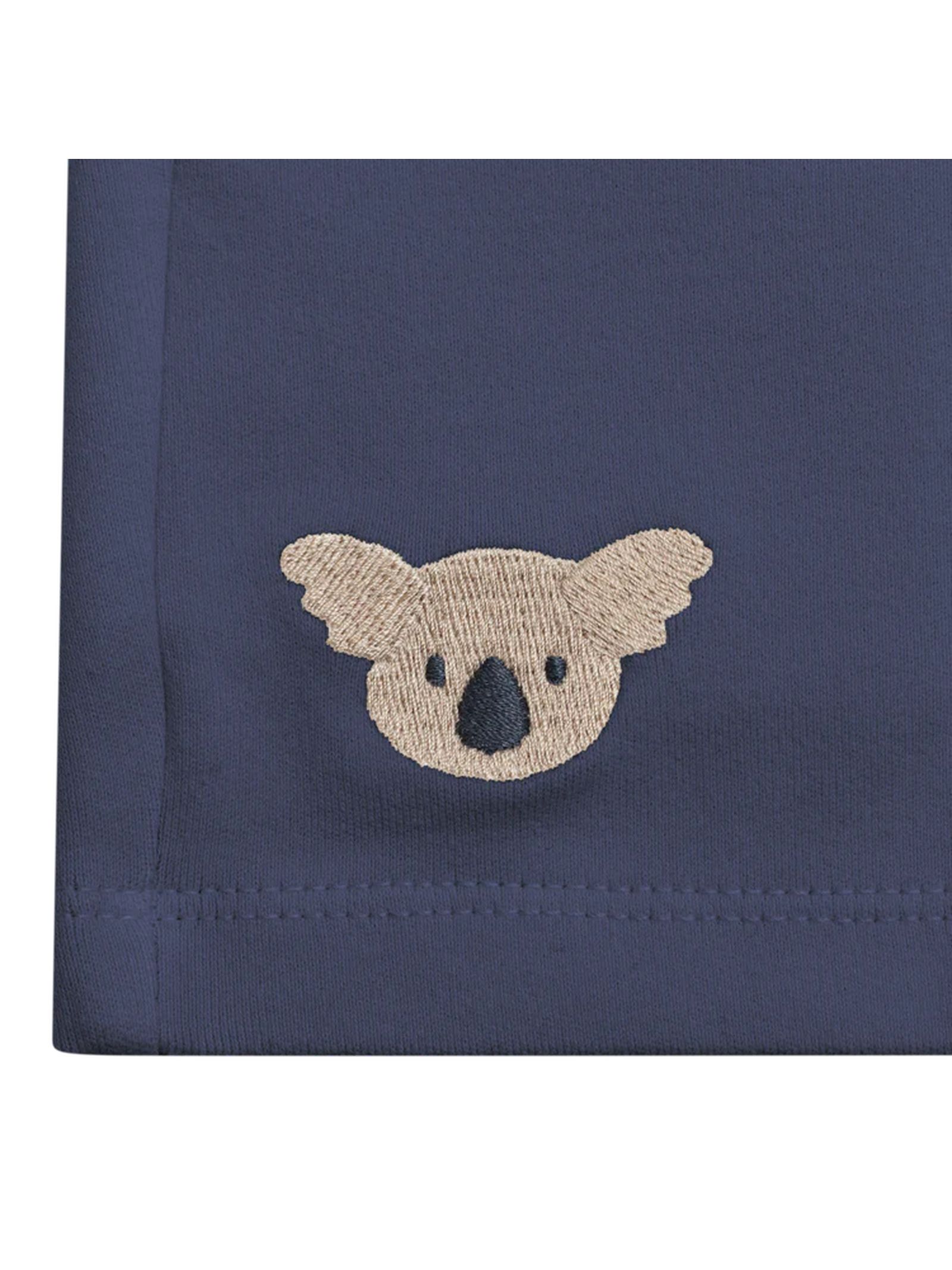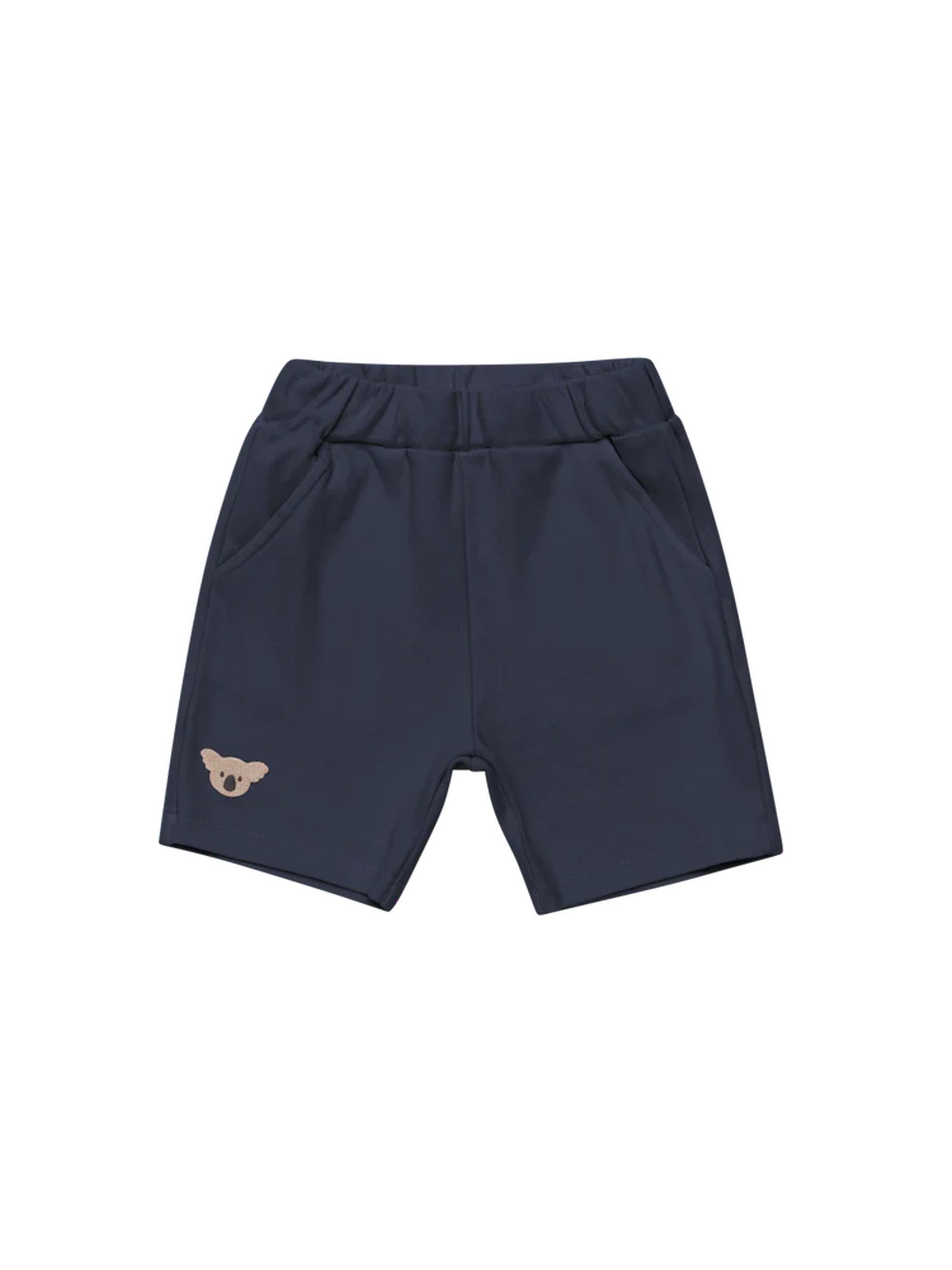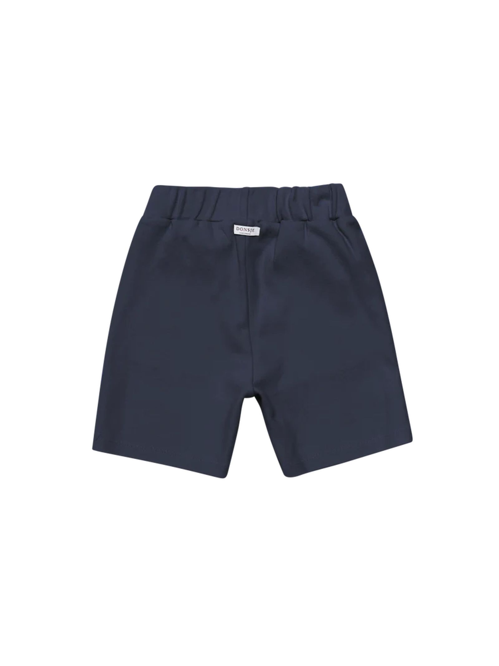 Bermuda blu in cotone, con elastico in vita, tasche laterali e il caratteristico personaggio ricamato Donsje che aggiunge un tocco di fascino in più