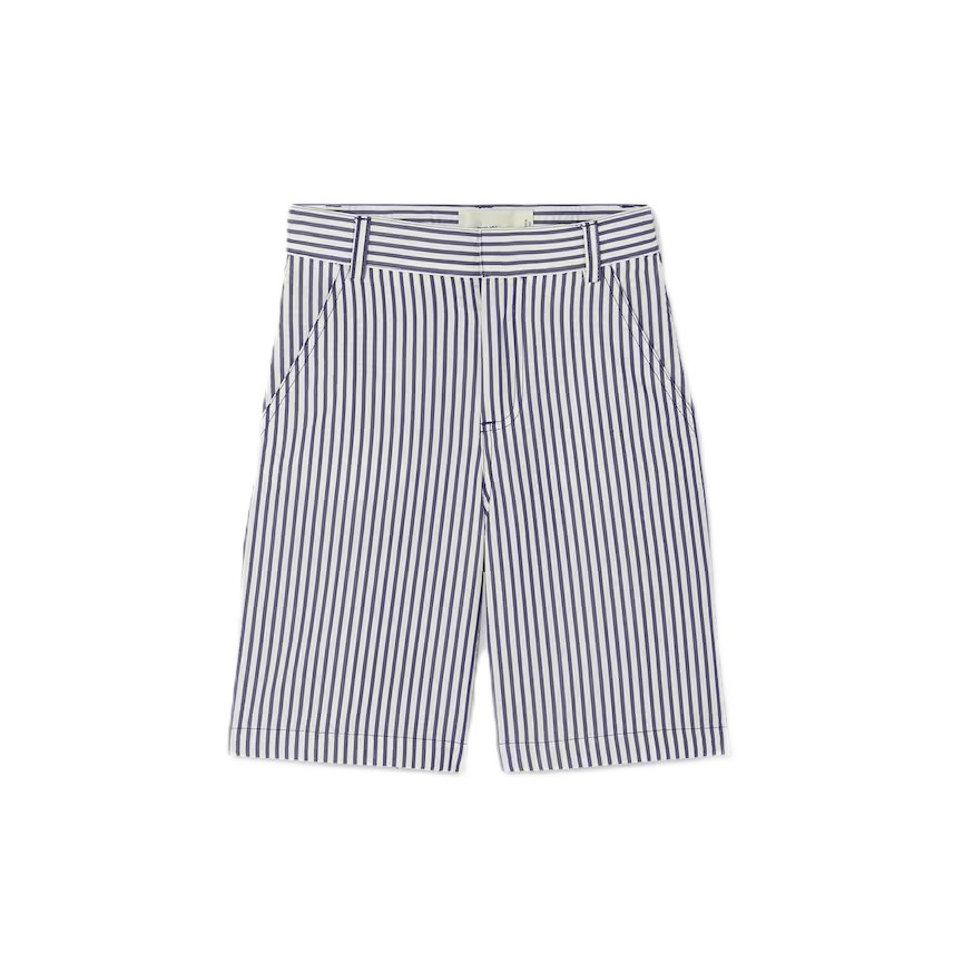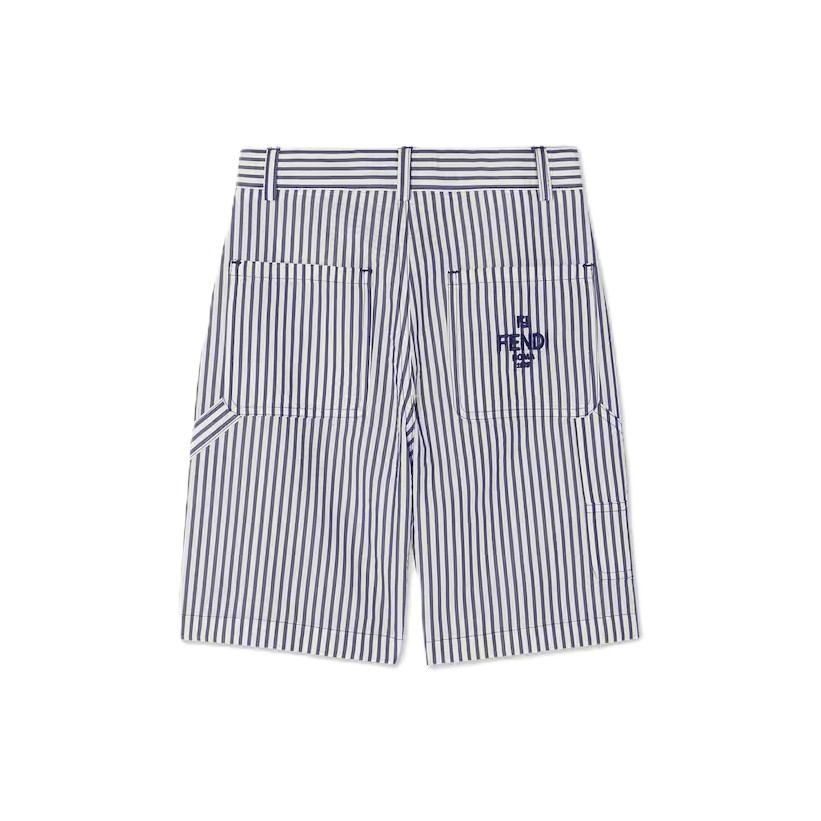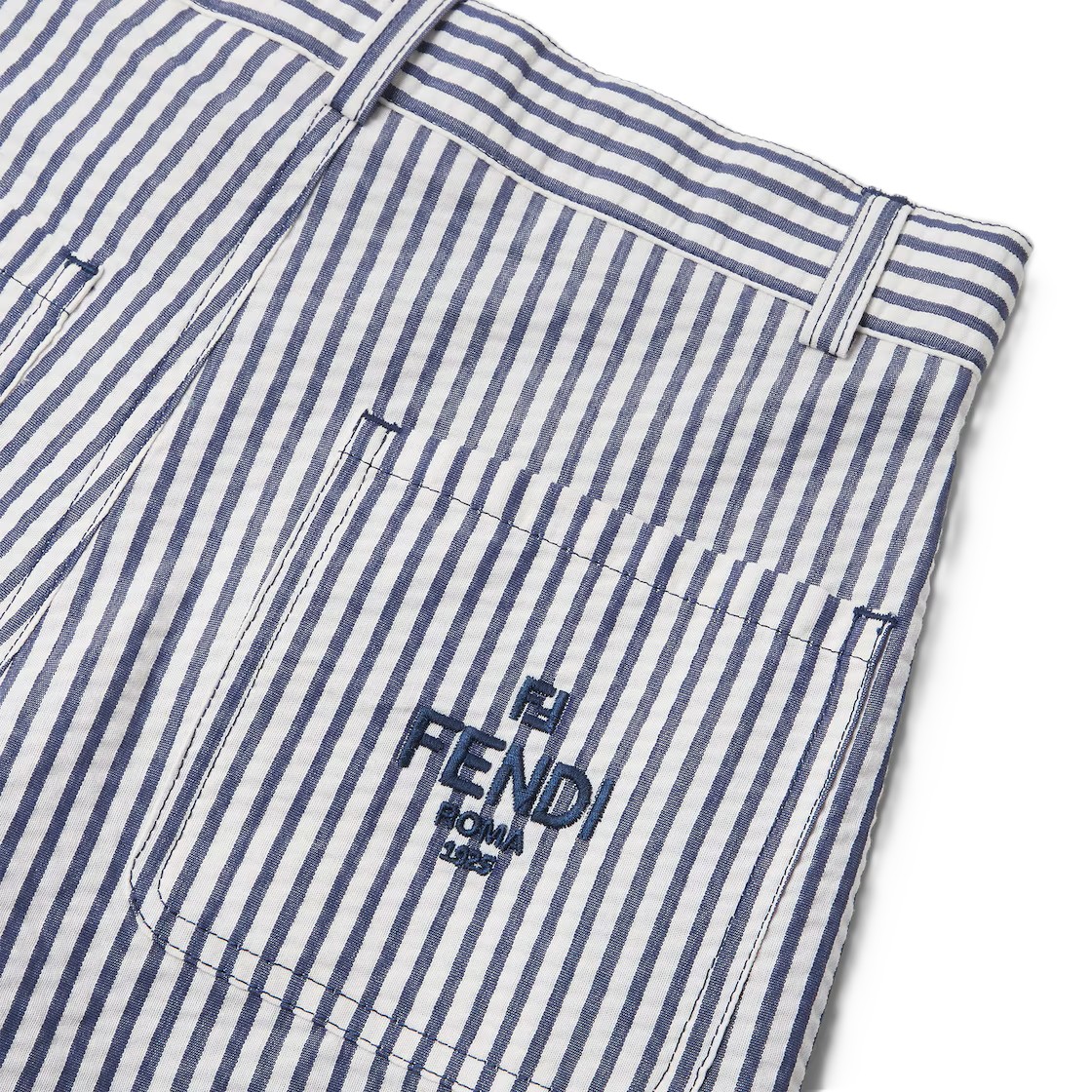 Bermuda junior in seersucker a righe bianche e blu con tasche laterali e ricamo Fendi blu sulla tasca dietro.