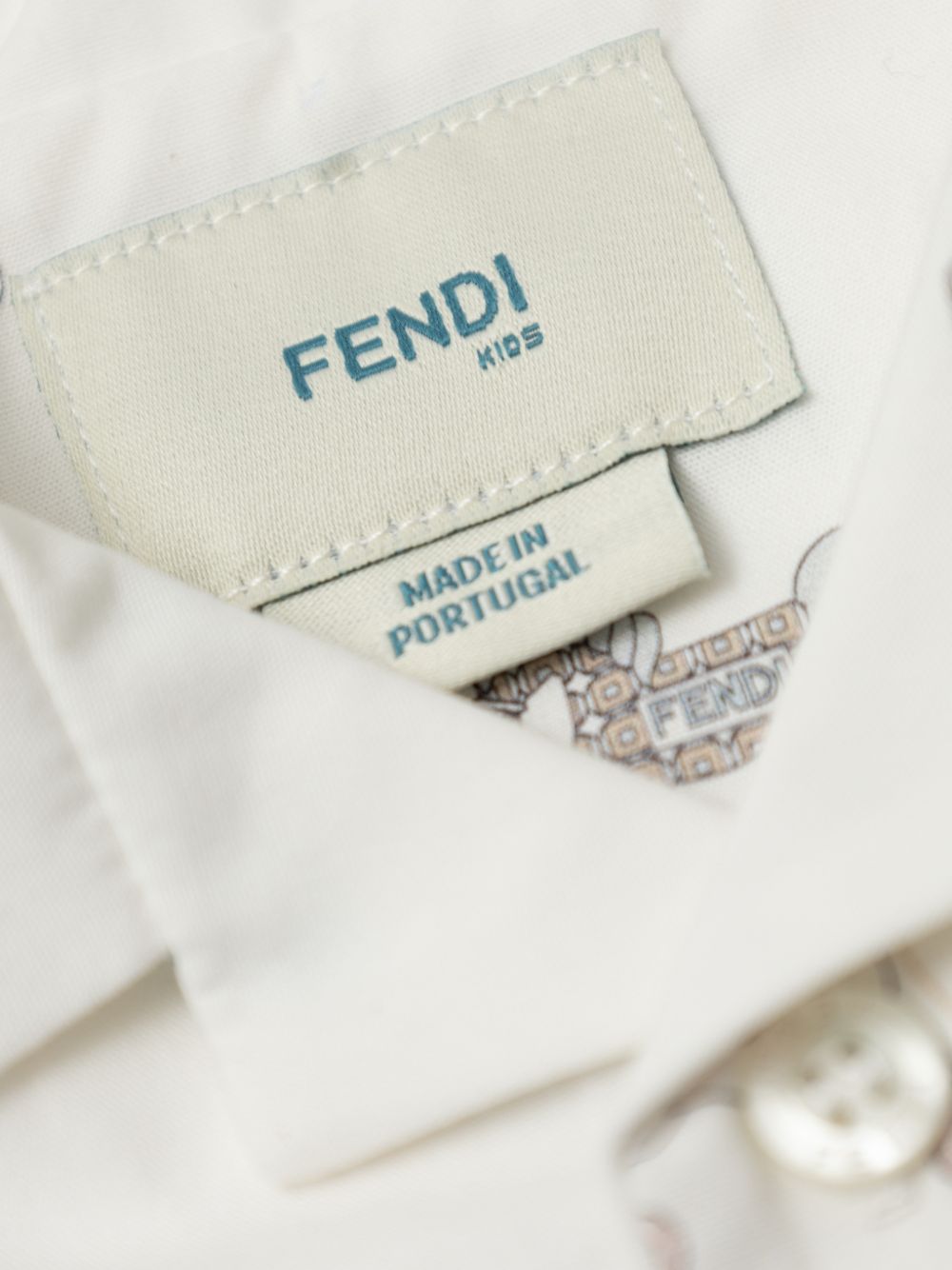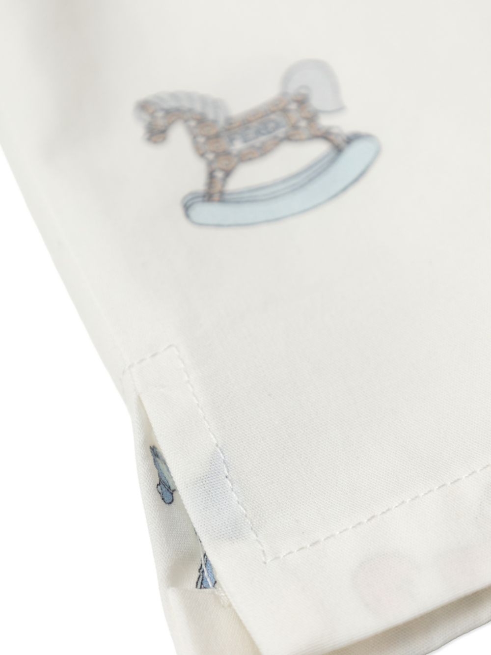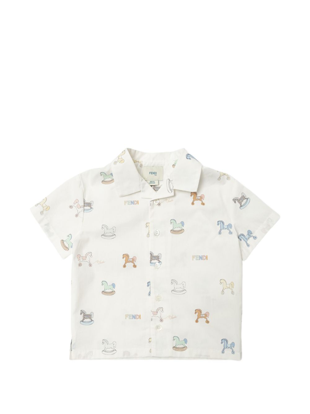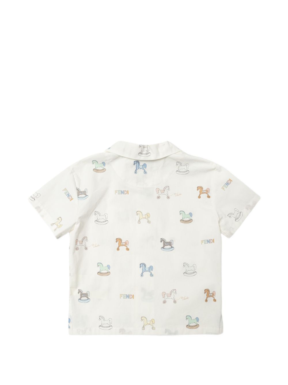 stampa cavallo a dondolo in cotone bianco, maniche corte, chiusura con bottoni, colletto stile campeggio