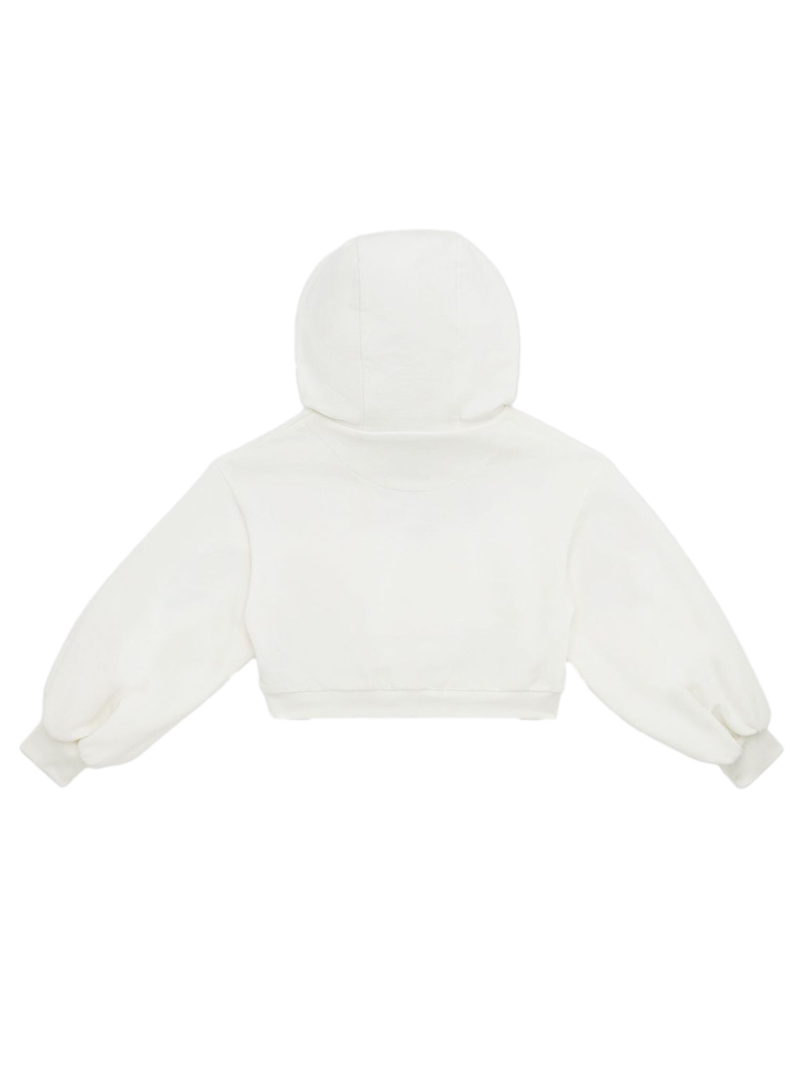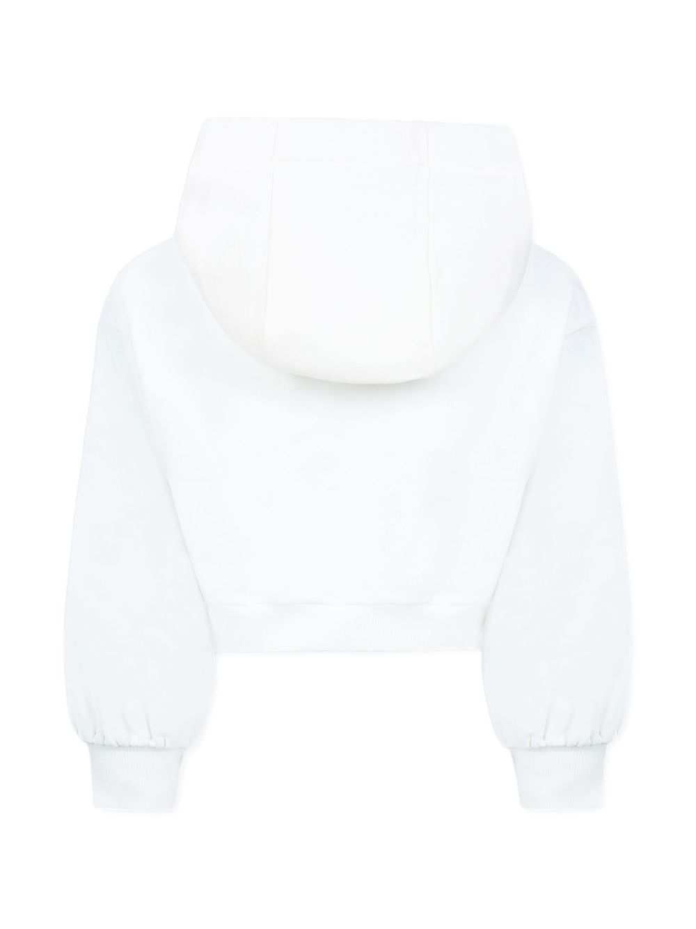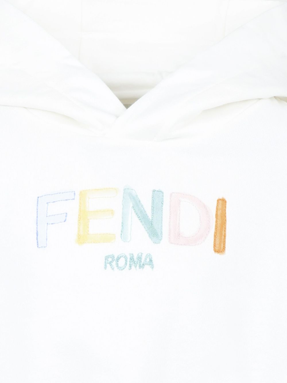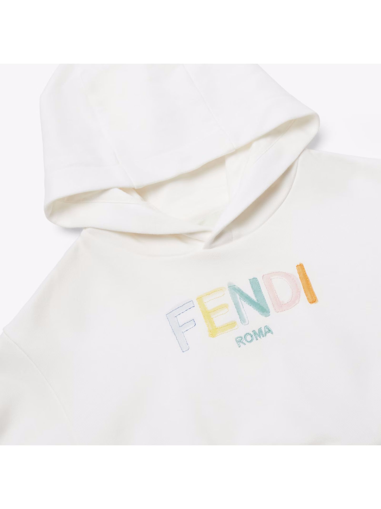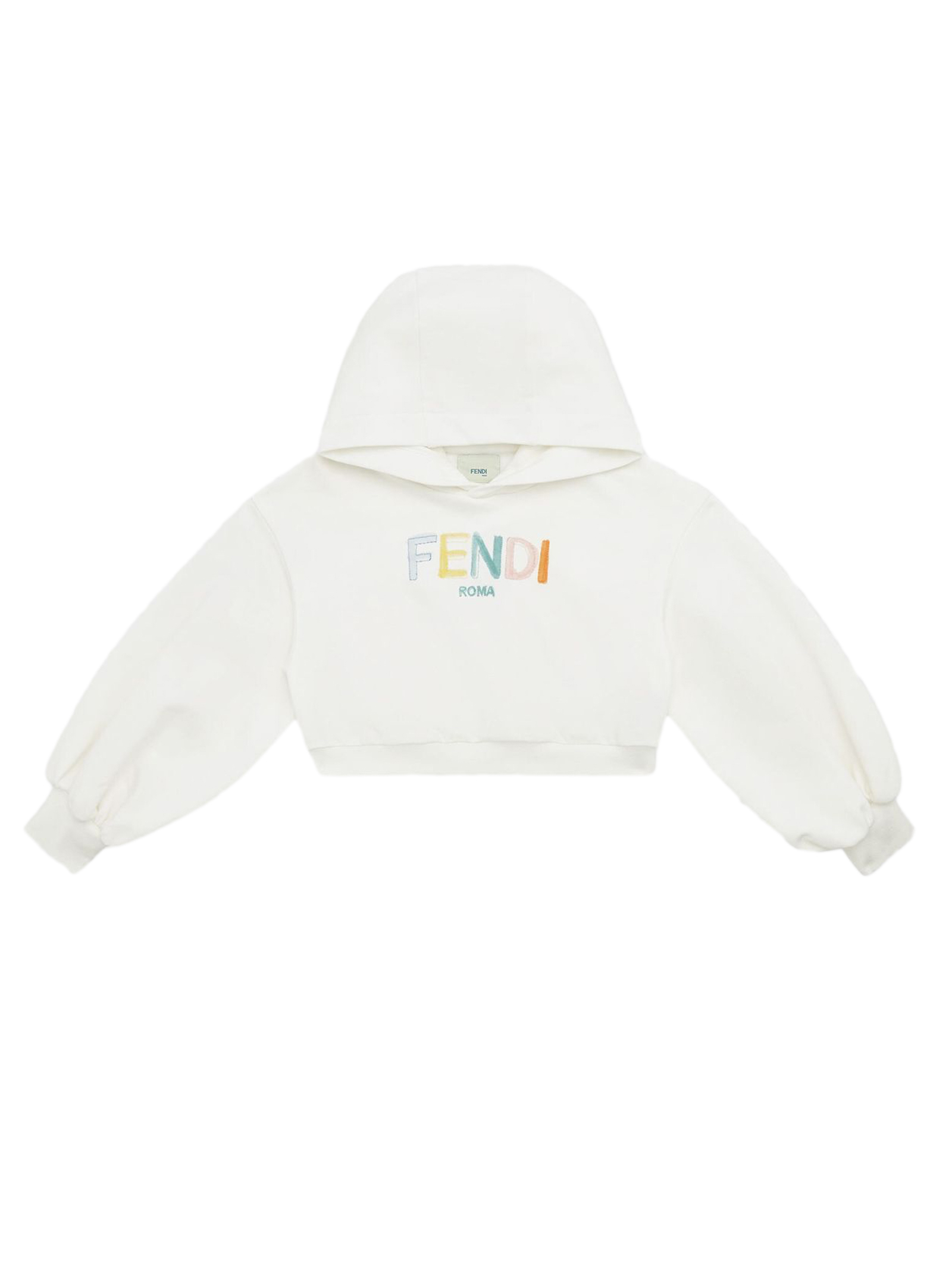 Felpa cropped junior bianca con cappuccio e ricamo Fendi multicolore sul davanti, maniche lunghe, bordi a coste