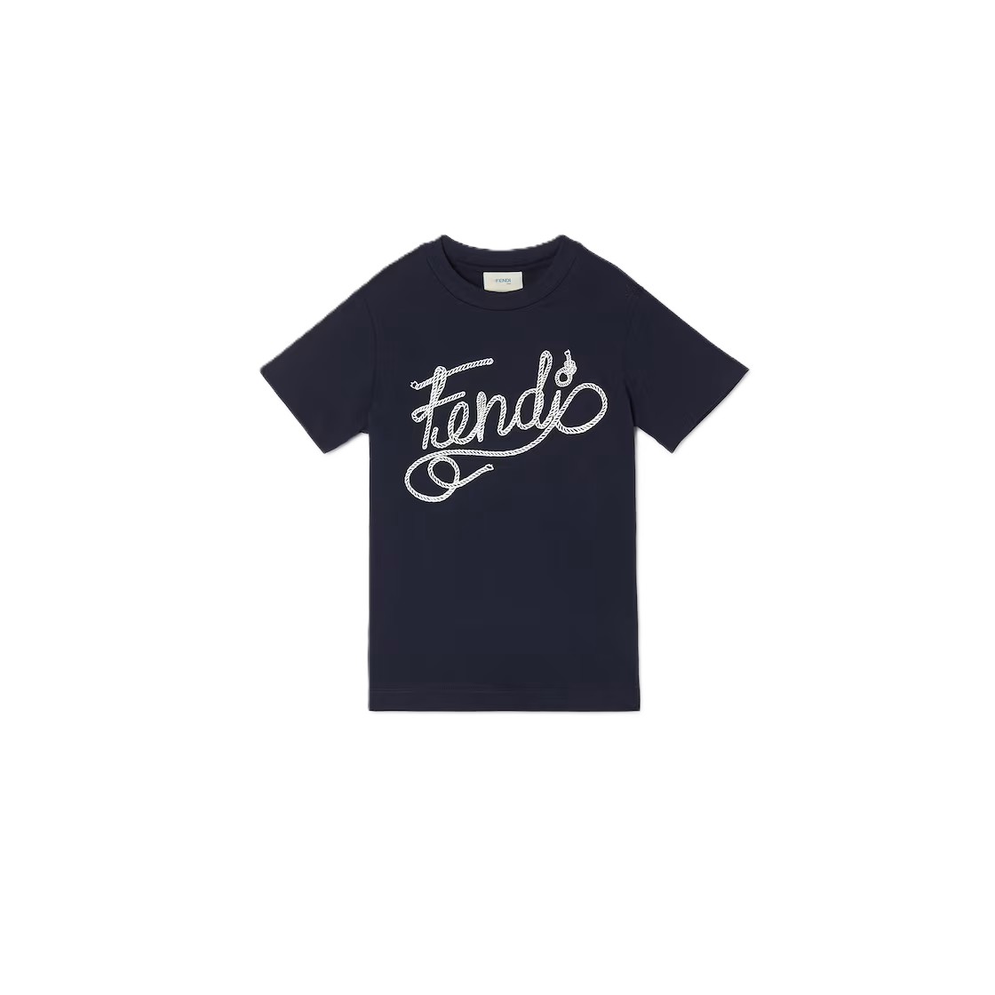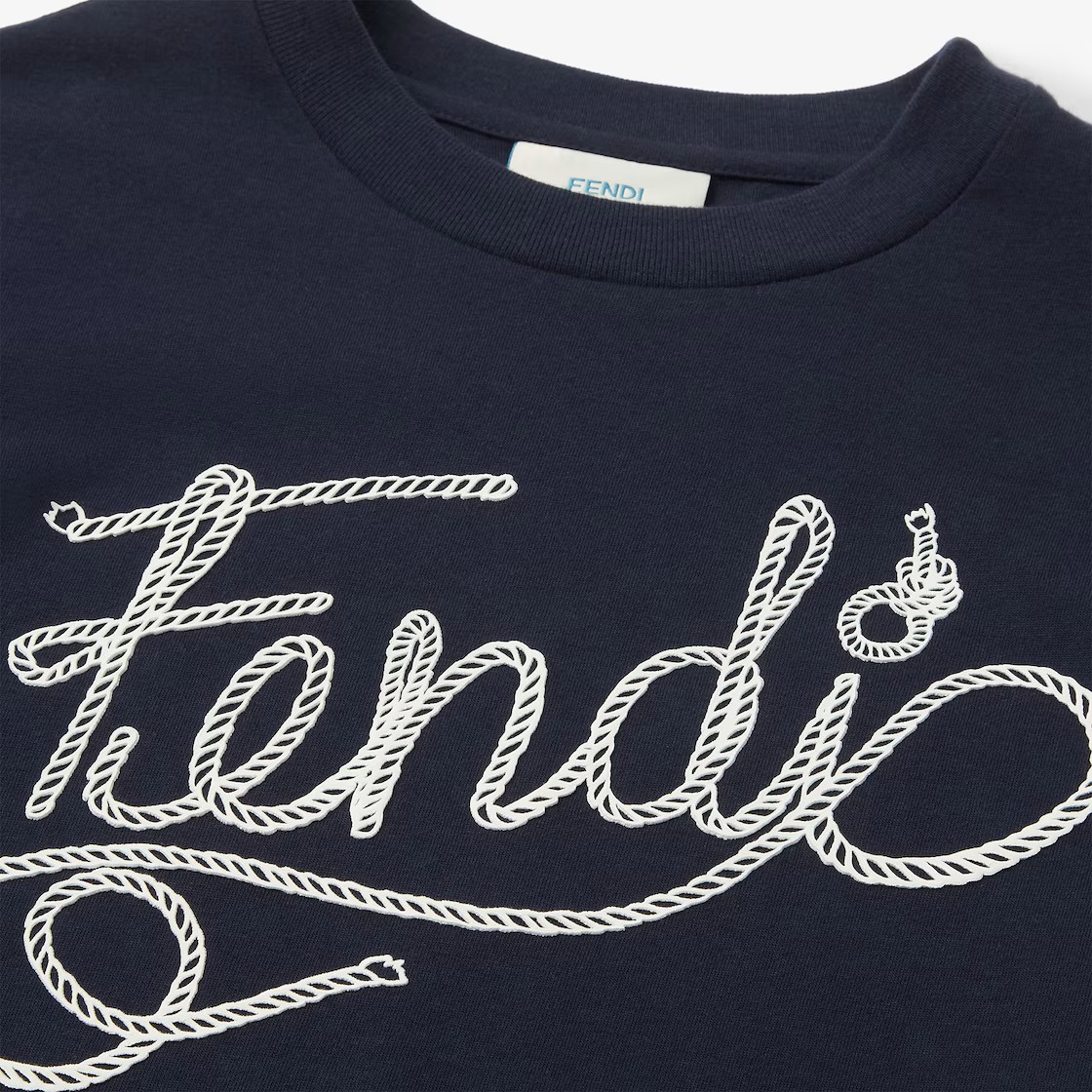 T-shirt junior in jersey blue navy con stampa Fendi corda bianca sul davanti.