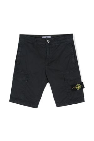 Bermuda in denim blu effetto délavé, nastro Web rosso e verde, passanti per cintura, tasche, chiusura con bottone e cerniera