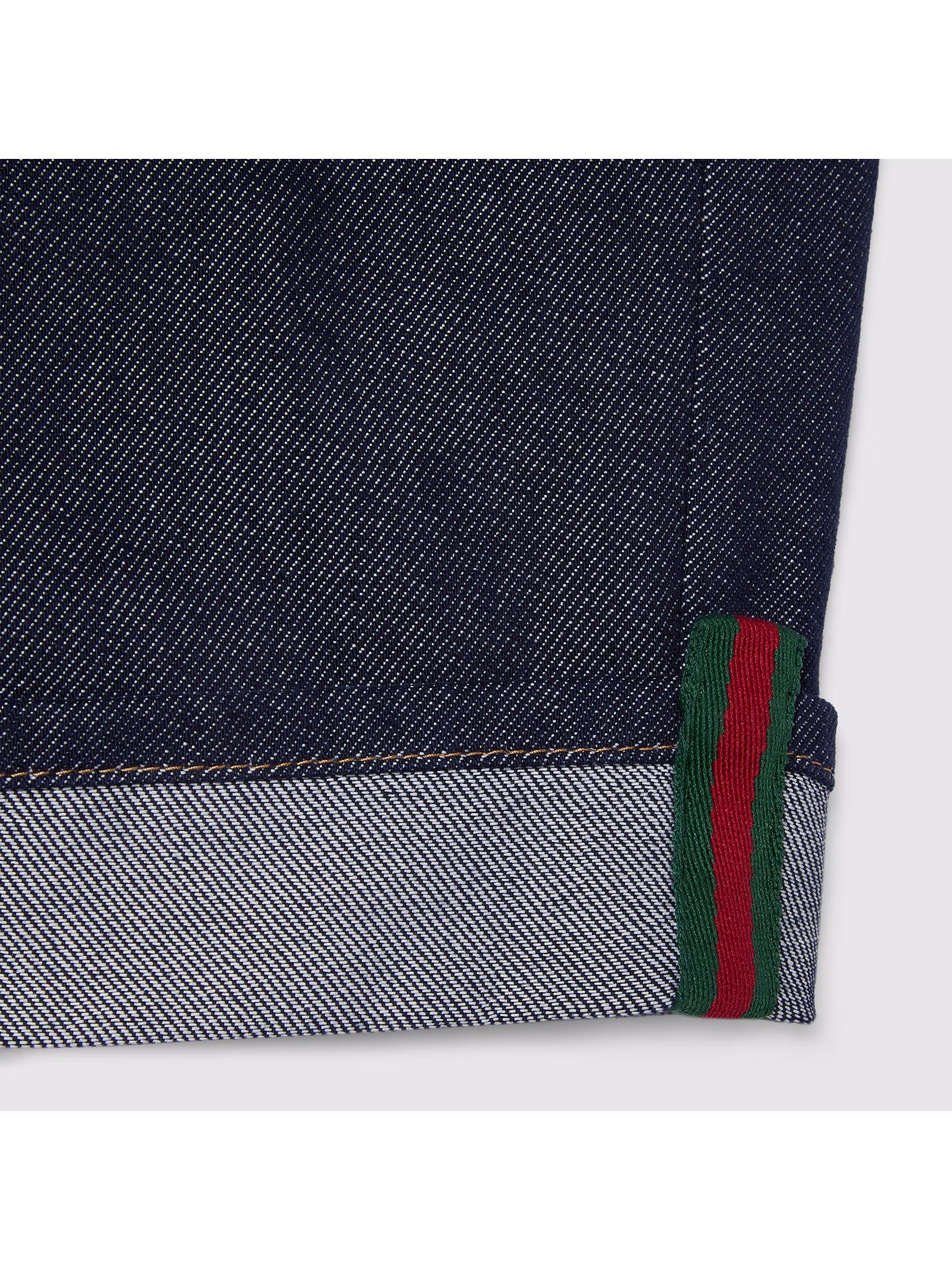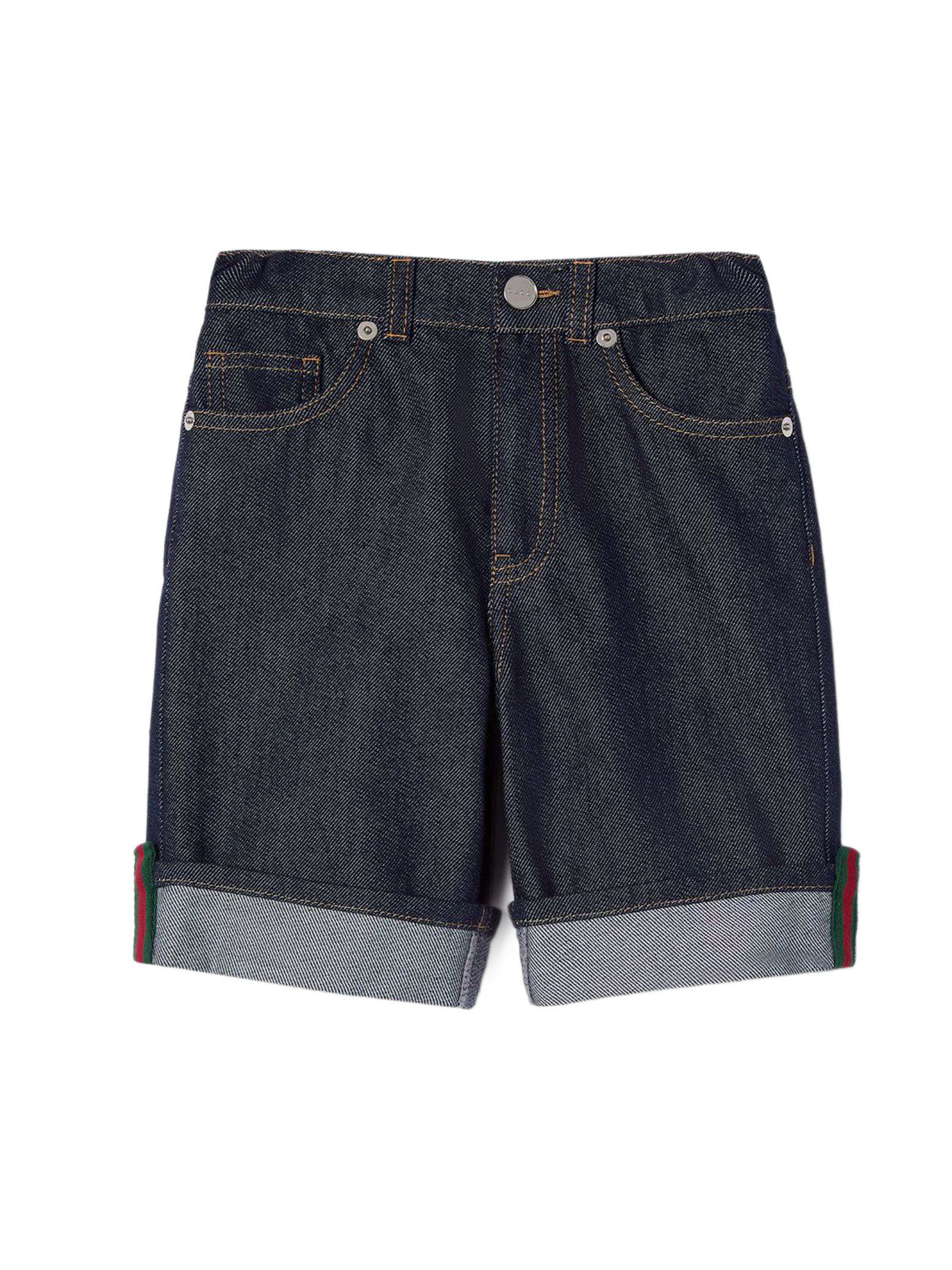 Shorts bambino in denim con nastro Web, Denim blu scuro, Bottoni in metallo Gucci, Passanti per la cintura, Costruzione con cinque tasche, Orlo con risvolto con dettaglio Web, Chiusura con bottone e zip