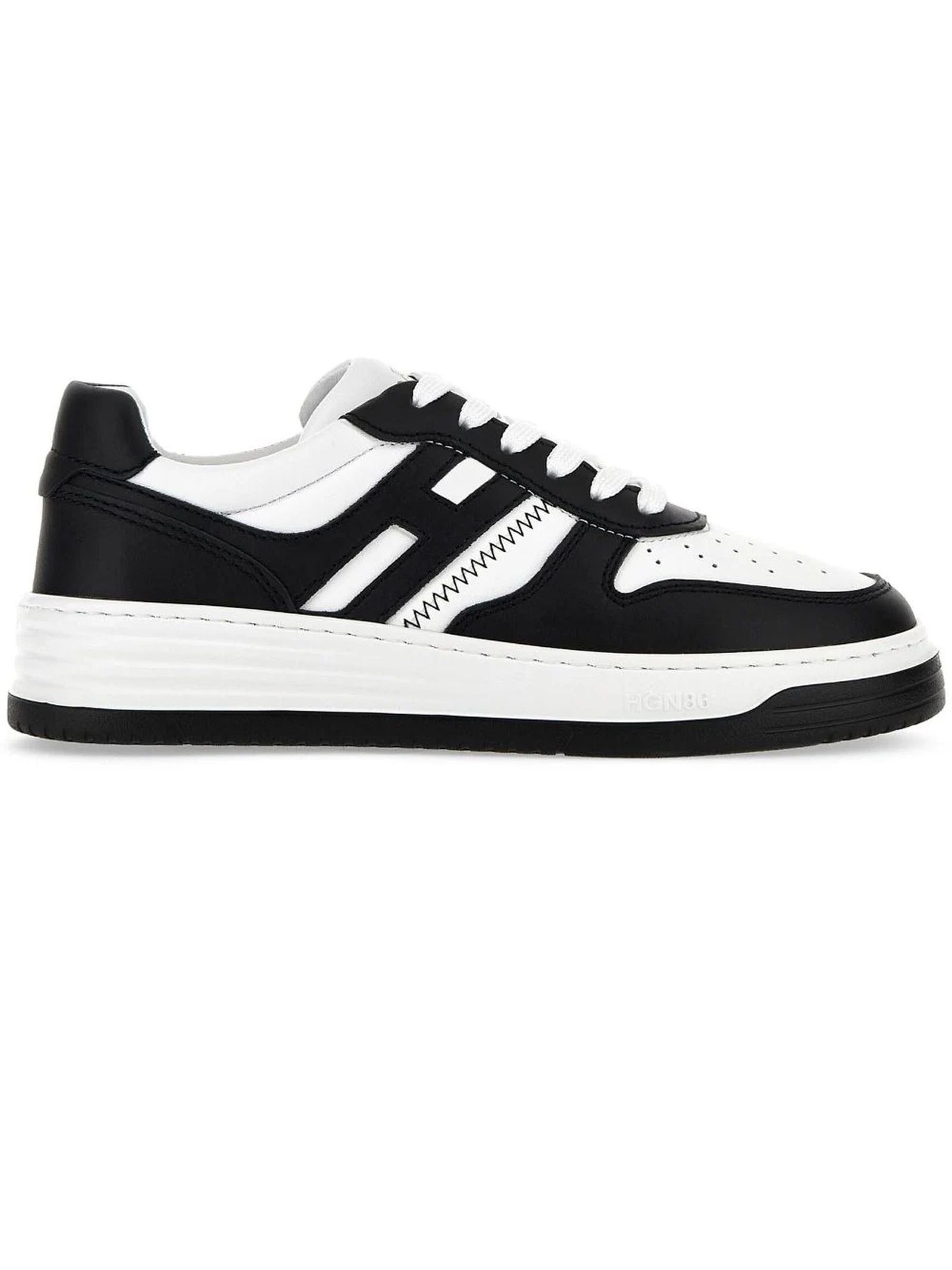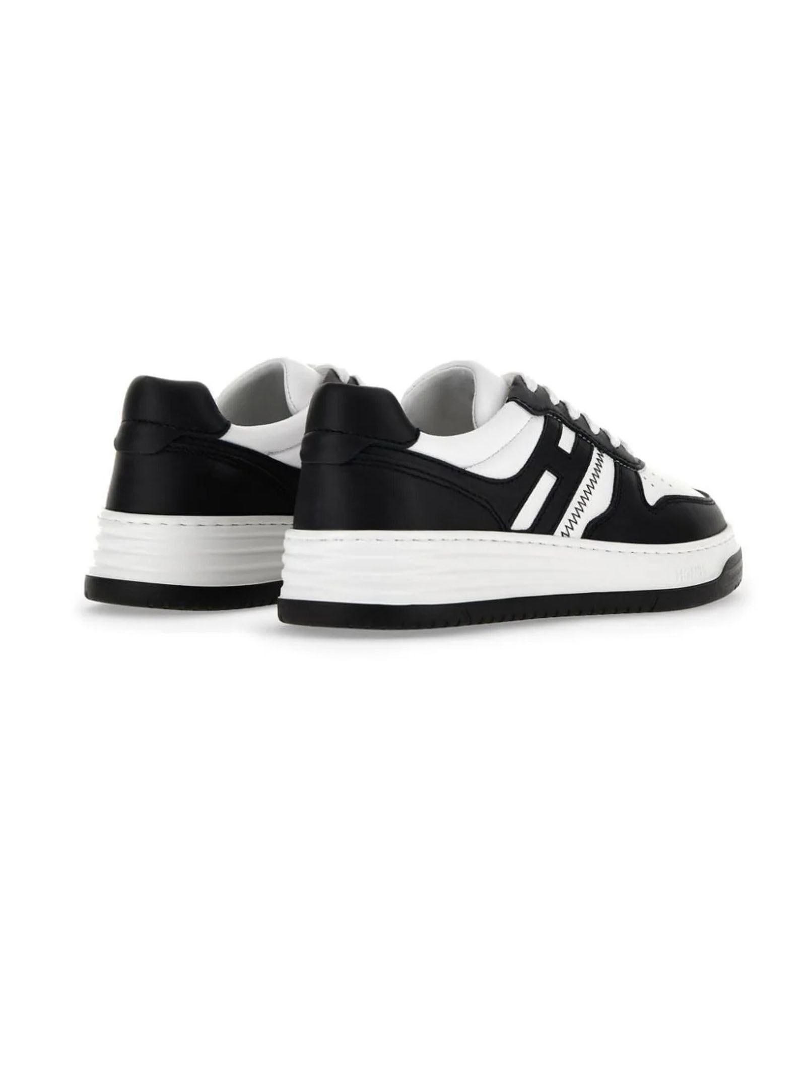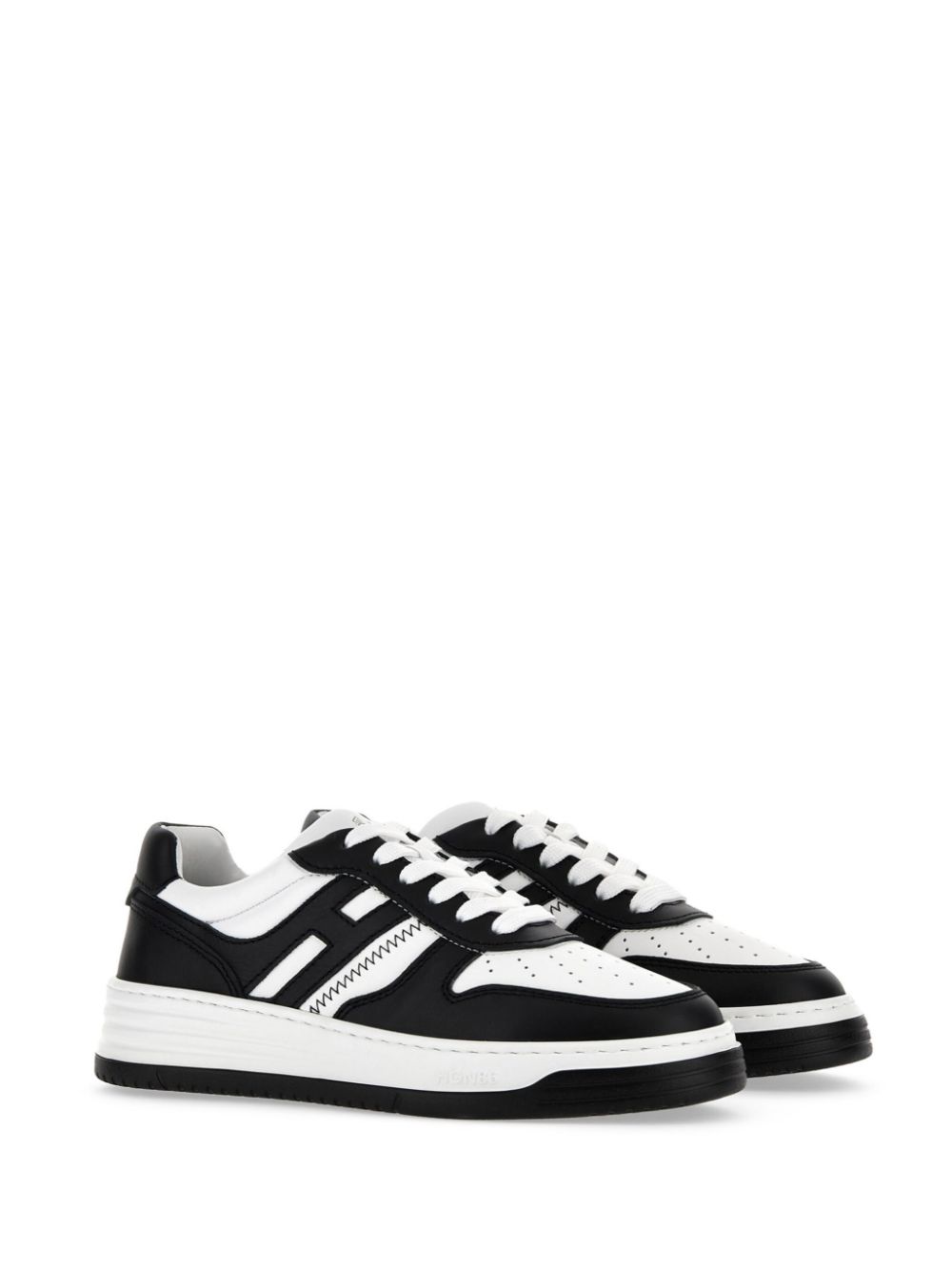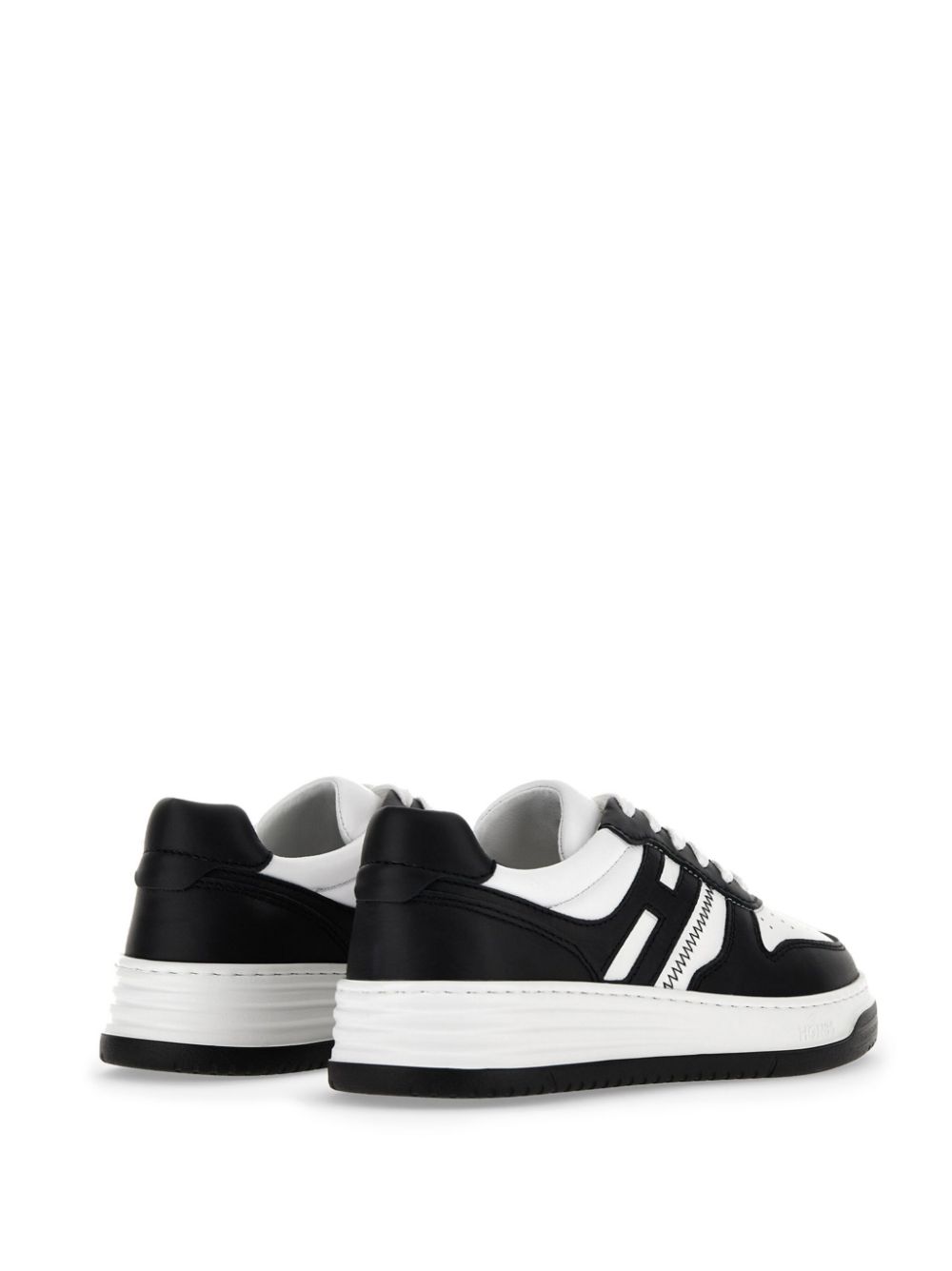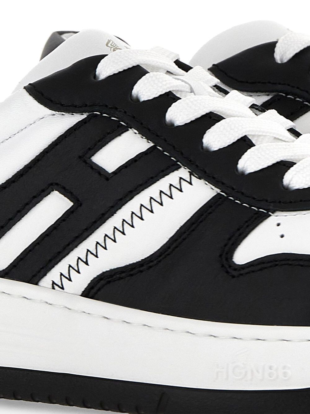 Hogan h630 bianco e nero, pelle di vitello, nappa, design a inserti, applicazione laterale con logo, linguetta con logo stampato, cuciture decorativa, punta tonda, chiusura frontale con lacci, soletta con memory foam, suola piatta in gomma
