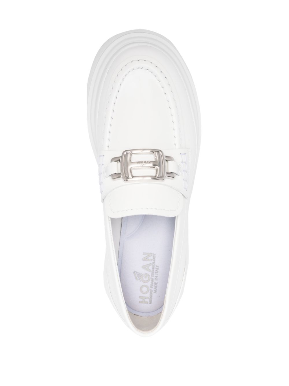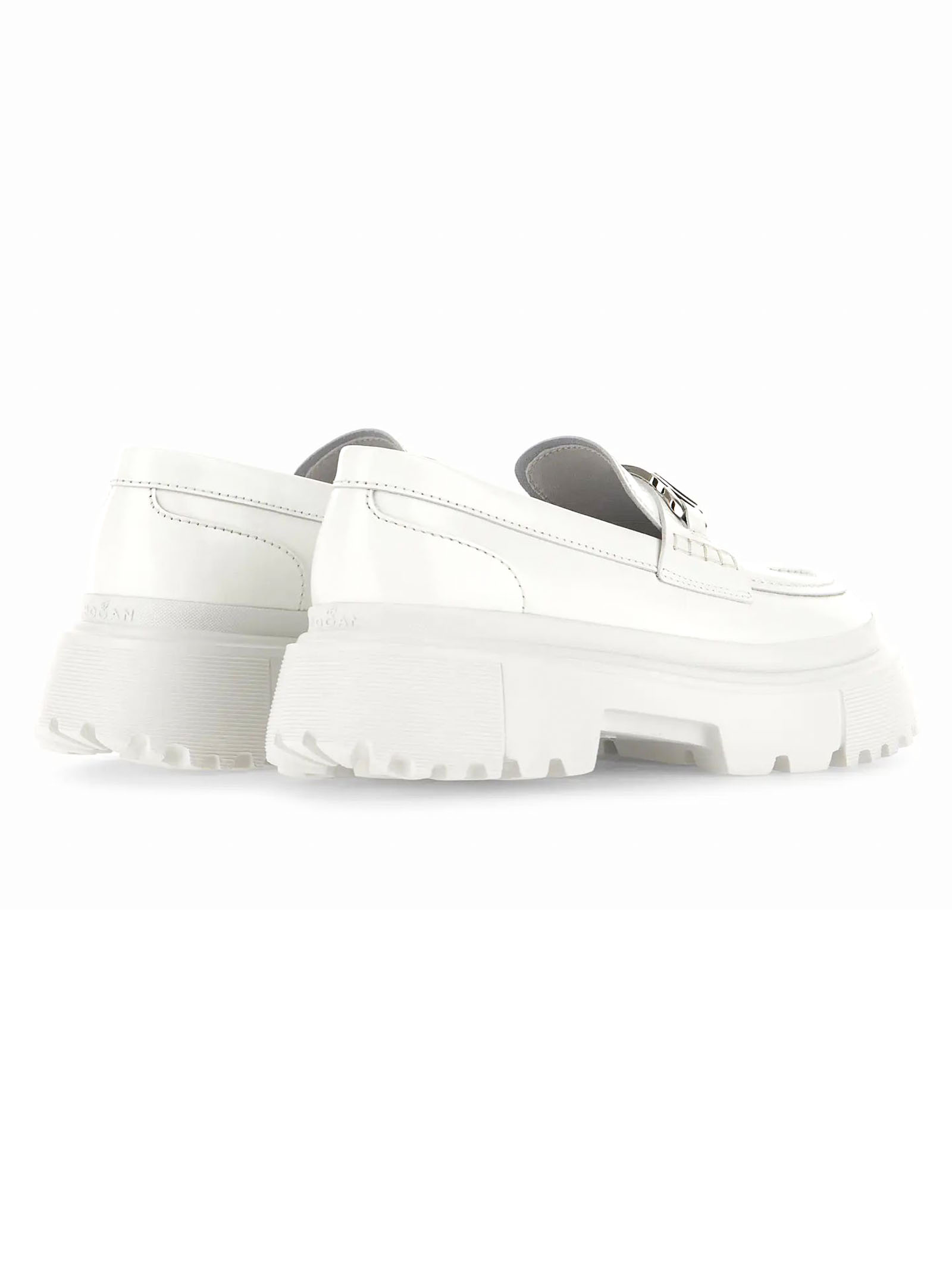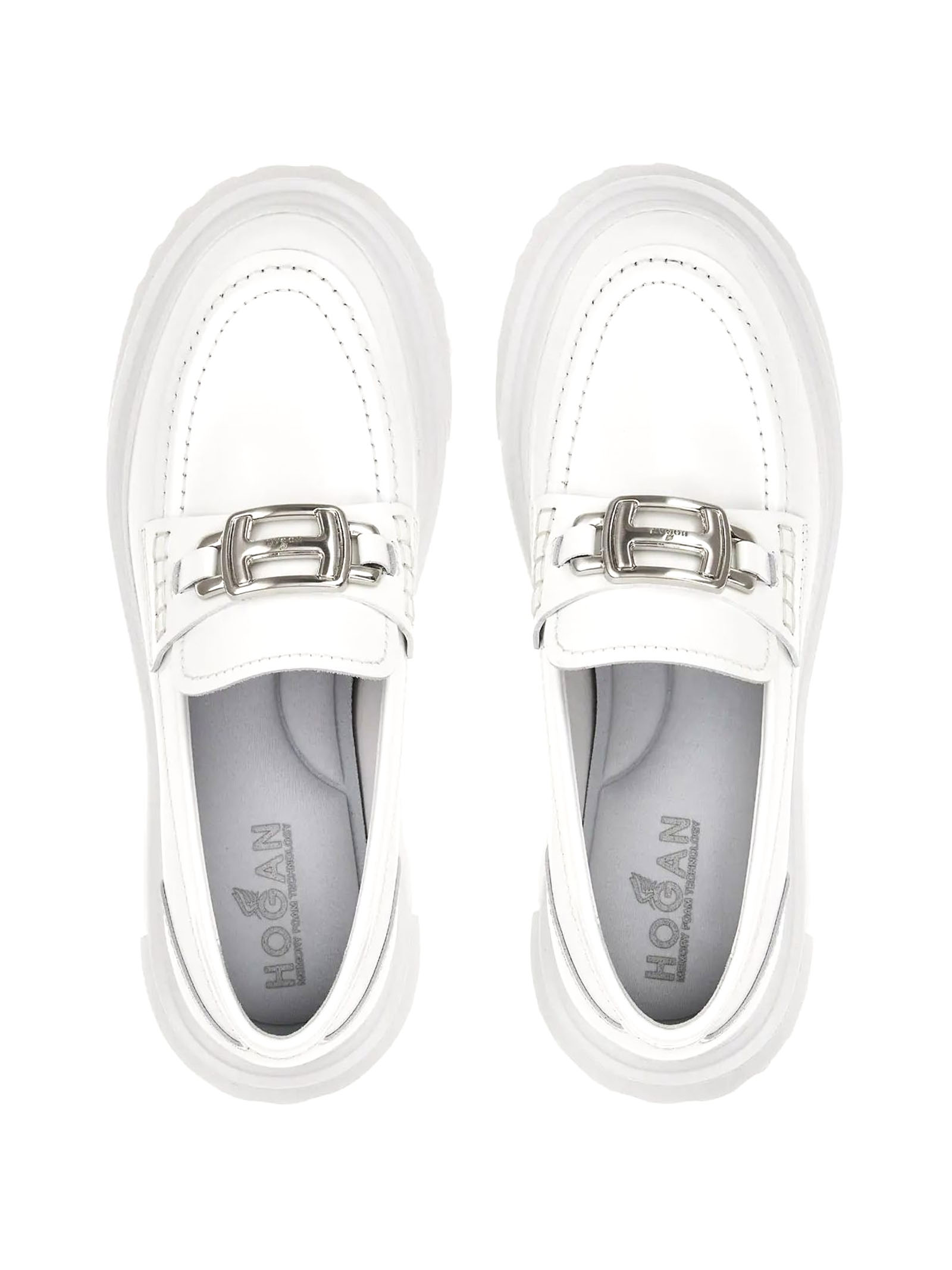 Mocassino H629 bianco, tomaia in pelle abrasivata, mascherina, accessorio H in metallo personalizzato, impunture a vista, Fussbett in memory foam 5 mm, suola in EVA, altezza totale 5 cm